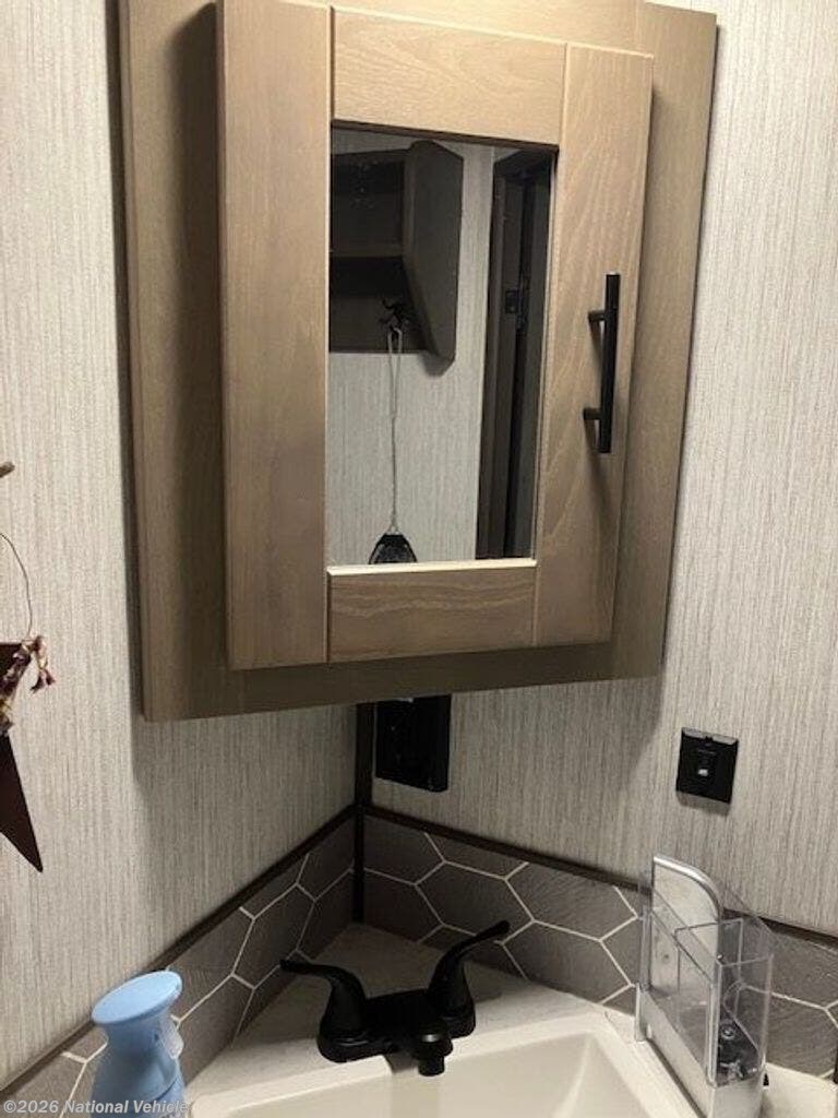 Inside, the layout is designed with both family comfort and functionality in mind. The private front queen bedroom offers a restful retreat with dual entry doors for added convenience, while the rear bunkhouse comfortably sleeps additional guests. The convertible dinette provides extra sleeping space when needed, making this unit capable of accommodating up to 8. The fully equipped kitchen features a deep residential-style sink, ample counter space, a 10 cu. ft. refrigerator, and a full cooktop and oven, all complemented by modern cabinetry and LED lighting throughout.