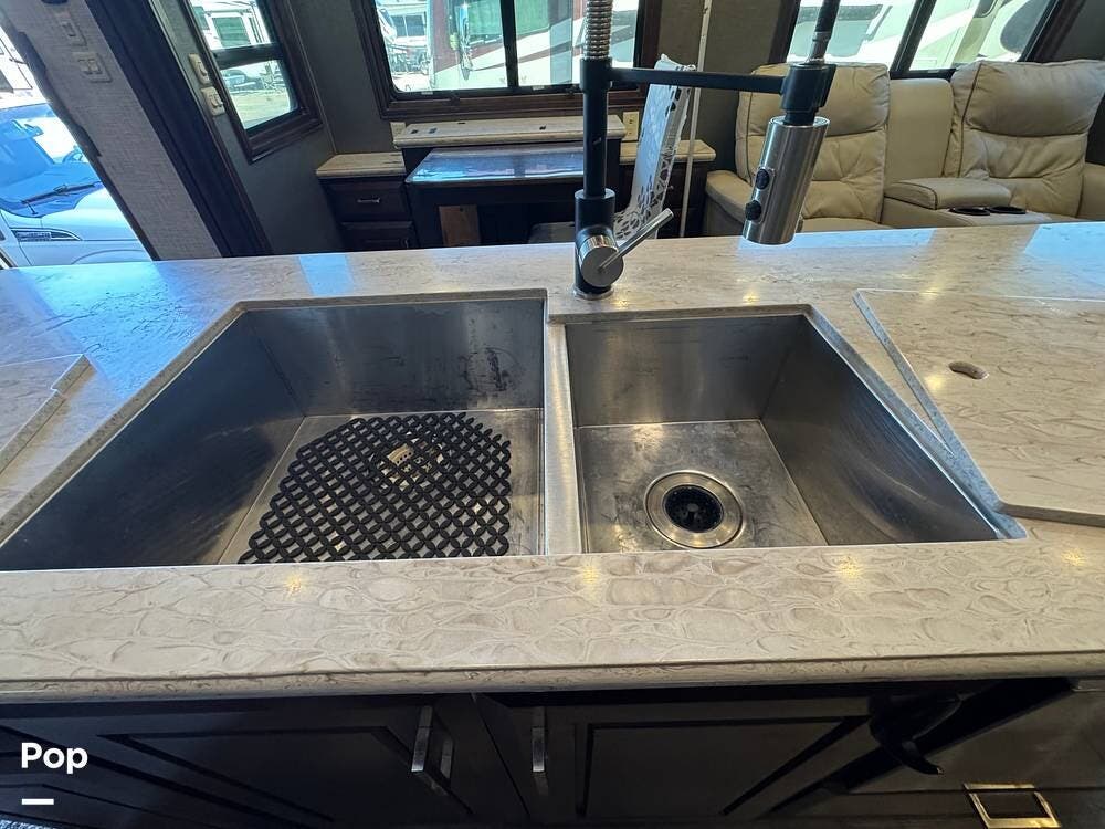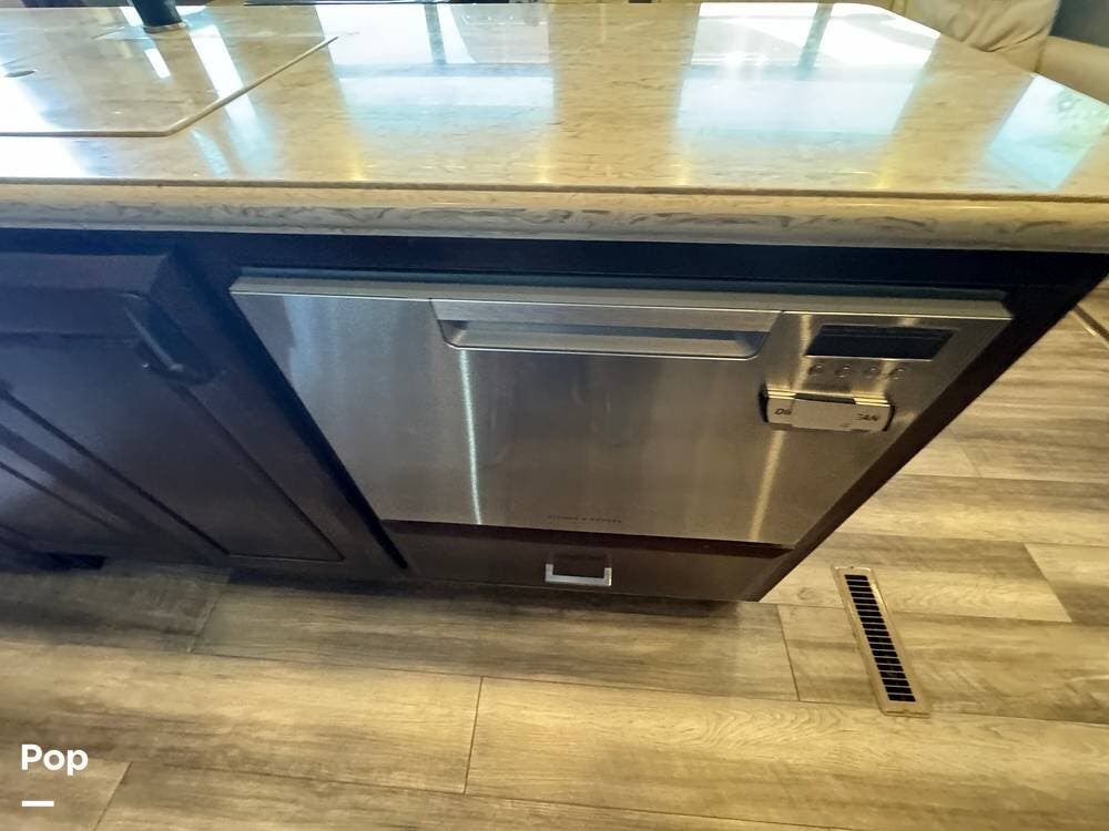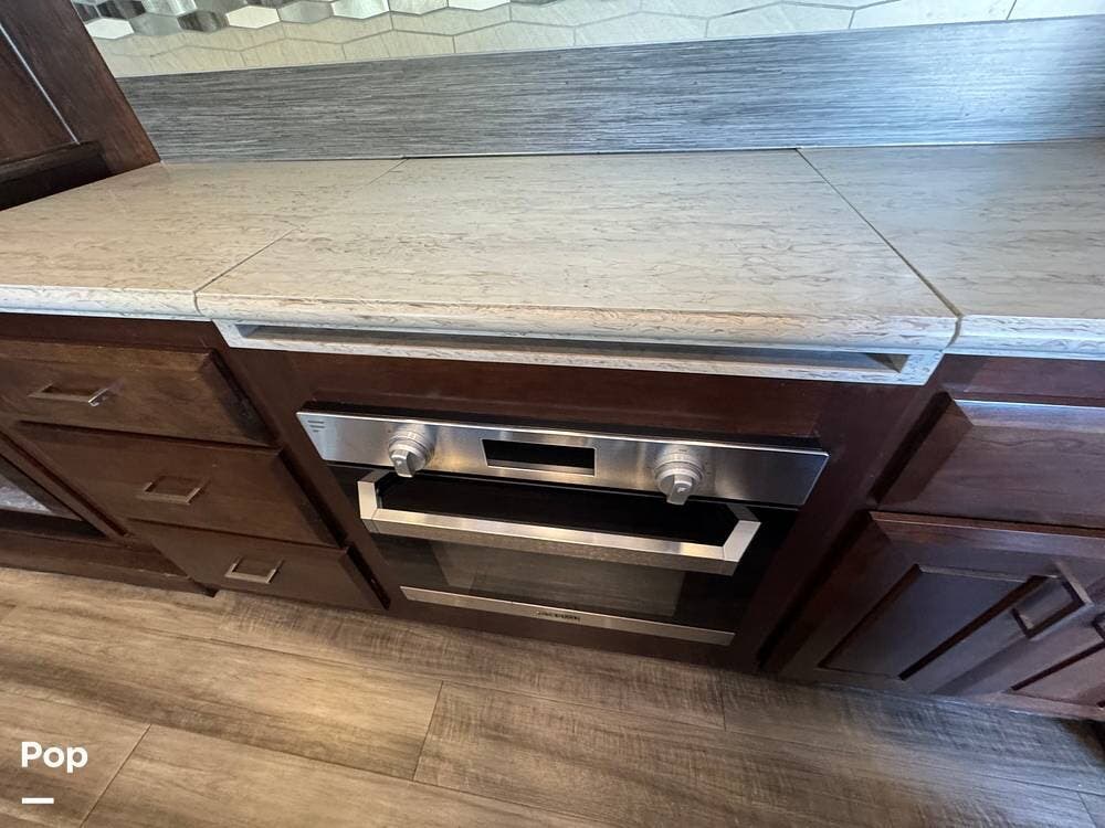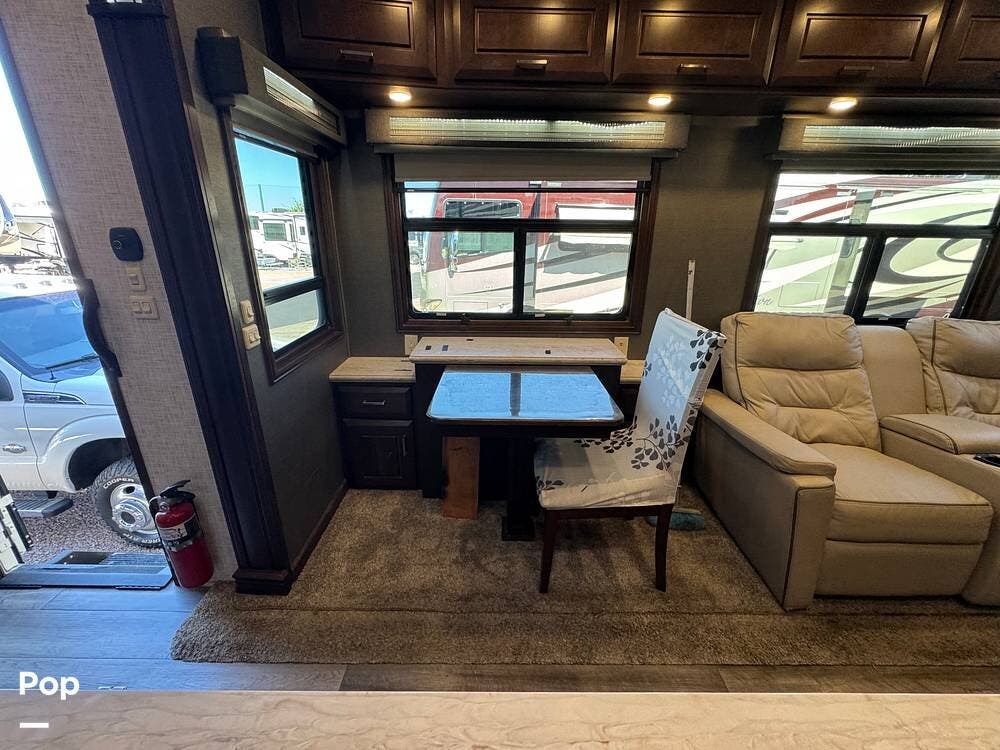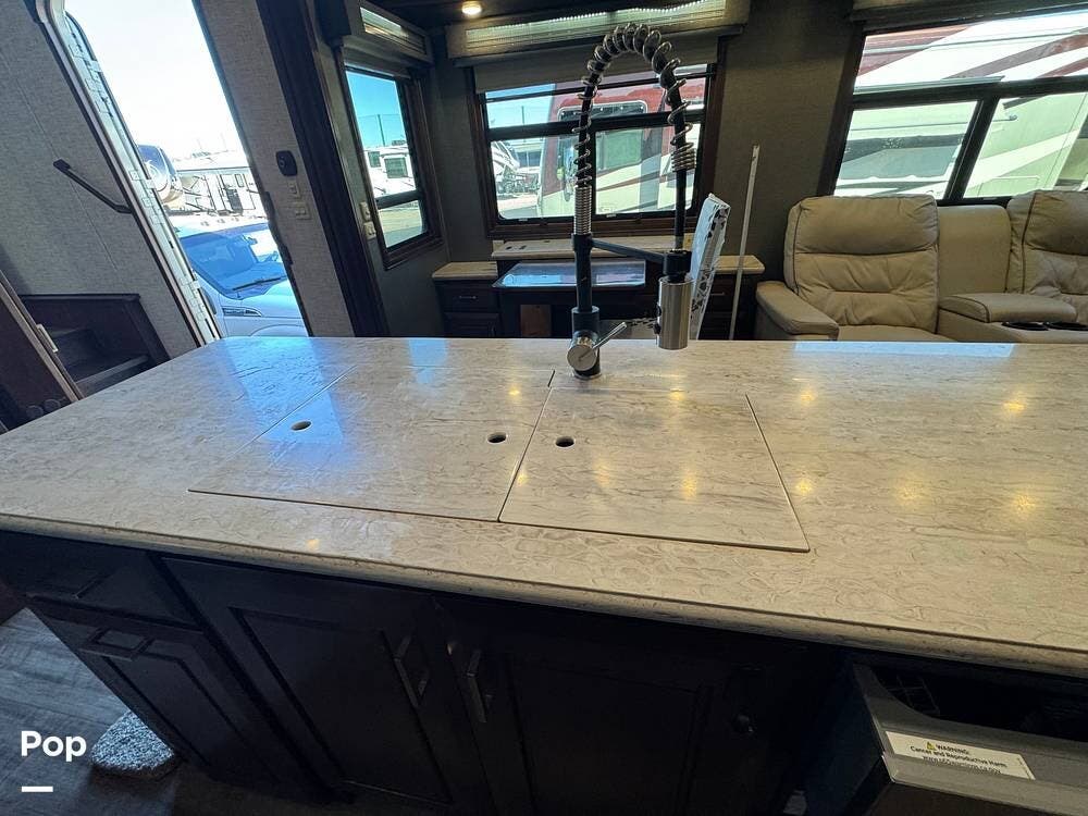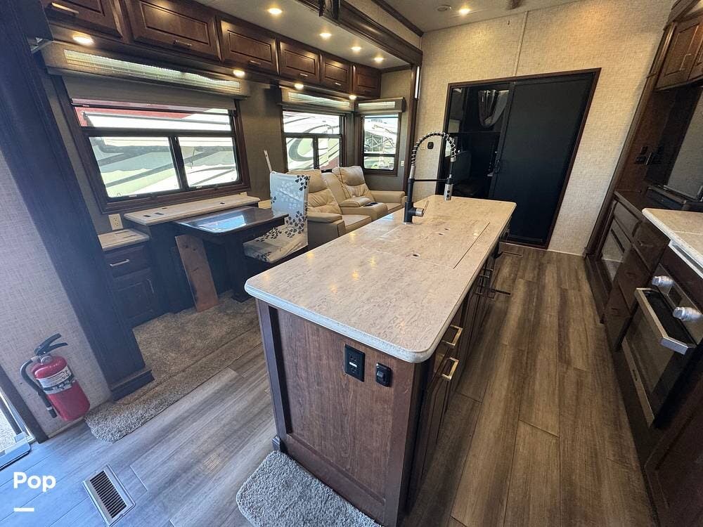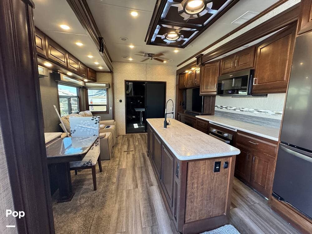 The living room flows seamlessly into the fully equipped kitchen, which features residential-style appliances, including a dishwasher, solid-surface countertops, a large refrigerator, a microwave, an oven, and a spacious pantry. A freestanding dinette provides a comfortable place for meals or remote work while on the road.