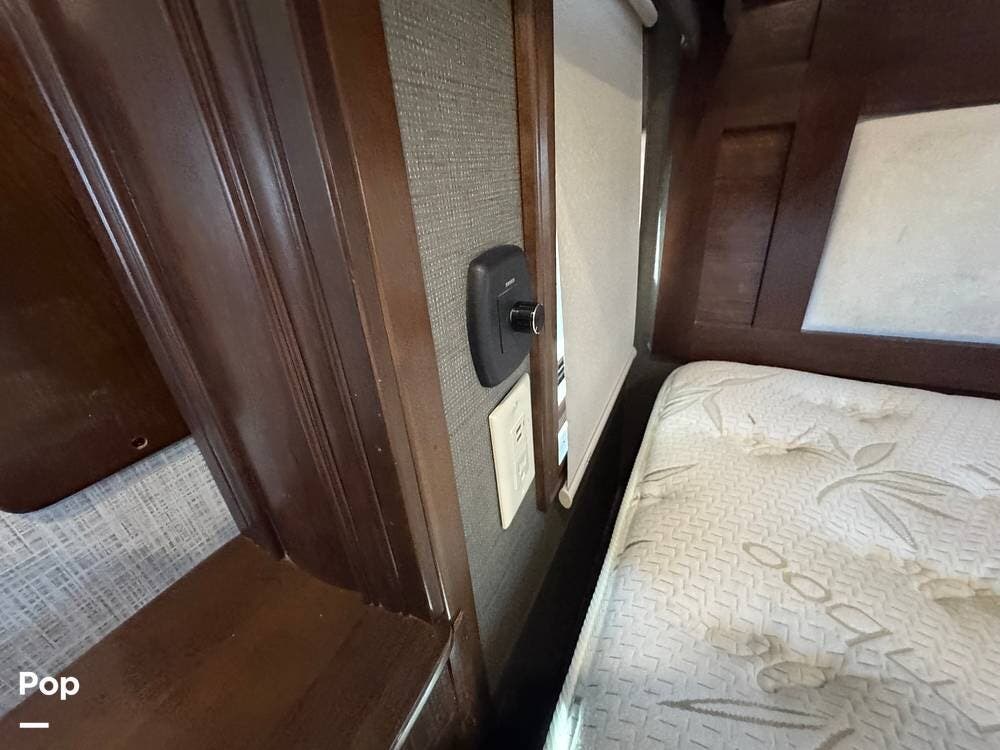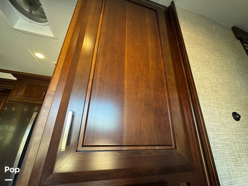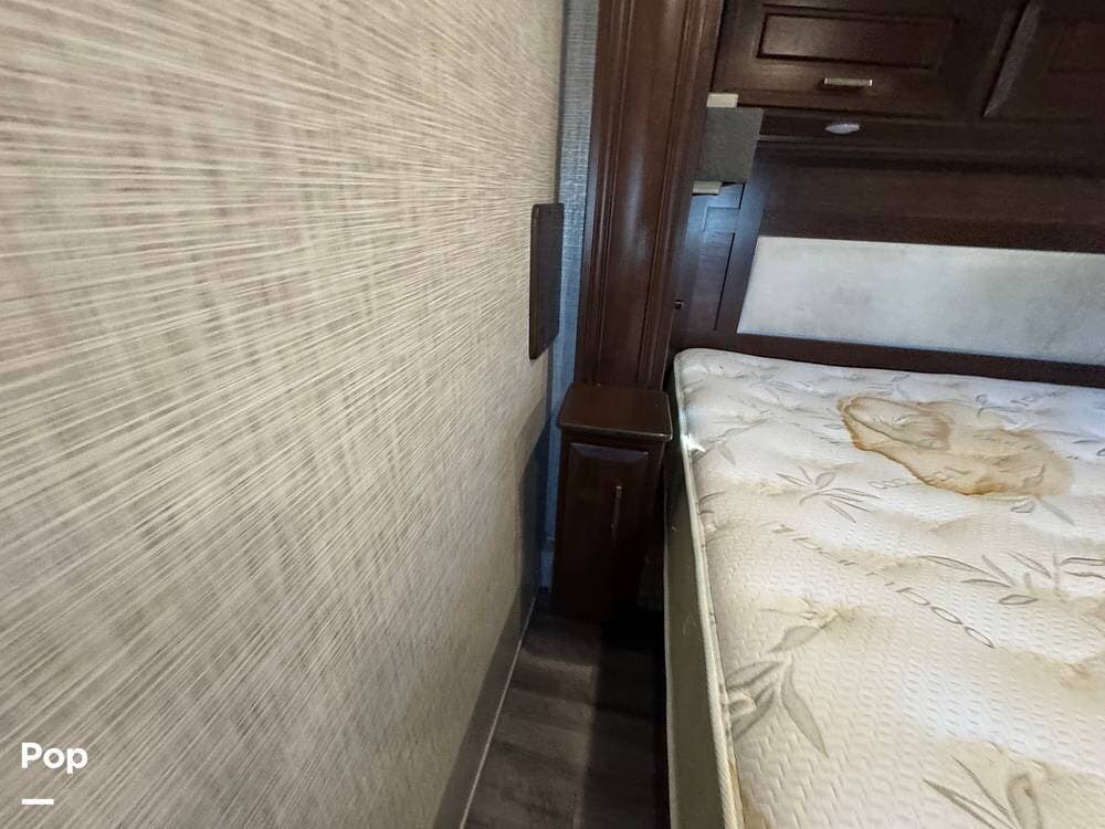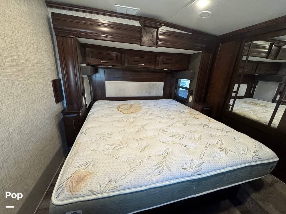 The front section of the coach is dedicated to a luxurious master suite, while the center living area features residential-style furnishings, large slide-outs, and high-end finishes, creating an open, comfortable environment. Solid wood cabinetry, premium flooring, and elegant decor give the interior the feel of a high-end apartment rather than a typical RV.