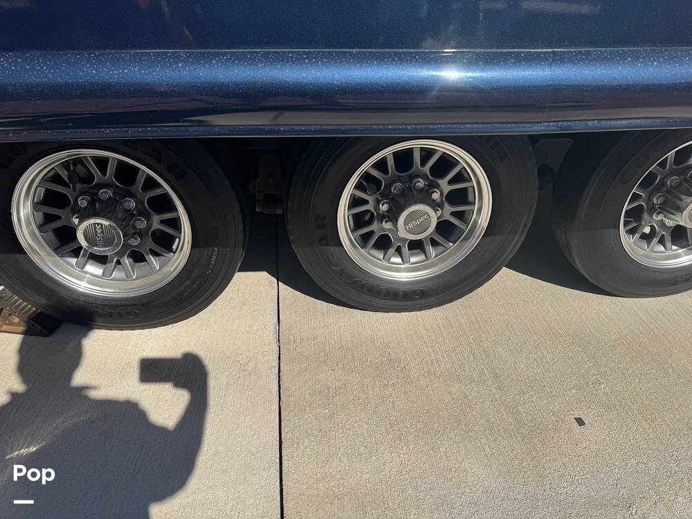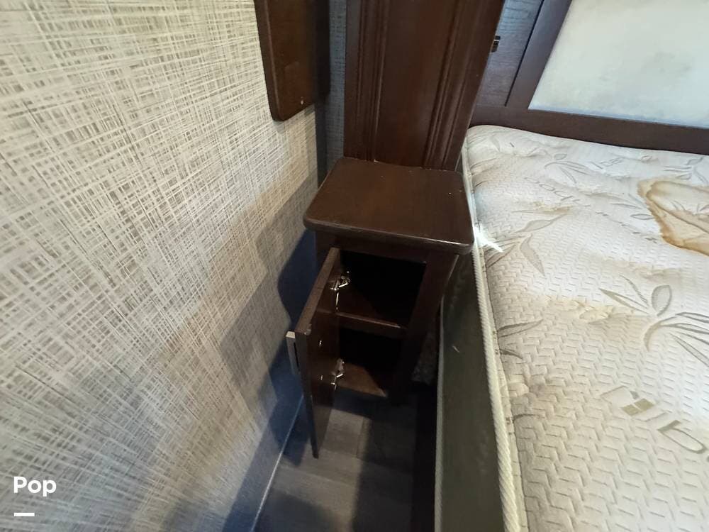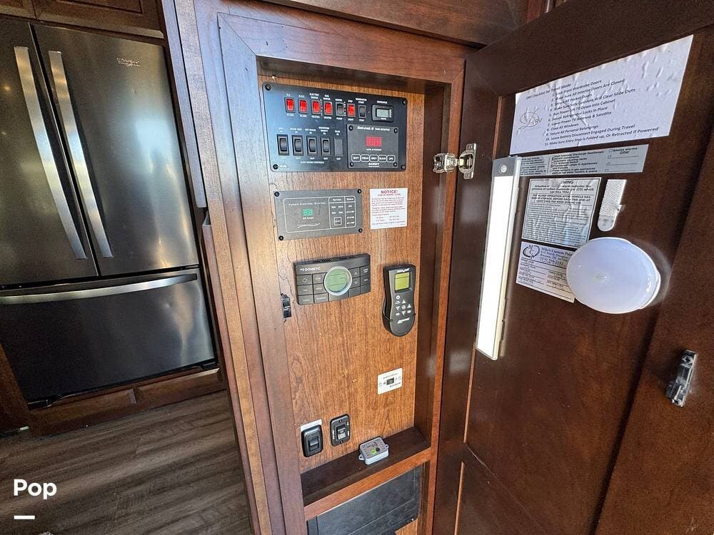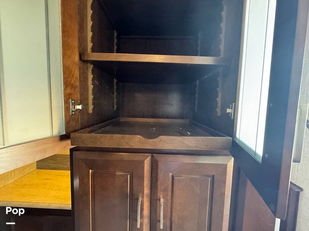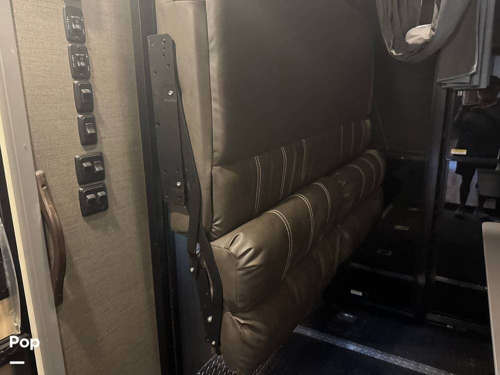 The front section of the coach is dedicated to a luxurious master suite, while the center living area features residential-style furnishings, large slide-outs, and high-end finishes, creating an open, comfortable environment. Solid wood cabinetry, premium flooring, and elegant decor give the interior the feel of a high-end apartment rather than a typical RV.