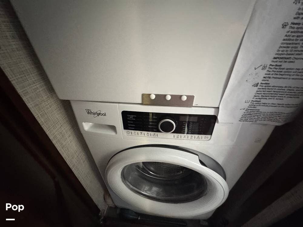 The master bedroom in the front of the coach offers a residential queen or king-size bed, wardrobe storage, and a stackable washer and dryer. Adjacent to the bedroom is a spacious bathroom with a large shower, vanity, and residential-style fixtures, providing the comfort and convenience expected in a luxury RV.
