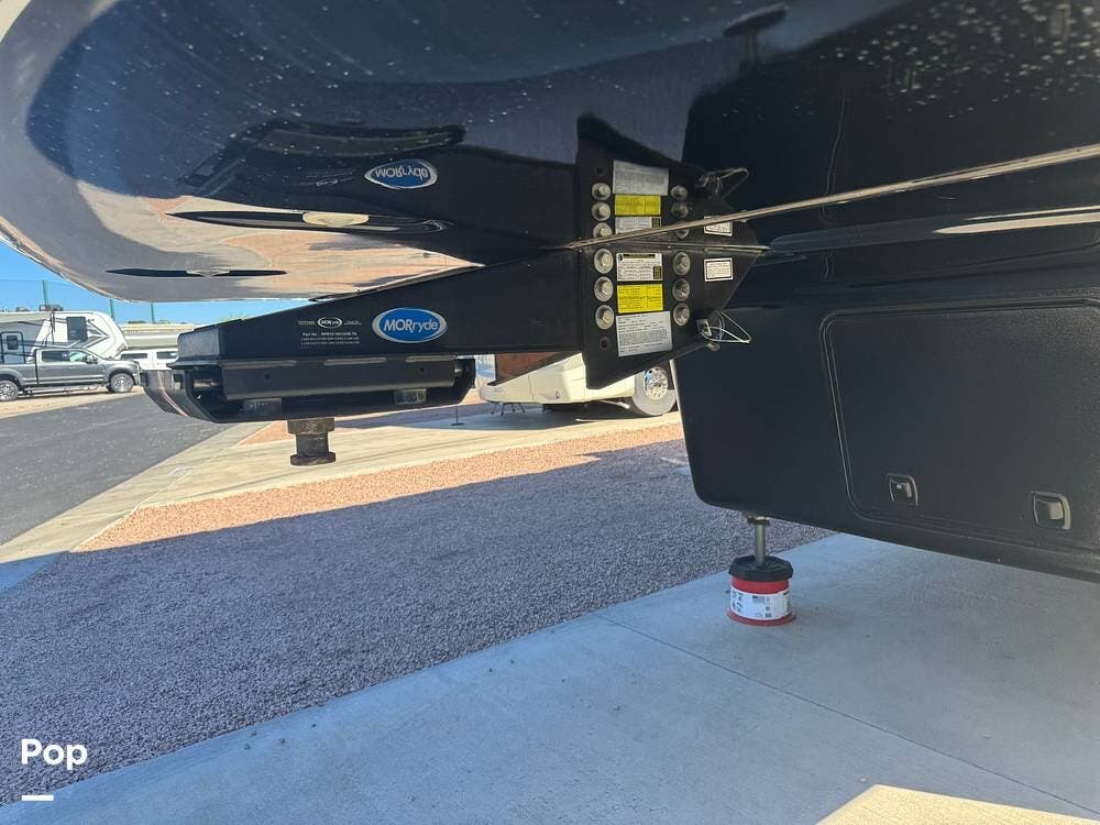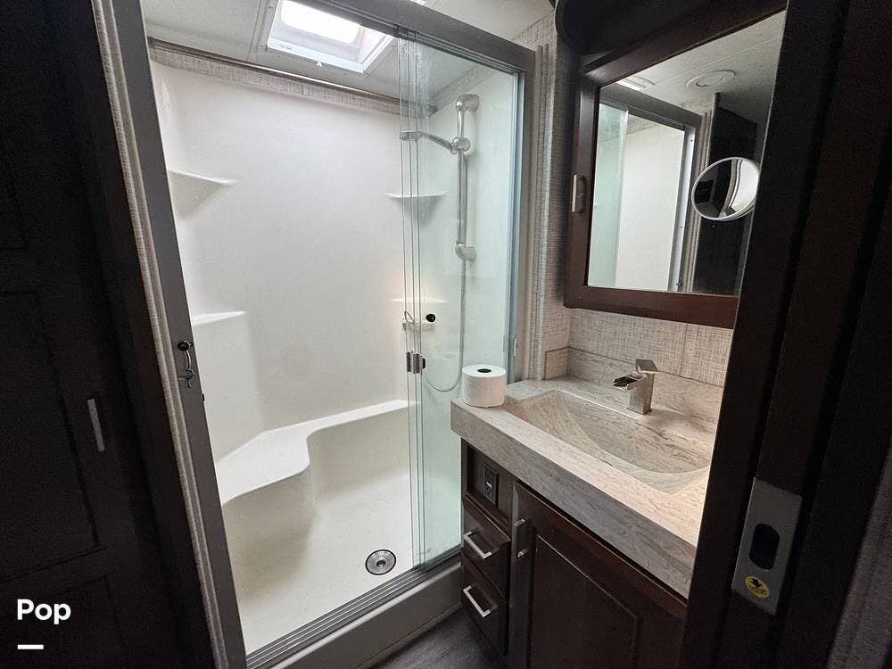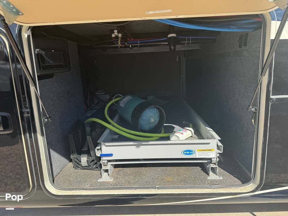Toward the rear of the coach is the toy hauler garage, designed to safely transport powersports equipment while also serving as a versatile living space when unloaded. The garage area typically includes tie-down systems, durable flooring, and a ramp door that can convert into a patio deck.