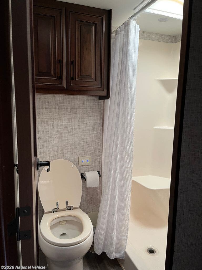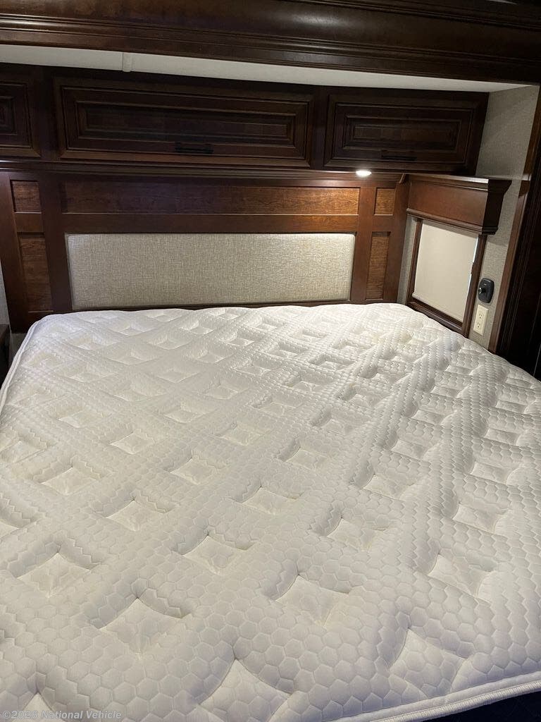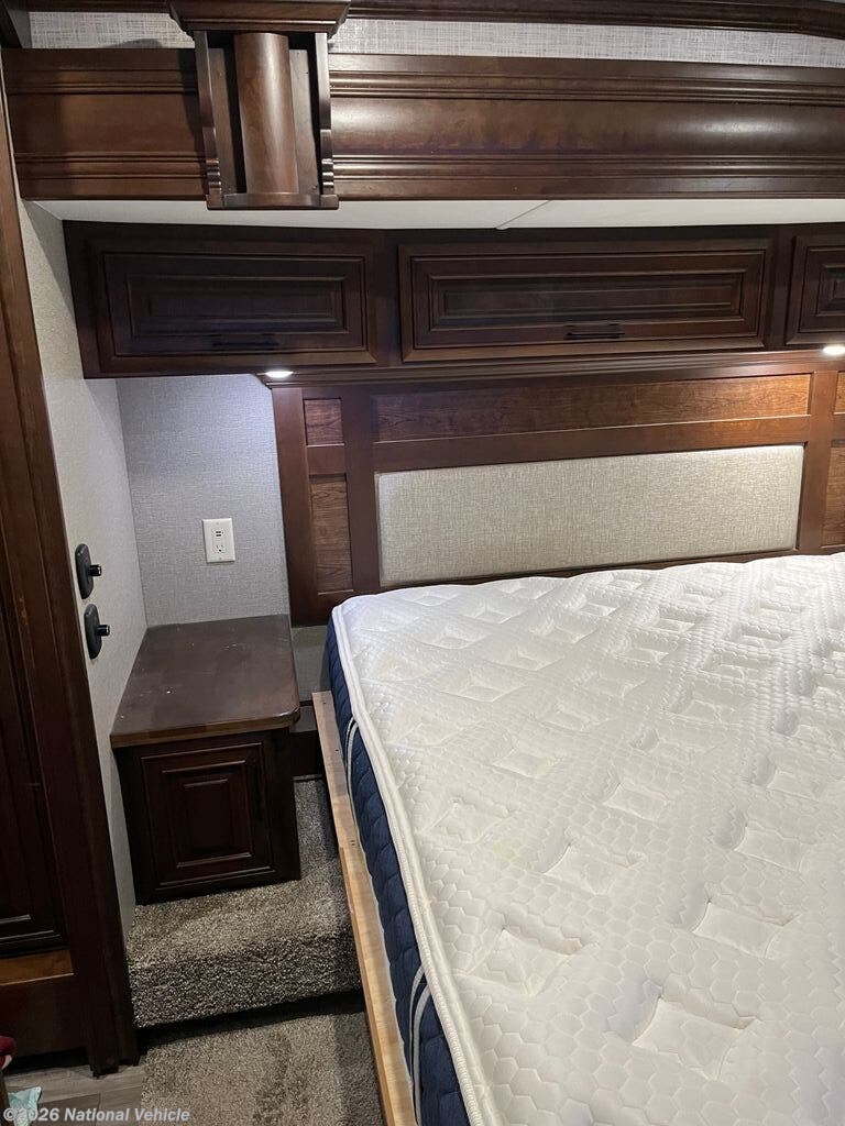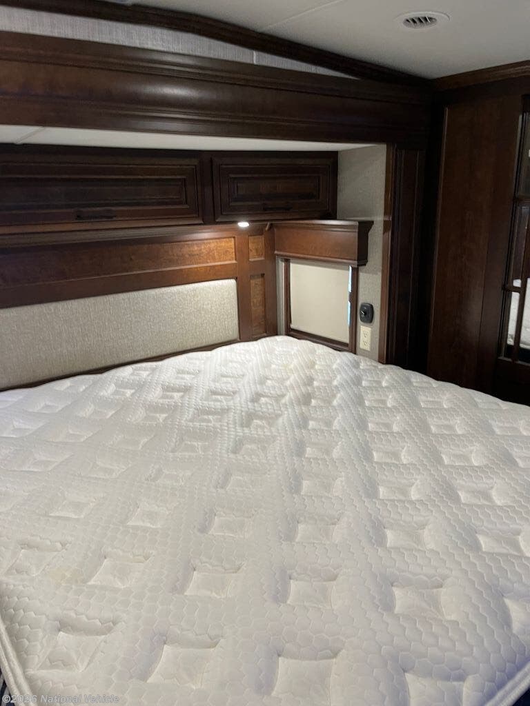 The bedroom features a brand-new RV king pillow-top mattress (never slept on) with mattress cover included, ensuring exceptional comfort from day one.