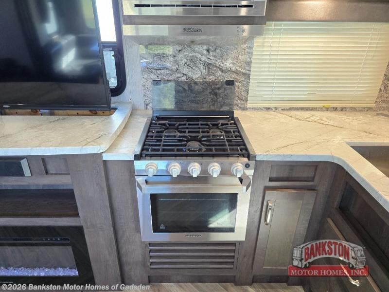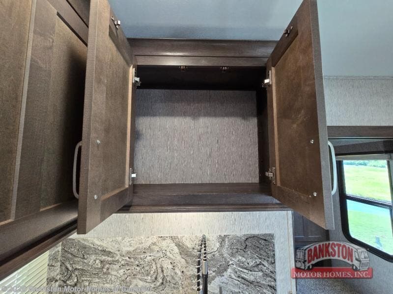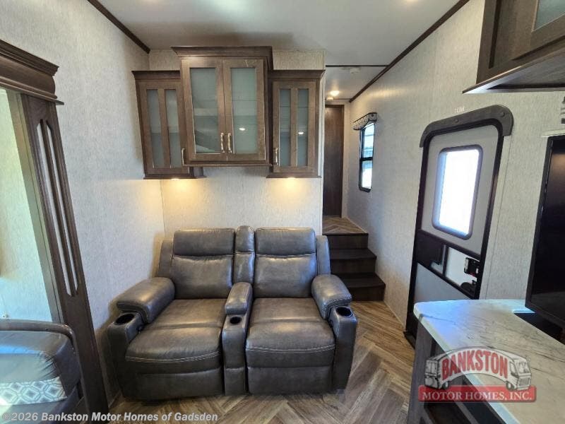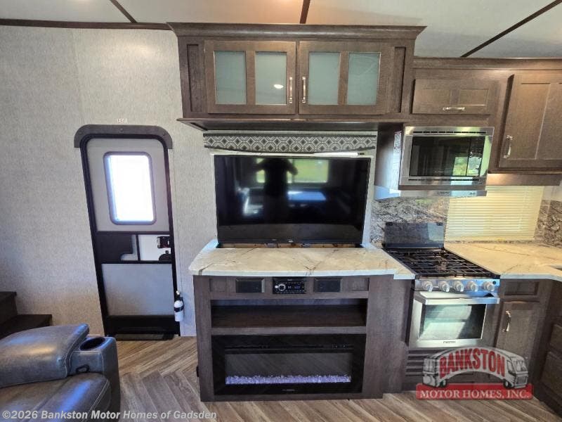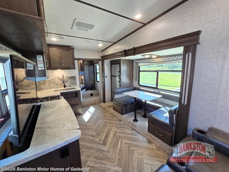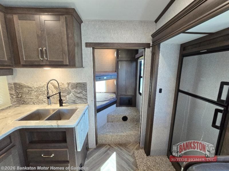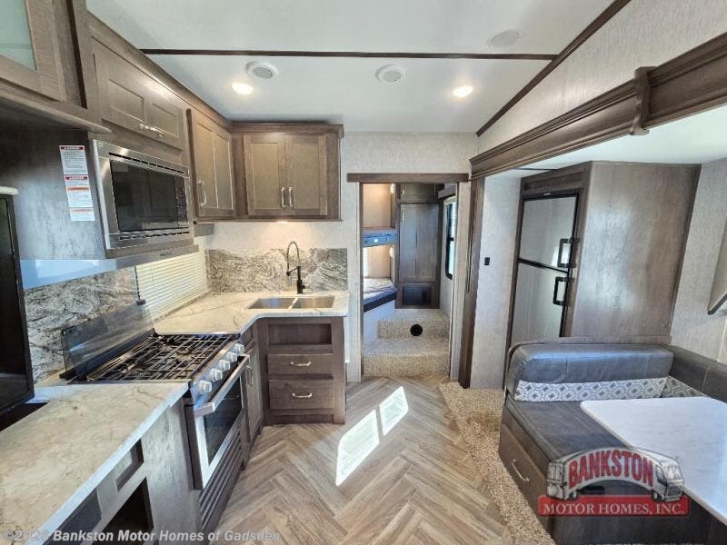 This Astoria fifth wheel is packed with comfortable at-home features your family is sure to love each time you camp. The slide out provides more interior space and also holds a U-shaped dinette that is great for a game of cards in the evening. After you've traveled all day to your destination, relax on the theater seating before heading out to find a trail or two. This unit includes a three-burner cooktop and a microwave to prepare all your meals, and the chef of the family will love the outdoor kitchen for some fresh air. The front private bedroom features a king bed, dual nightstands, and a wardrobe slide that mom and dad are sure to love, and the kids will crash on the double-size bunks after a day of playing and exploring!
