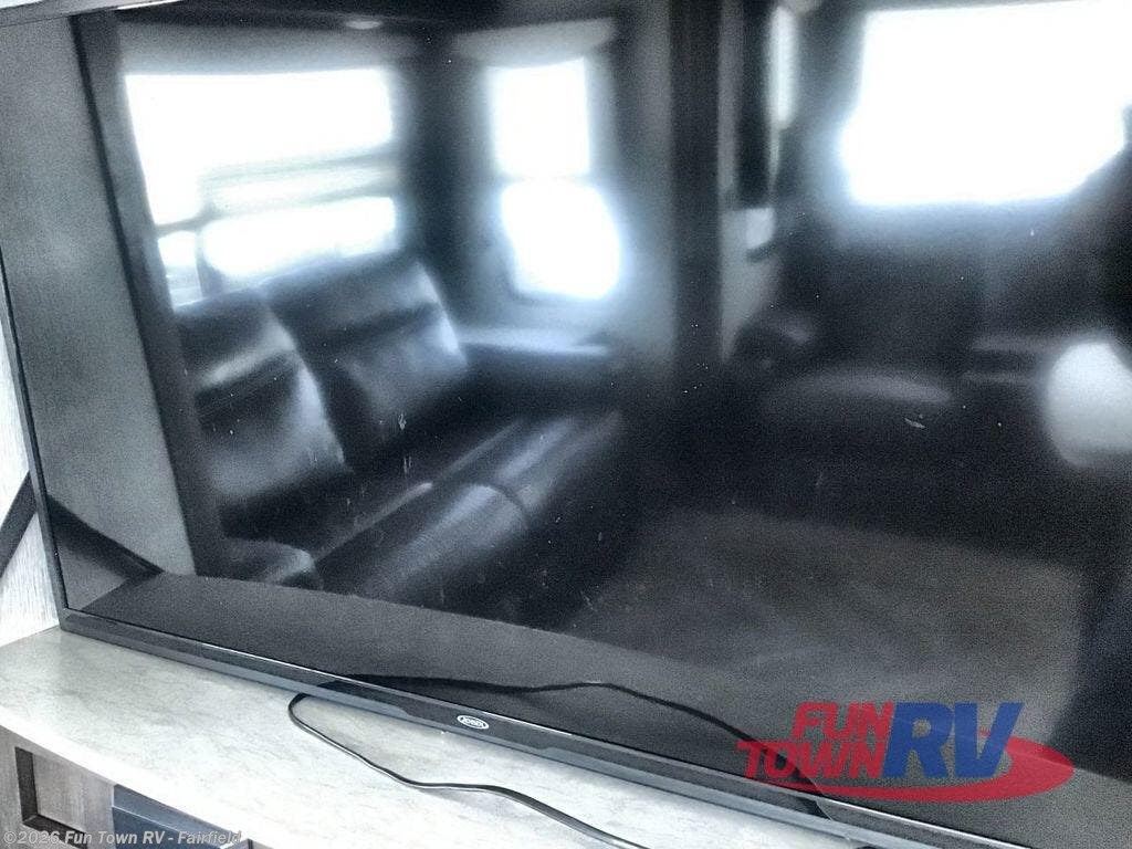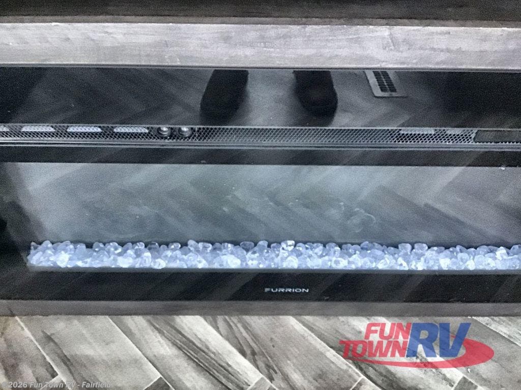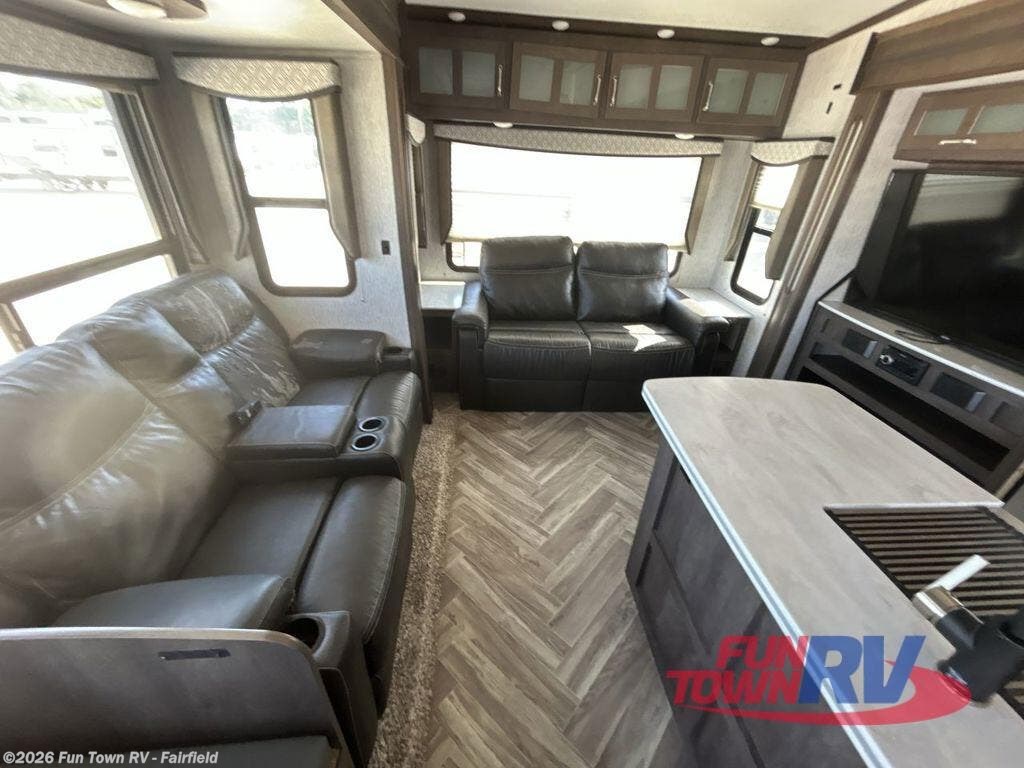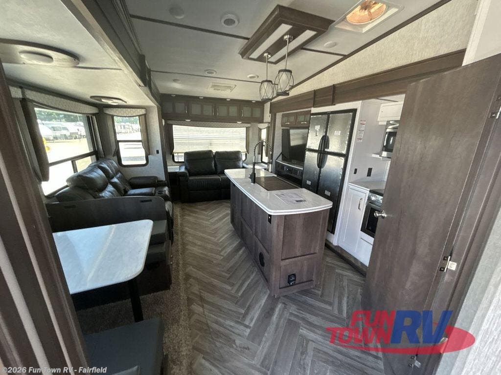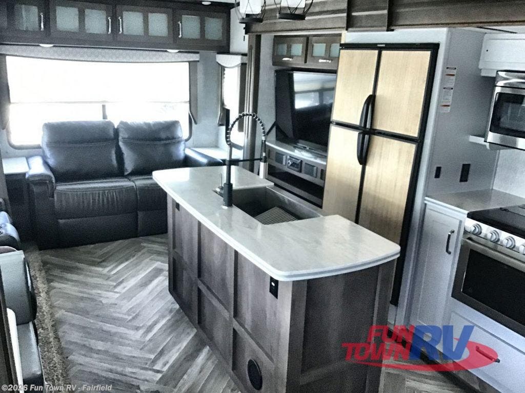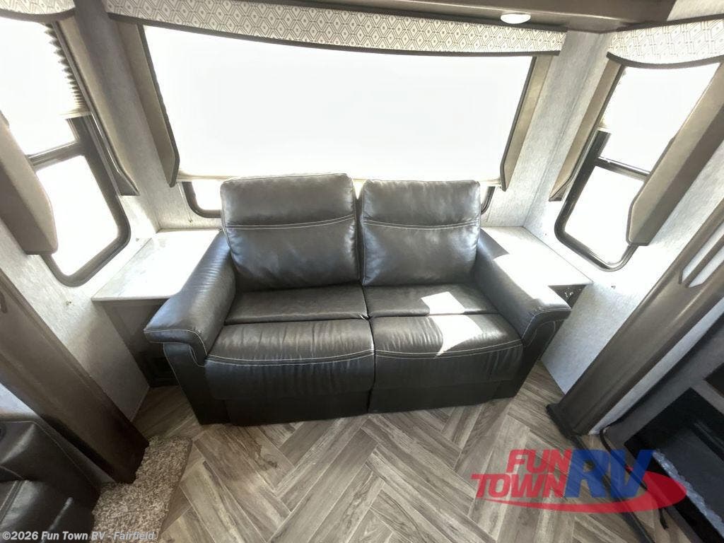 For complete comfort and luxury when you are away from home, choose this Astoria fifth wheel that features four slides for ample interior space. You can prepare breakfast each morning on the three-burner cooktop, and the kitchen island will provide extra counter space. This model features a rear living area with a tri-fold sofa, theater seating, and an HDTV with a fireplace below for those chilly evenings. When it's time to call it a night, the front private bedroom with a king bed will be a sweet oasis. The kids will call the middle private bedroom their own with its tri-fold sofa slide, a loft above, and storage space for their clothes and knickknacks.