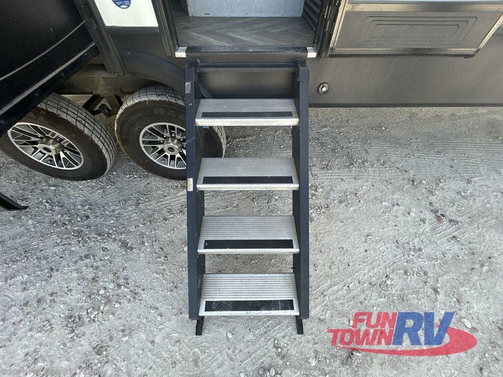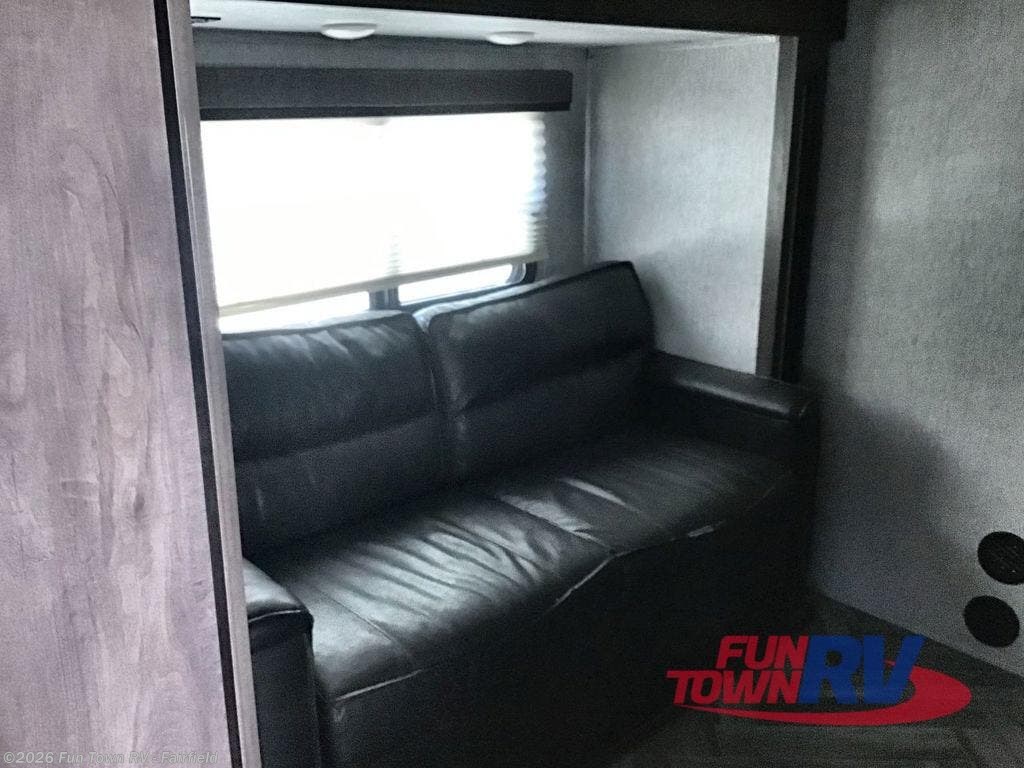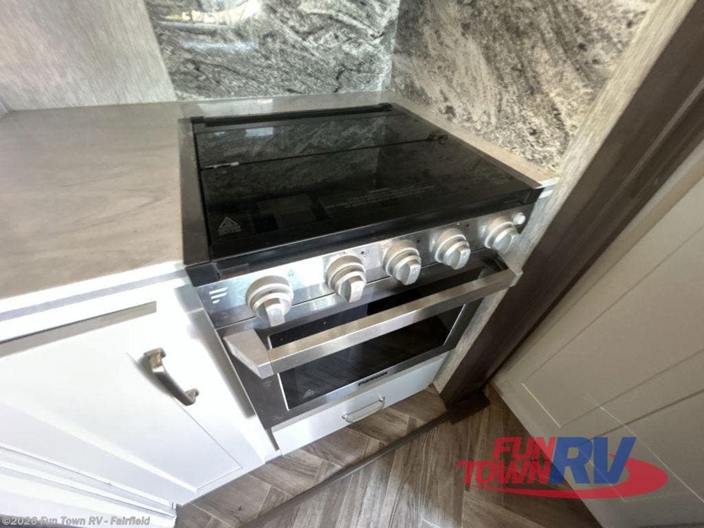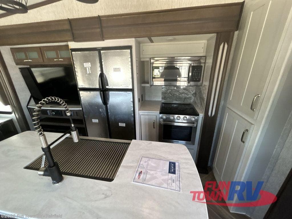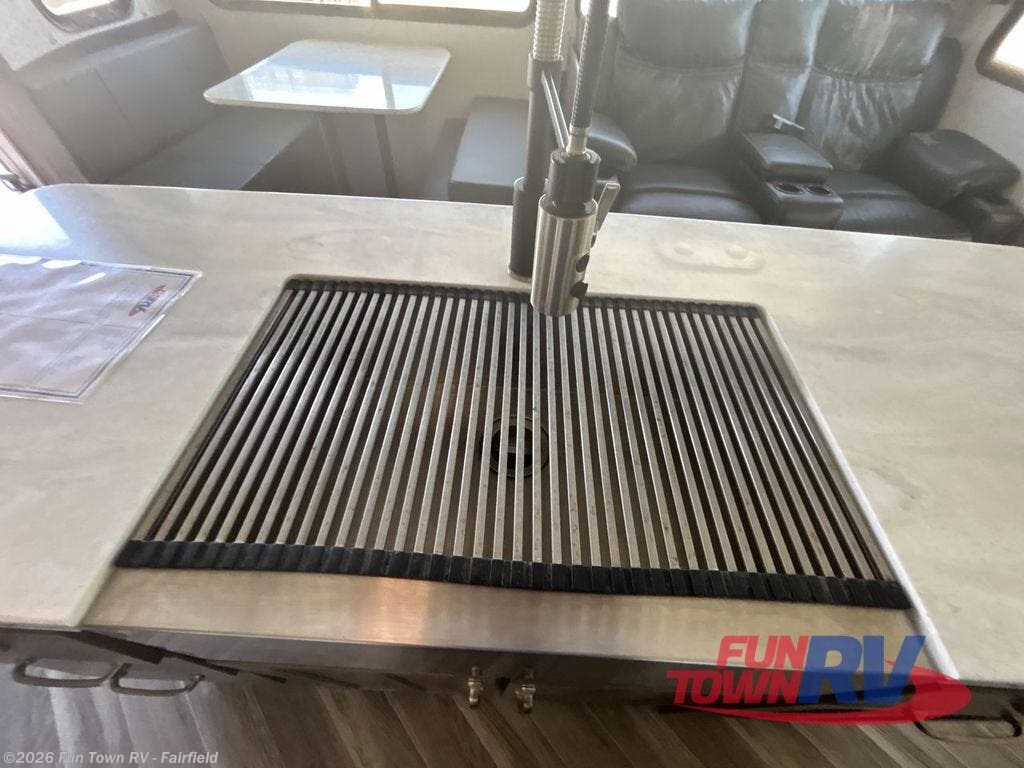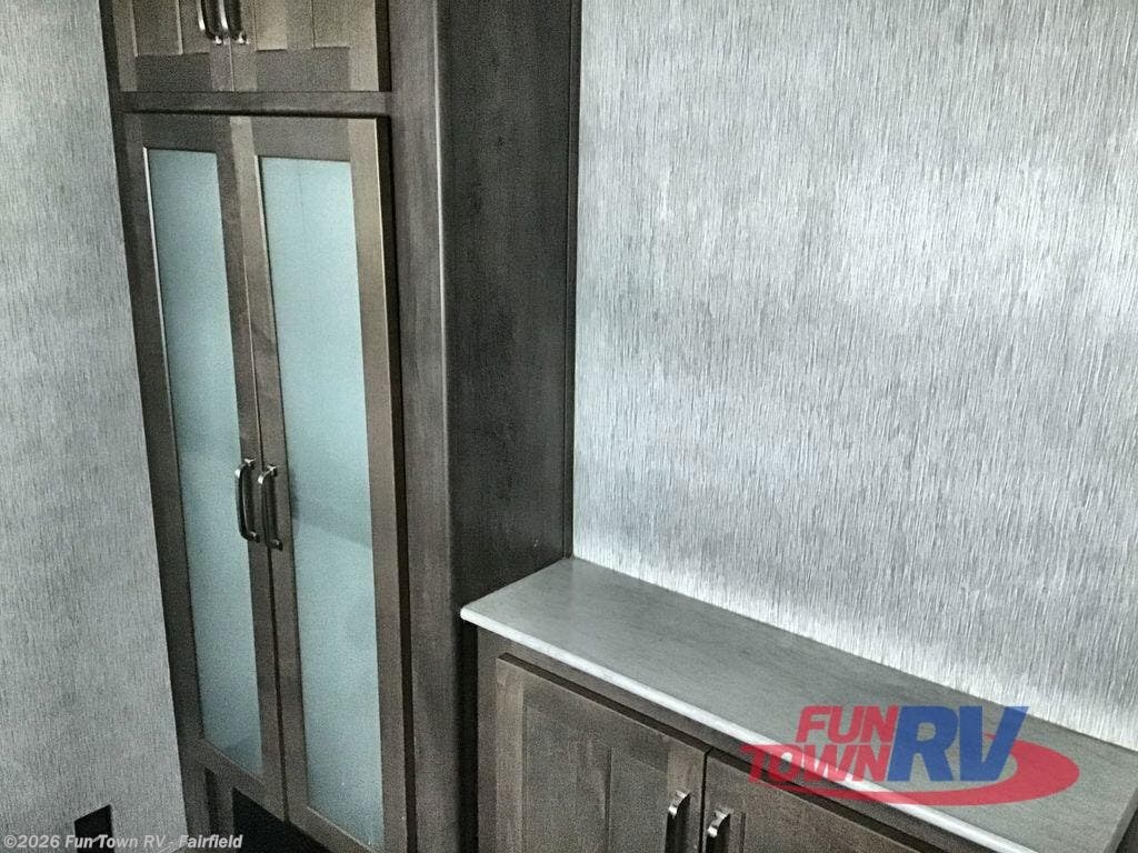 For complete comfort and luxury when you are away from home, choose this Astoria fifth wheel that features four slides for ample interior space. You can prepare breakfast each morning on the three-burner cooktop, and the kitchen island will provide extra counter space. This model features a rear living area with a tri-fold sofa, theater seating, and an HDTV with a fireplace below for those chilly evenings. When it's time to call it a night, the front private bedroom with a king bed will be a sweet oasis. The kids will call the middle private bedroom their own with its tri-fold sofa slide, a loft above, and storage space for their clothes and knickknacks.