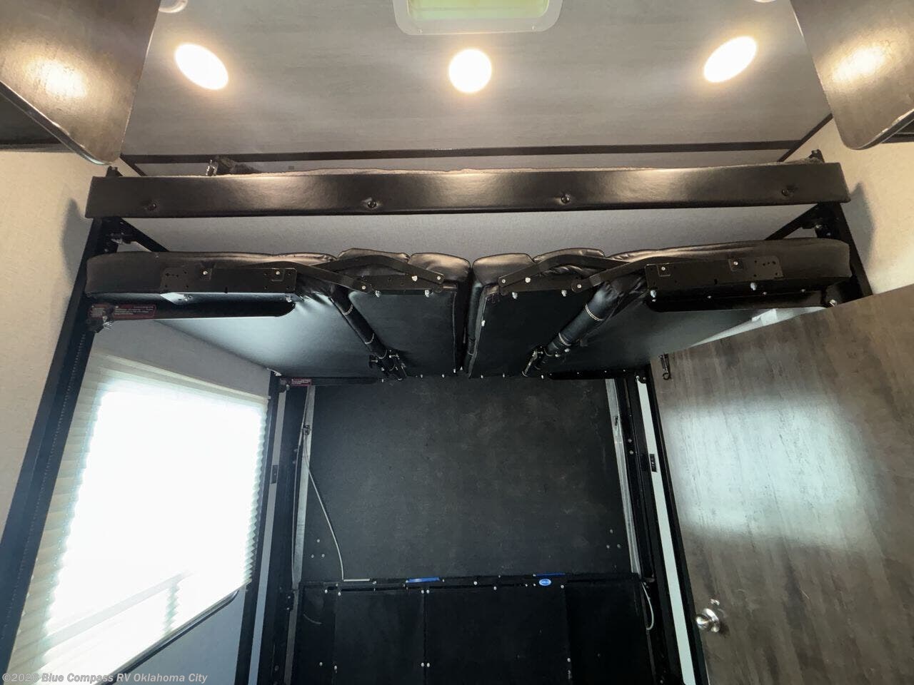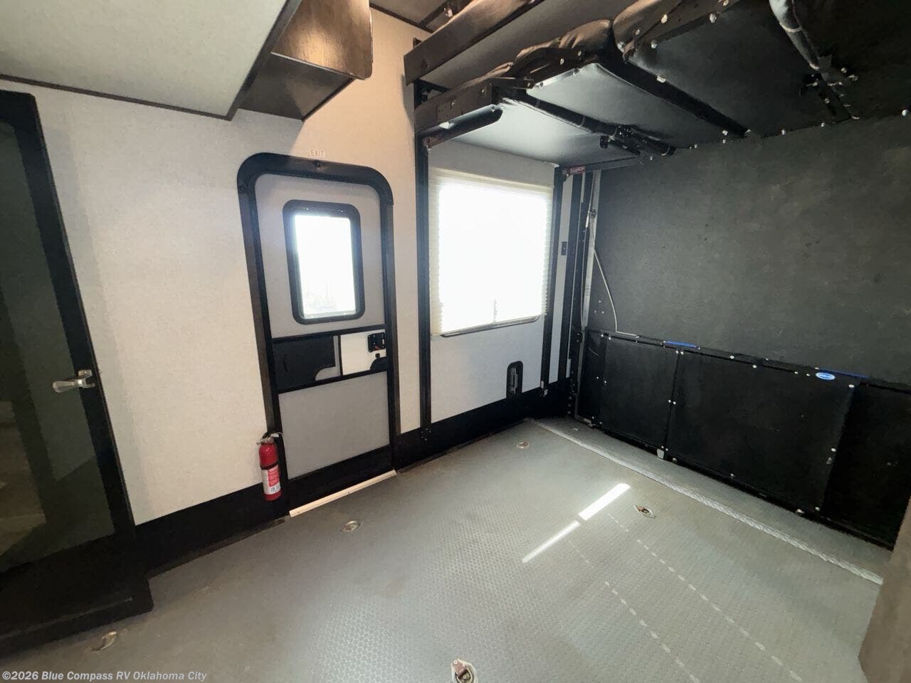Traveling with your family or your adventure buddies will be easy when you are towing this Voltage Triton fifth wheel toy hauler behind your truck! You will enjoy 13' of garage space that you can easily access via the rear 8' ramp door with spring assist. There is even access from inside the living area through a glass door if you like. The garage offers a lay-flat Happi-Jack power bunk with dual sofas and a table beneath, plus there is a twin-size loft overhead and a convenient half bath as well. Enjoy the convenience of a full kitchen for meals and a comfy king-size bed in the front master suite. Add the rear optional patio awning onto the ramp door and create a whole new way to enjoy the outdoors!