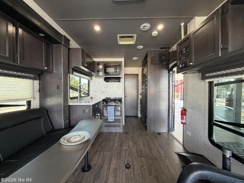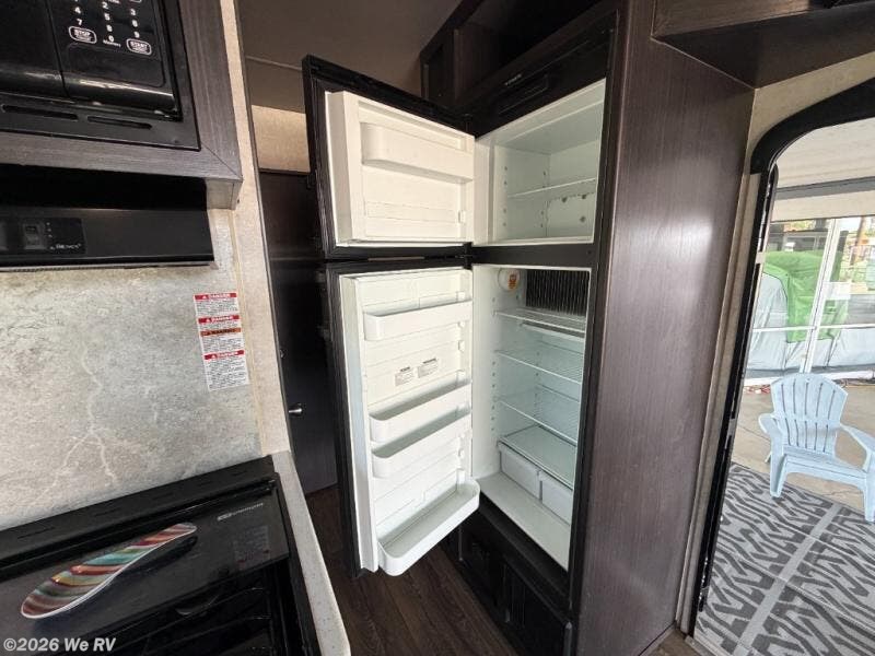 Grab your family and your toys and set out on a stellar adventure with this Stellar Pro-Lite toy hauler! You will sleep soundly each night because the pillowtop mattress on the queen-size bed in the private bedroom will deliver plenty of comfort for you and your spouse, and the bedside wardrobes will give you a place to store all of your garments and belongings so that they are out of your suitcases and hidden away. You will also enjoy having a full kitchen so that you can cook more than hot dogs and beans for your family, and the large double-door refrigerator will be able to hold any left overs you may have.