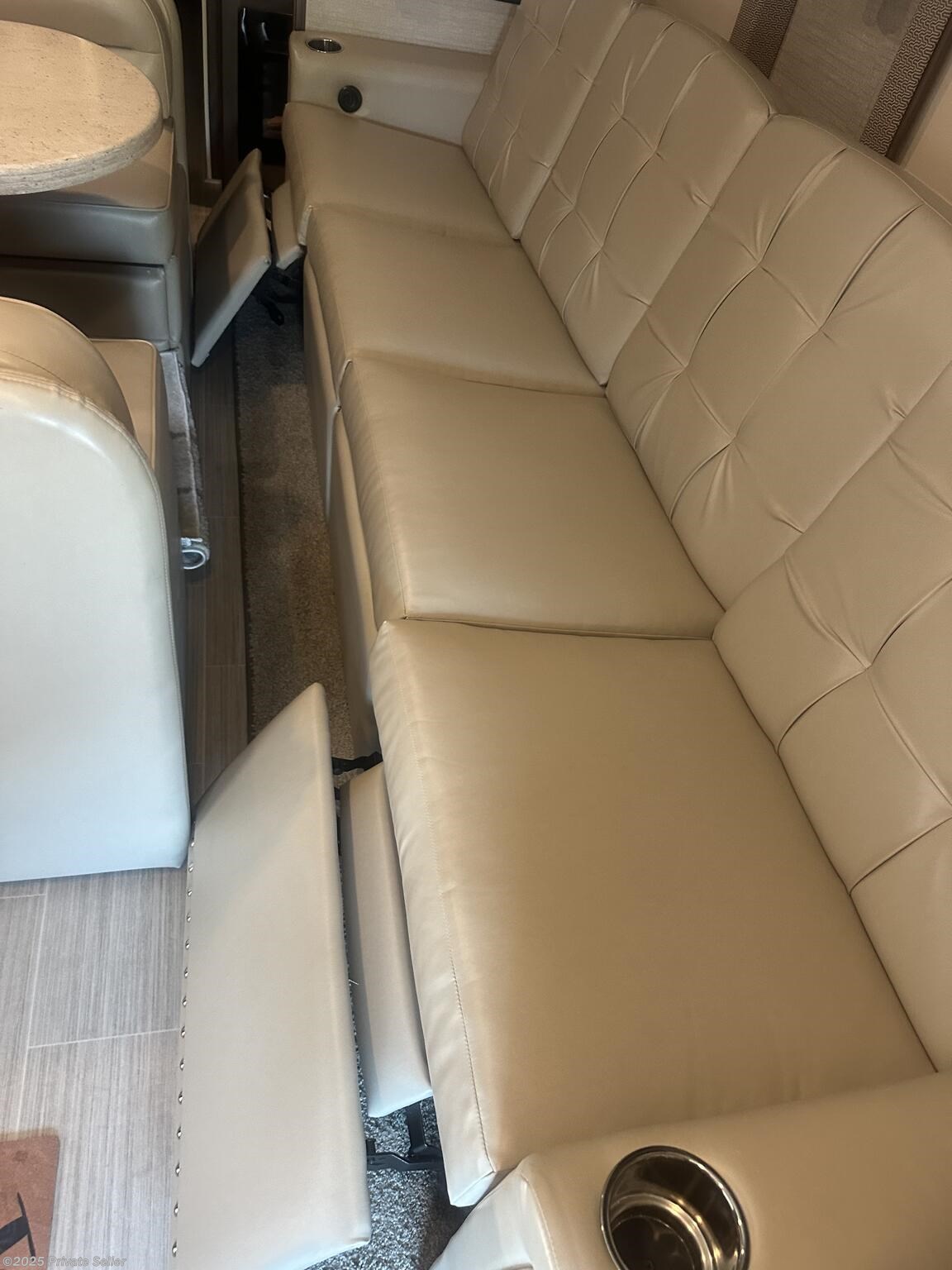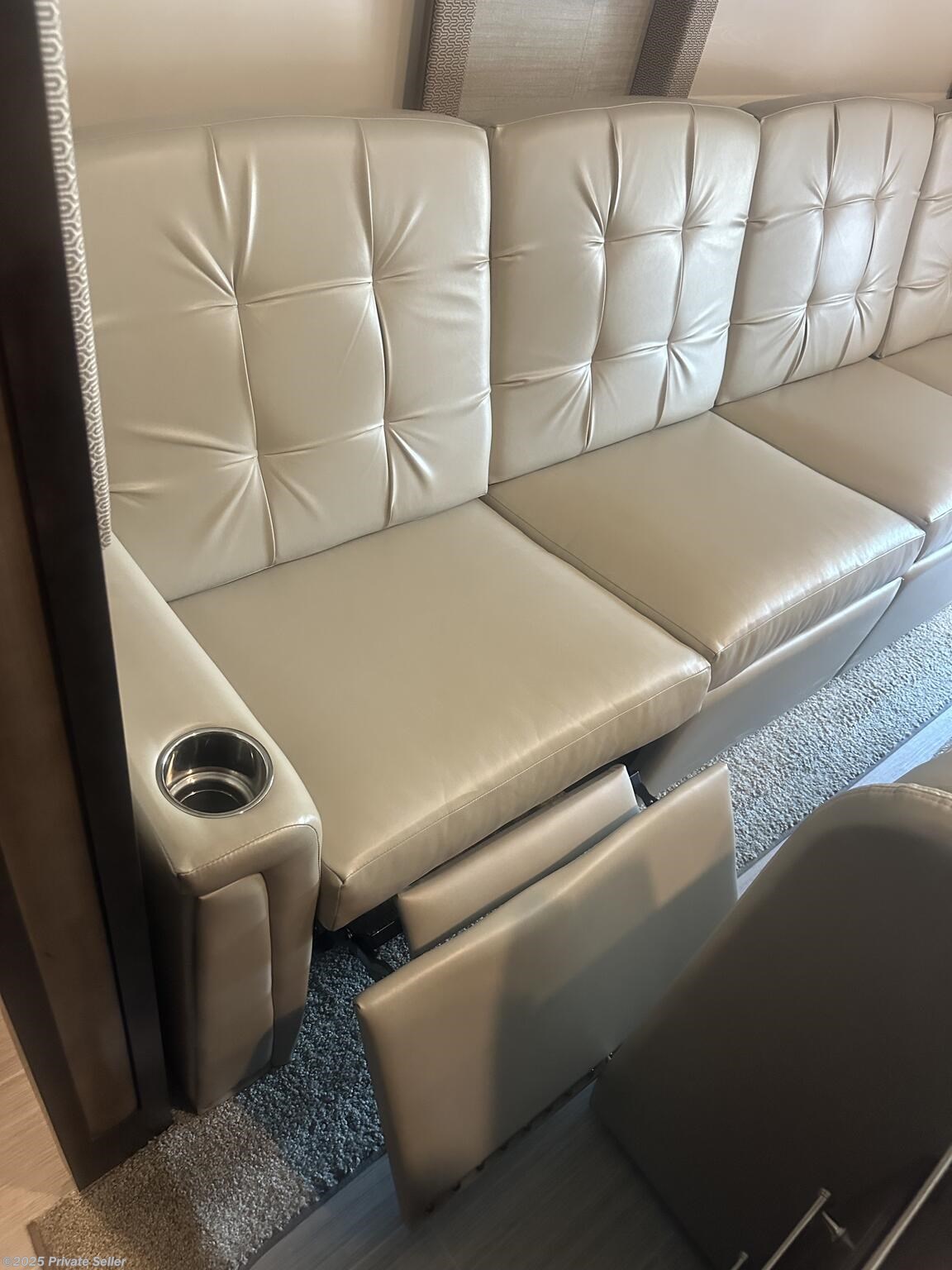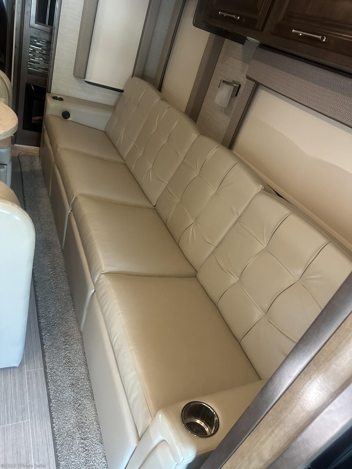 Inside, you'll find all the amenities you could ever need for life on the road. The kitchen is equipped with a stainless steel appliances, convection microwave, stove, large residential refrigerator, and plenty of counter space for meal preparation. The living area features comfortable seating, 4 individual theater seats recliners (2 powered), a dining table, and a telescopic flat-screen TV for entertainment.