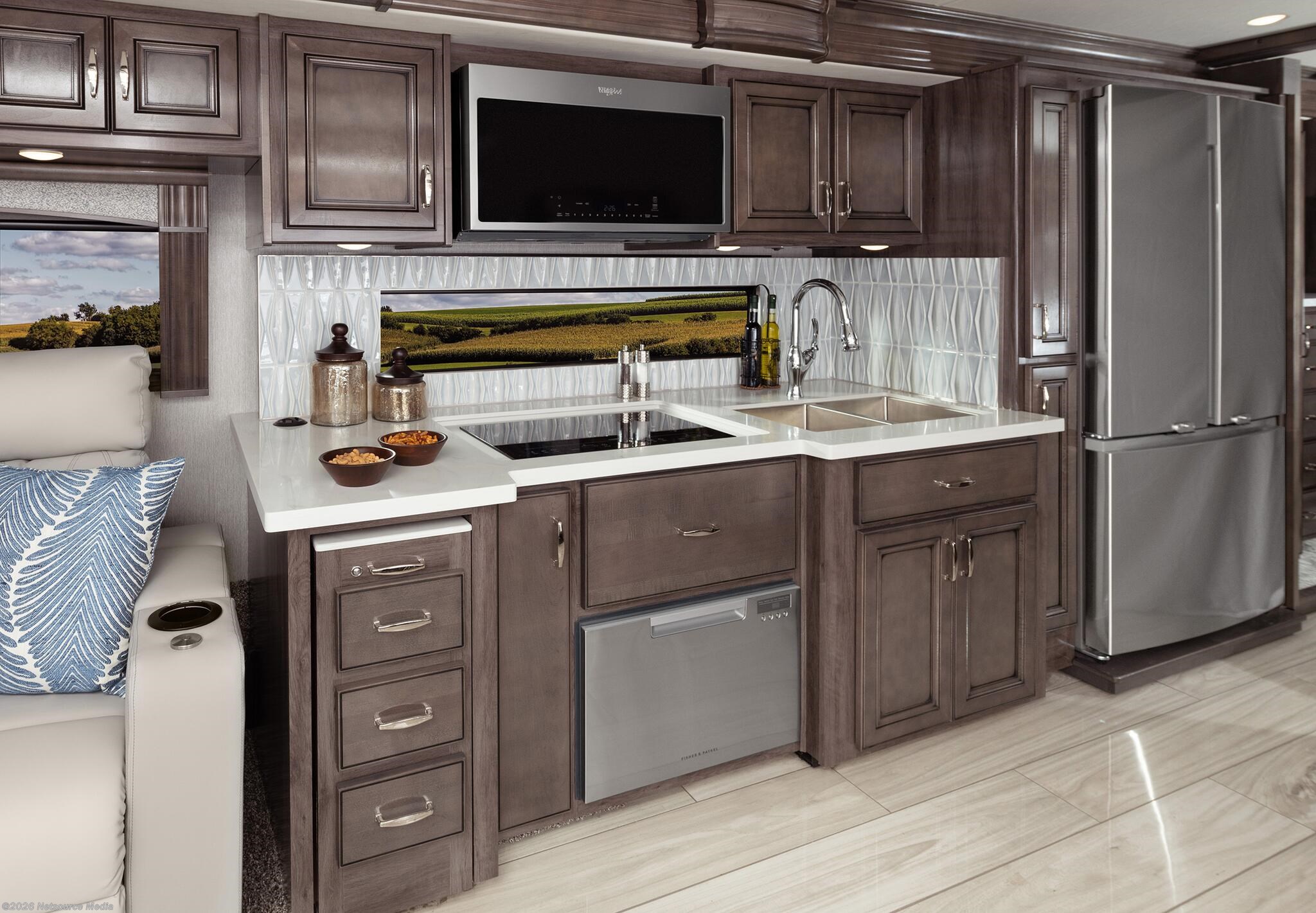 The living area features plush furnishings, including a comfortable sofa and dining area, perfect for relaxing or entertaining guests. The kitchen is equipped with state-of-the-art appliances, ample storage space, and a large countertop for meal preparation. The living/kitchen area boosts heated ceramic floors via the AquaHot system, which also fuels the heated water and comfort heat throughout.