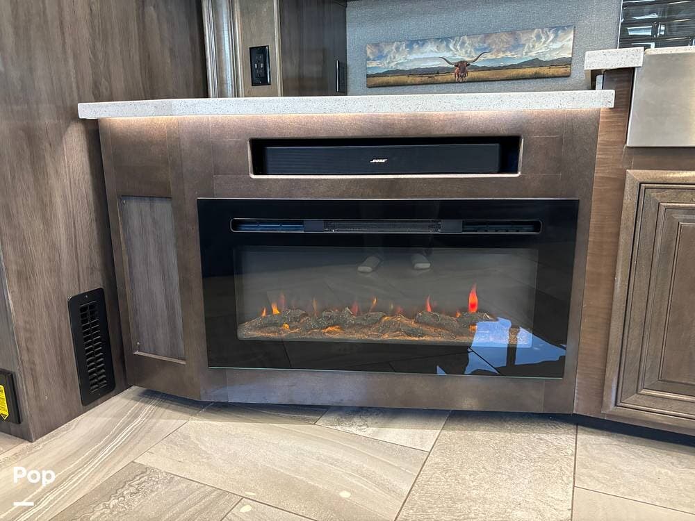 The living area features porcelain tile flooring, theater seating, a fireplace, and a JBL sound bar with surround sound. Three interior TVs provide entertainment, along with Bluetooth, DVD, and a power charging center.
