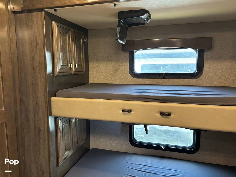 There are three separate sleeping areas, including a cab-over bed, a private king bed in the rear suite, and bunk beds. The bedroom also includes a washer and dryer, storage throughout, and day/night roller shades.
