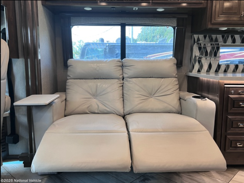 Step inside to enjoy a spacious and elegant interior highlighted by dual slide-outs, which expand the living area to create a comfortable environment for relaxing and entertaining. The main lounge features theater seating, a sofa, and an entertainment center with a large HDTV, providing an inviting space to unwind. The gourmet kitchen is fully equipped with solid-surface countertops, a residential refrigerator, three-burner induction cooktop with oven, microwave, and ample cabinetry, making meal preparation simple and enjoyable.