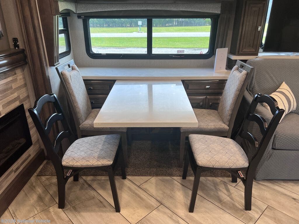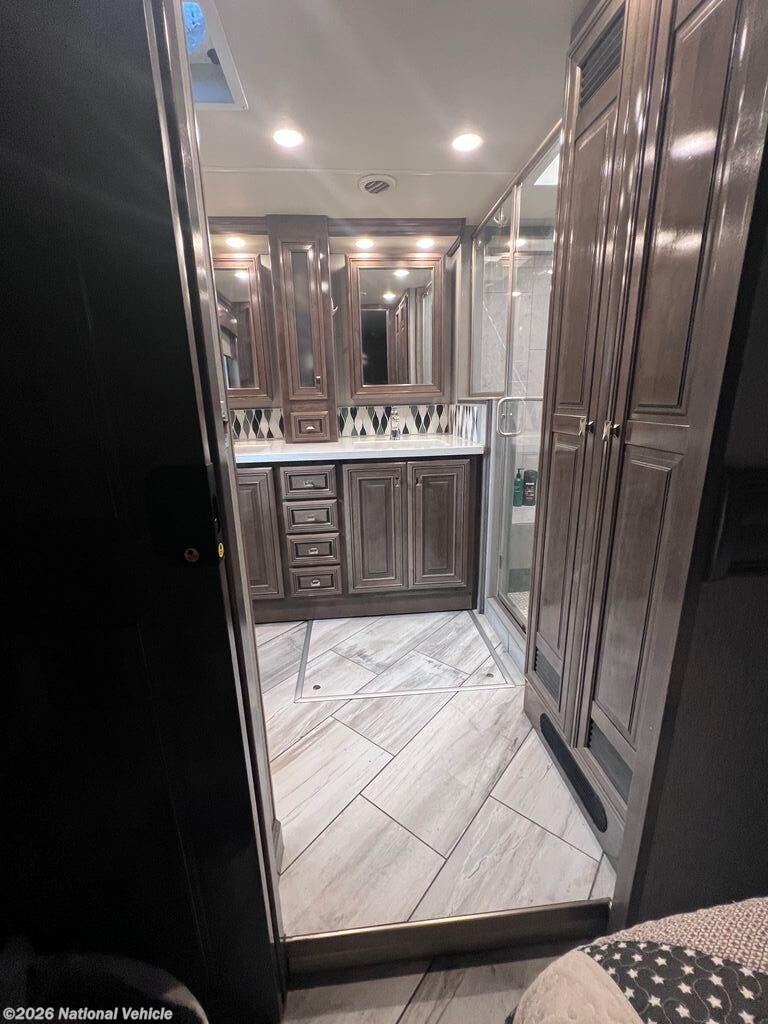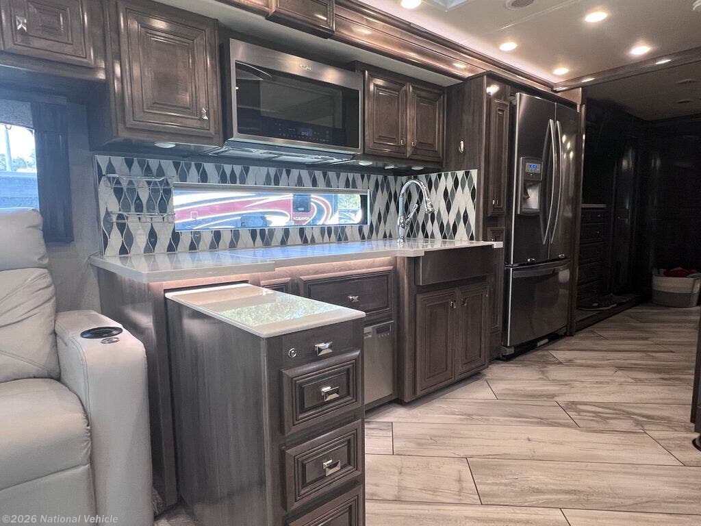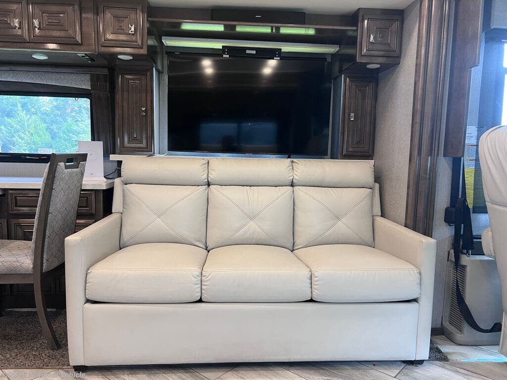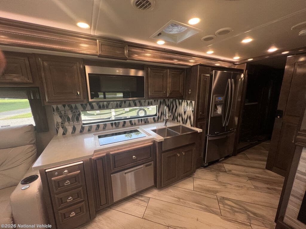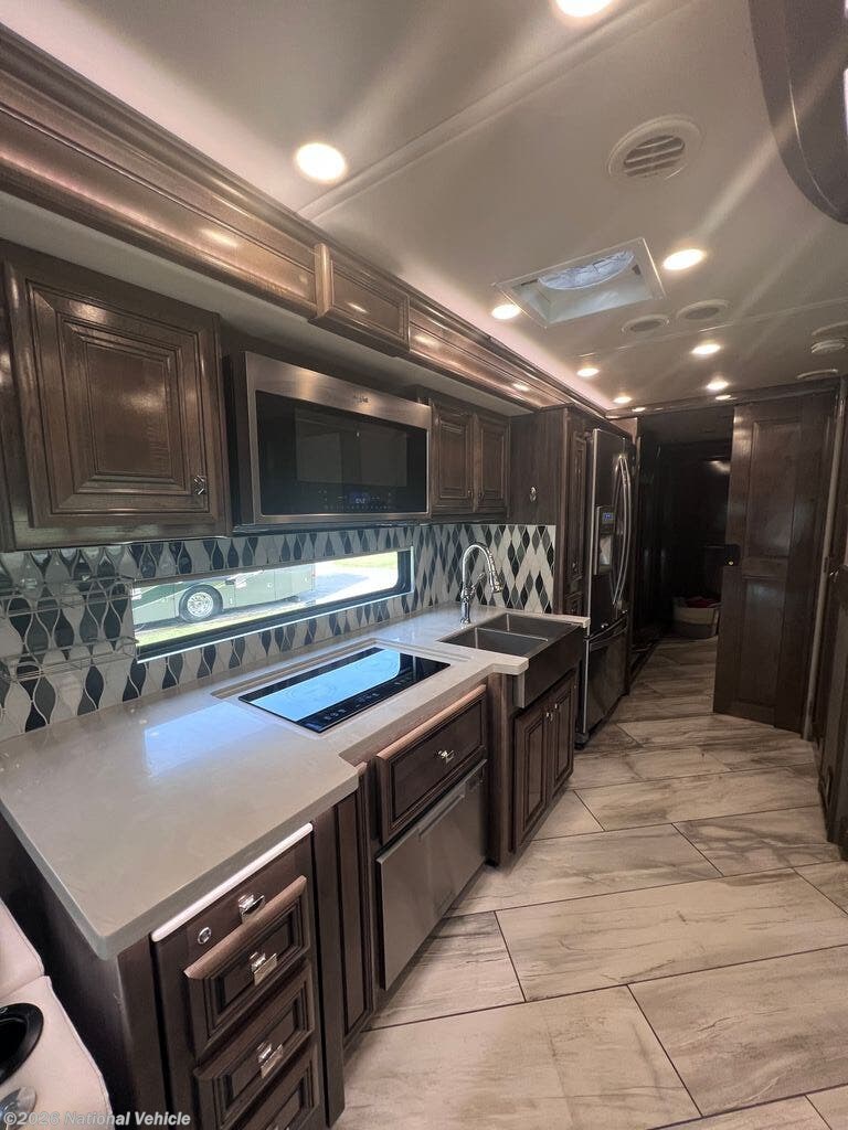 Step inside to enjoy a spacious and elegant interior highlighted by dual slide-outs, which expand the living area to create a comfortable environment for relaxing and entertaining. The main lounge features theater seating, a sofa, and an entertainment center with a large HDTV, providing an inviting space to unwind. The gourmet kitchen is fully equipped with solid-surface countertops, a residential refrigerator, three-burner induction cooktop with oven, microwave, and ample cabinetry, making meal preparation simple and enjoyable.