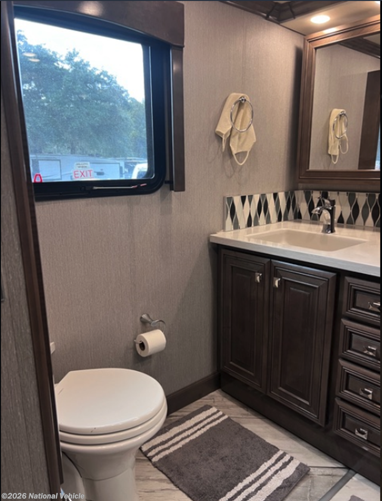 The private rear master suite offers a king-size bed, generous wardrobe storage, and washer/dryer, while the full bathroom features a residential-style shower, dual vanities, and ample storage, ensuring comfort on every journey. Outside, amenities like a power patio awning with LED lighting, multiple exterior storage compartments, and an exterior entertainment system enhance outdoor living and campsite enjoyment.