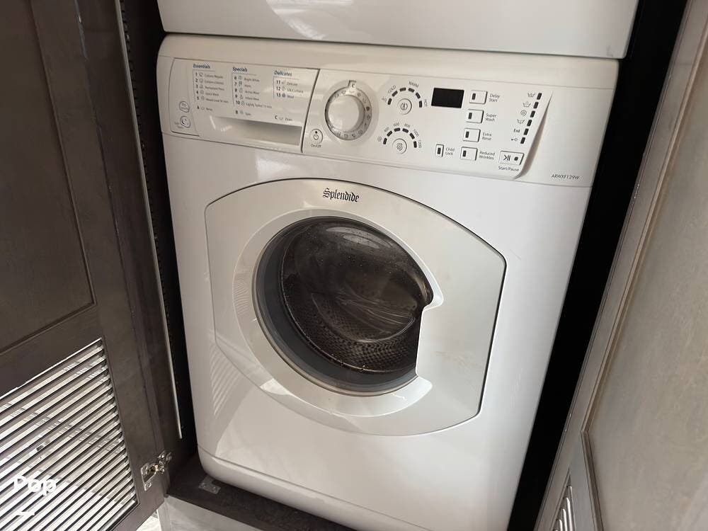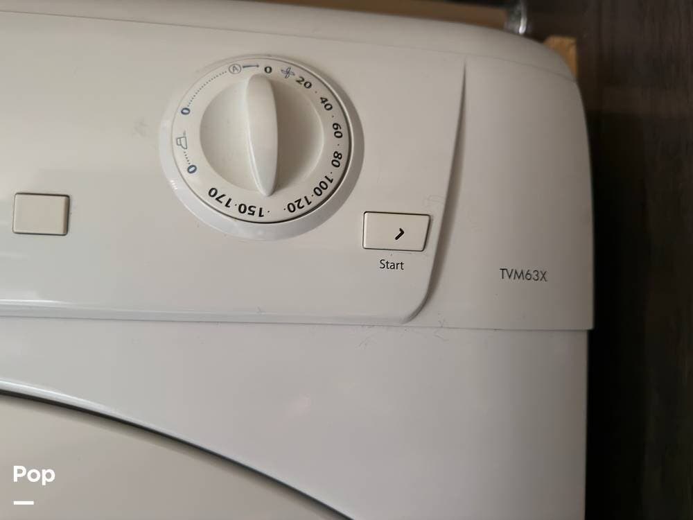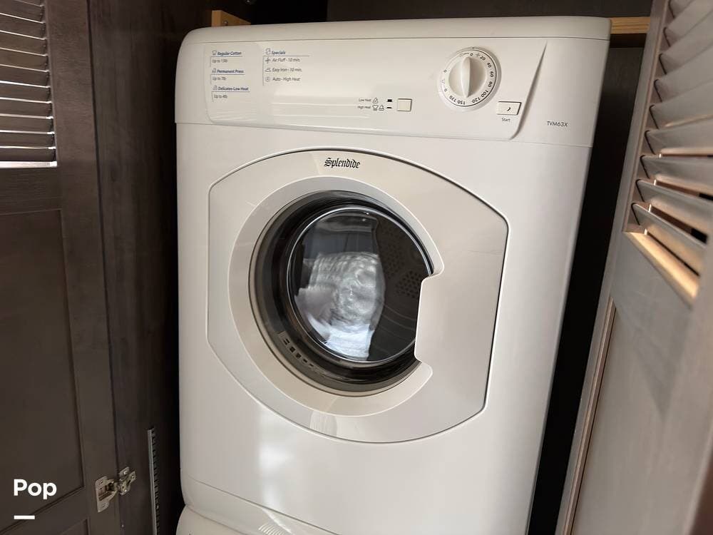 Towards the rear of the coach, in the hallway, the mid-bath features a large rectangular shower, a medicine cabinet, a stainless steel sink, a toilet, and ample vanity storage. At the rear of the coach is a large suite with a slide-out king bed, opposing windows, dual wardrobes and upper cabinets, nine dresser drawers, and a TV. and a separate washer and dryer.