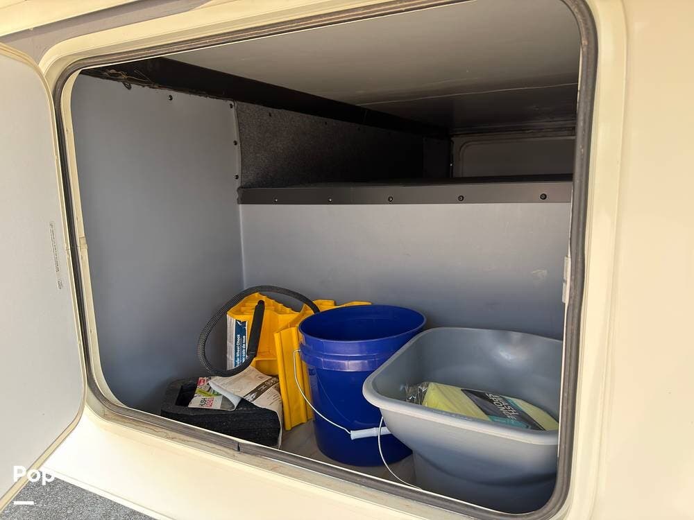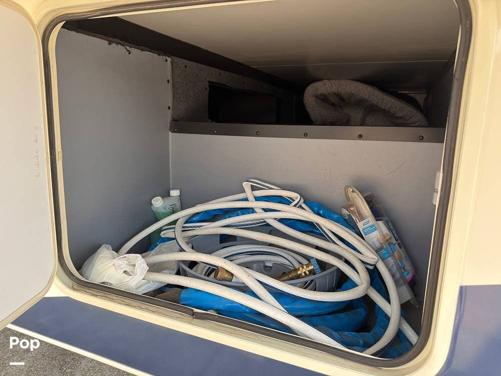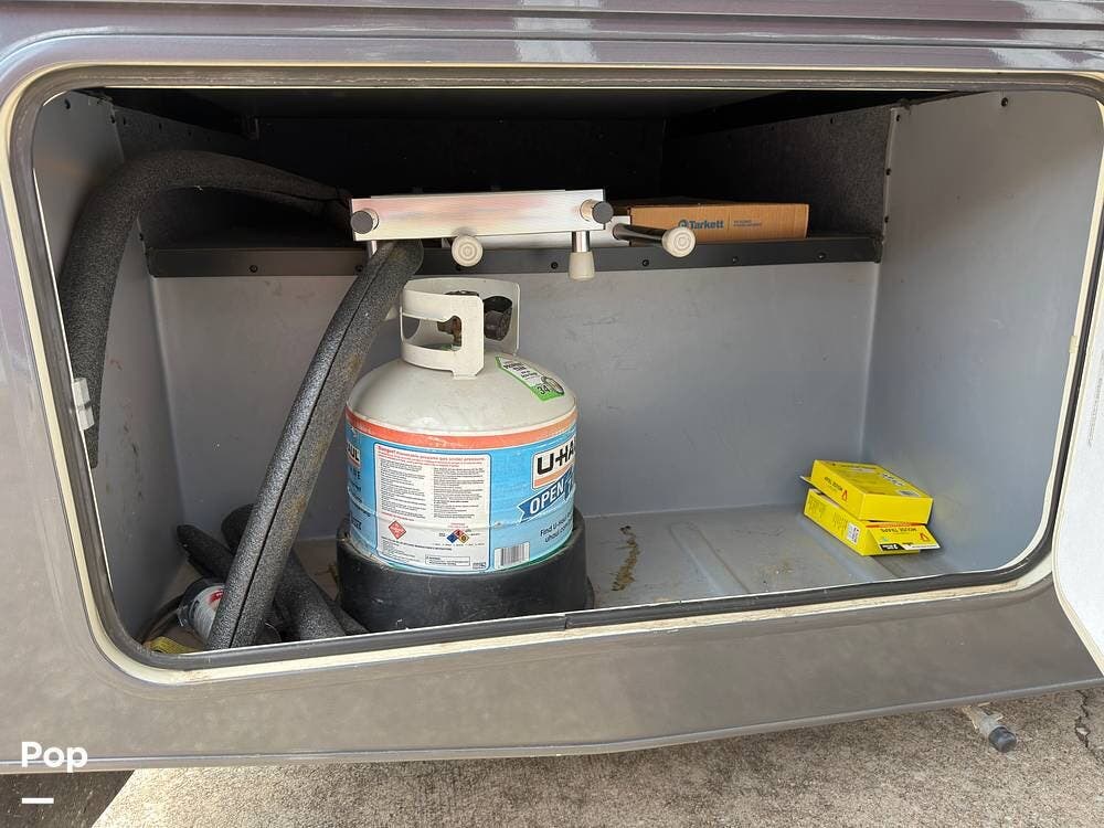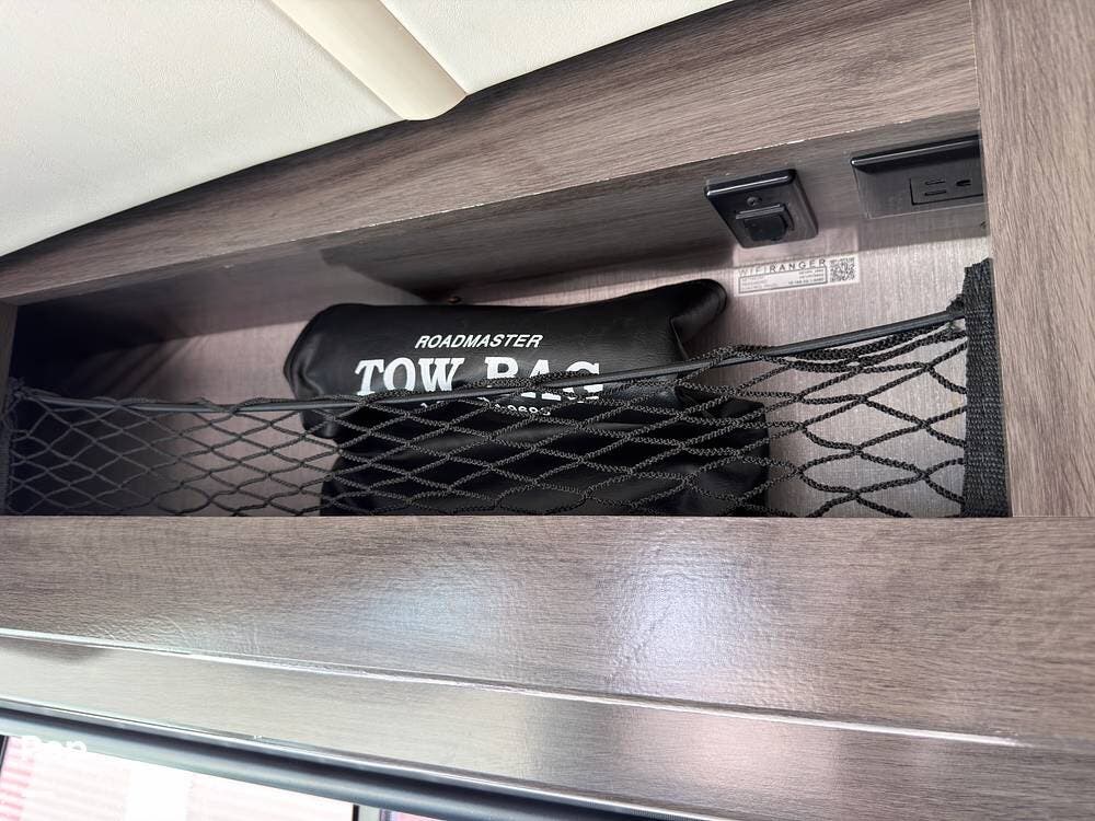Outside, there is a large patio awning, stereo speakers, a TV, and ample storage space for all your gear.