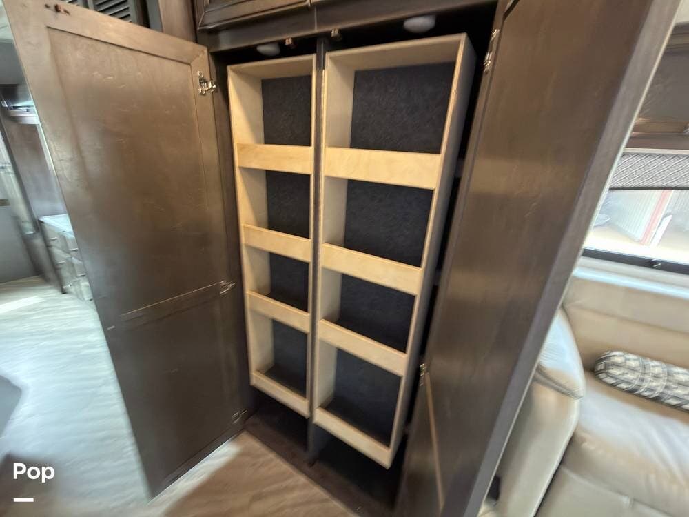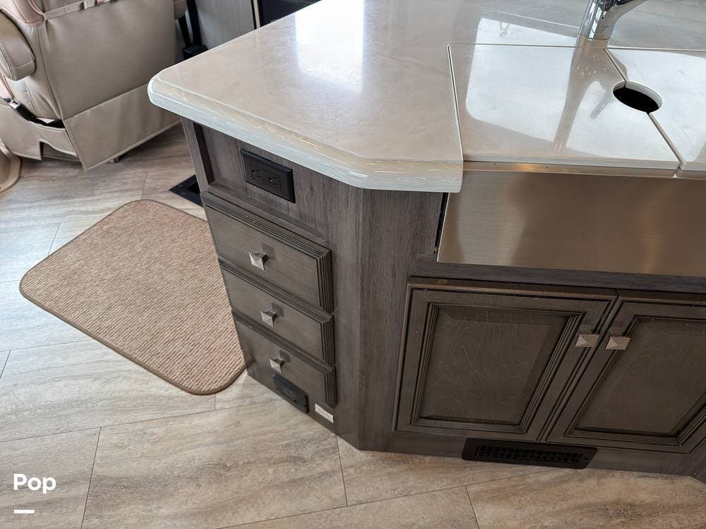 As you enter the coach, the spacious living area showcases the solid hardwood Greystone finish and features an entertainment center with a TV, theatre seating, and a drop-down bed over the cab.