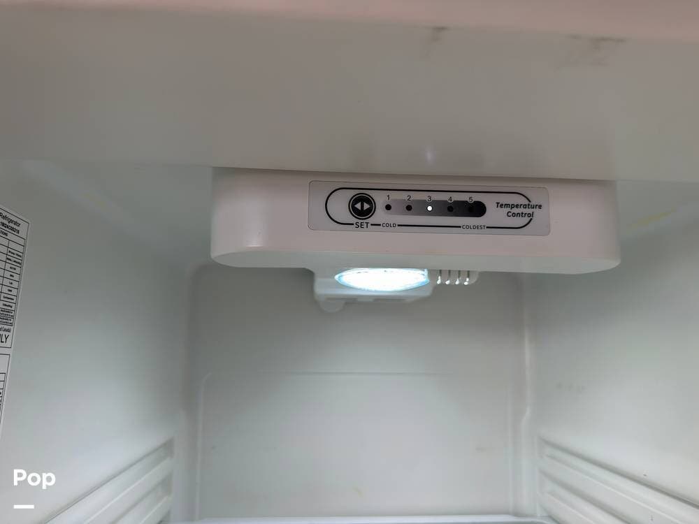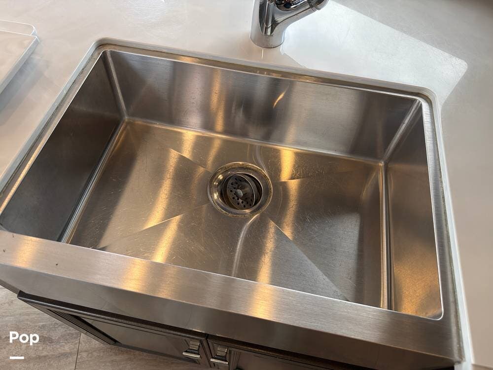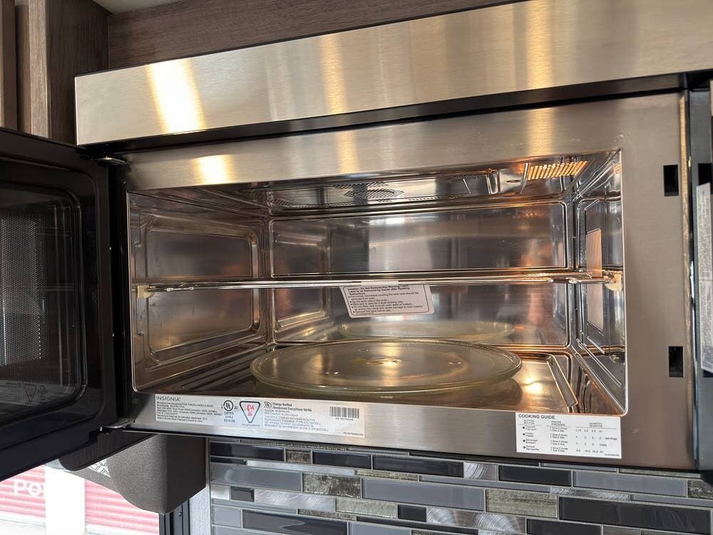 The kitchen is conveniently located adjacent to the living area. It features solid-surface countertops, a tile backsplash, a stainless-steel sink, a residential-style refrigerator, a stove/oven, a microwave, and ample counter space and storage.