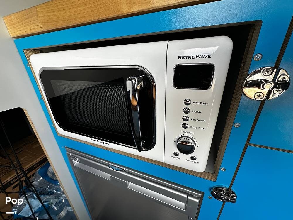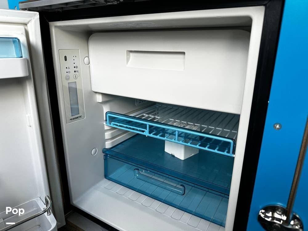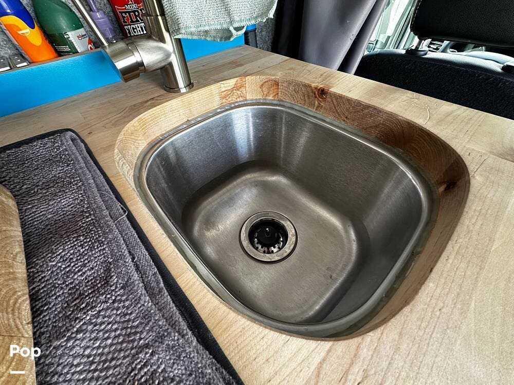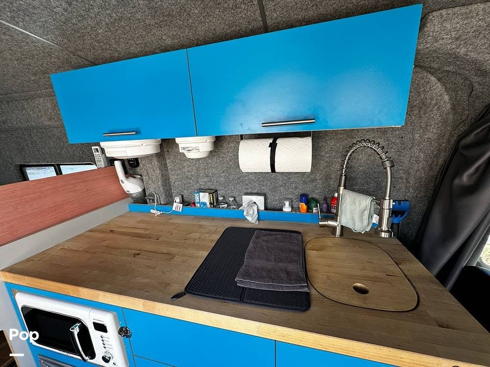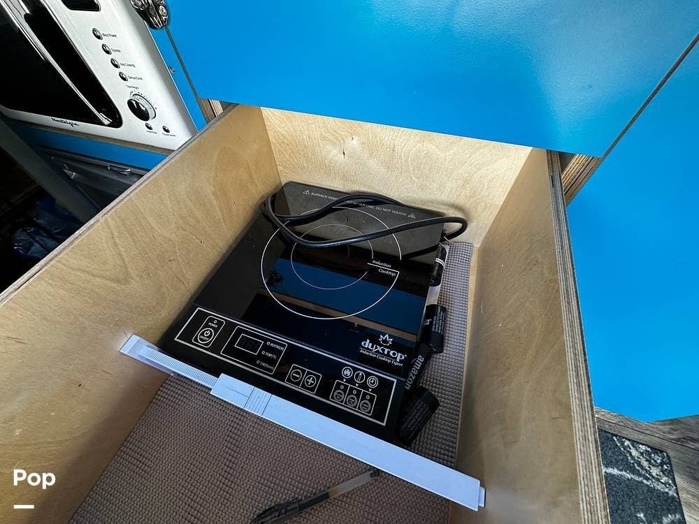 The kitchen area is equipped with a stainless steel sink mounted under the butcher block countertop, a portable induction cooktop with pans, Dometic 2 cu ft refrigerator, a Lagun adjustable table, plenty of cabinet and drawers along with a swivel passenger seat.