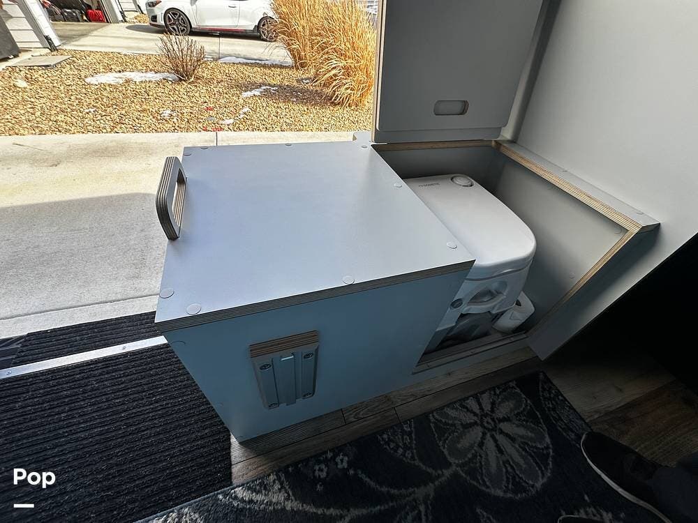 Interior and comfort features include a Webasto Evo40 Air heater, upholstered walls & ceiling, VanEssential magnetic & insulated window & vent covers, rear door mounted on-demand shower, a 70" x 72" memory foam mattress, 5 gal cassette toilet and a 20 gal fresh water system. The interior head height of 68" is comfortable for even taller people while allowing the van more clearance to still get under most low hanging areas.