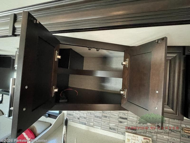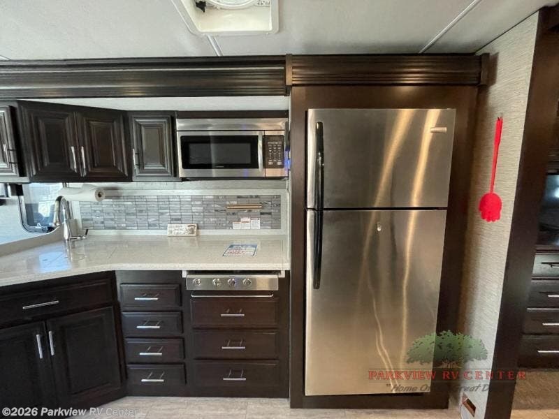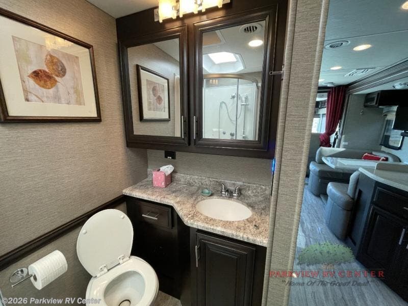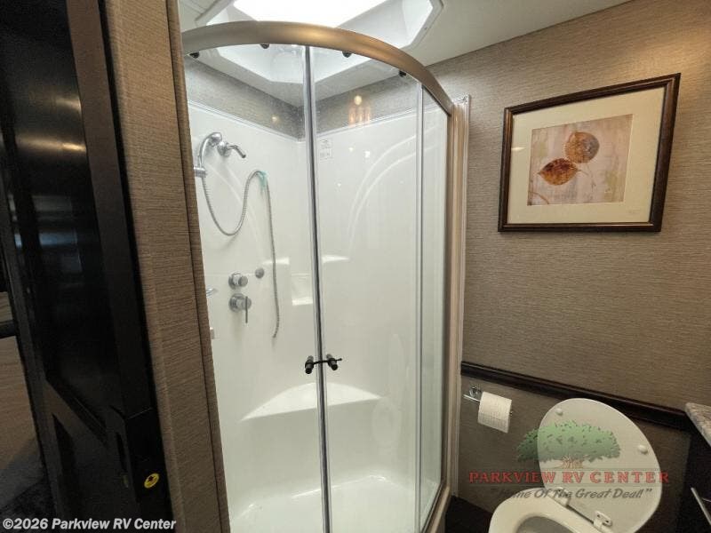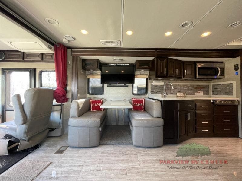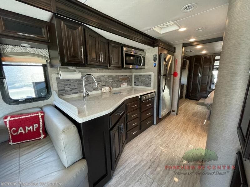 Whether you decide to live in this coach or explore for weeks at a time, you will experience luxury, comfort and spaciousness throughout. Imagine easily setting up the four slide outs at your favorite RV resort. You can then make a meal using the convection microwave while watching the 43" LED TV and visiting with your spouse relaxing on the Visionary hide-a-bed sofa. You will surely appreciate the farmhouse stainless steel sink to wash the dishes. And the polished solid surface kitchen countertops and the backsplash with tile inserts offer style you will love. When it's time to sleep, the king bed slide is waiting for you in the private rear bedroom. You will also find plenty of storage, a space prepped for a washer/dryer option, and a 32" LED TV. If your children joined you, they can sleep on the sofa, the Soft Touch Dream booth dinette and the bunk lift above the cab area. Everyone can stay clean with a full bathroom which includes a one piece fiberglass shower with tempered glass door and skylight, a solid surface under mount sink and a porcelain china bowl toilet with foot flush.