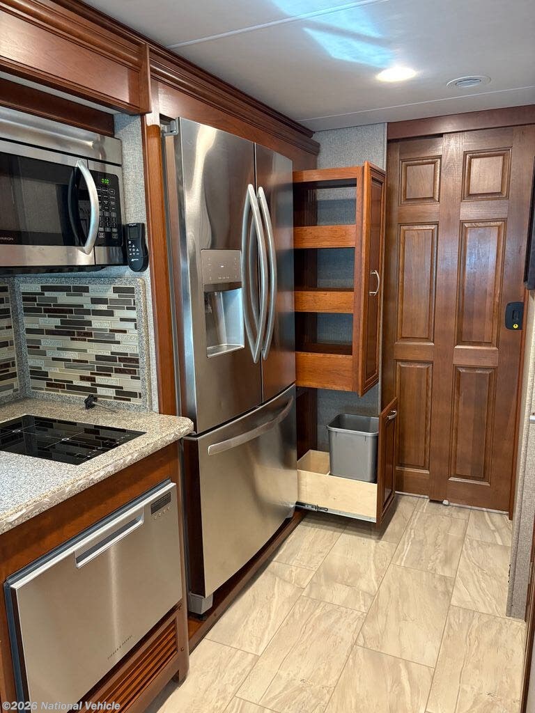 Residential fridge/freezer with ice maker, convection microwave, induction cooktop, and slide-out pantry