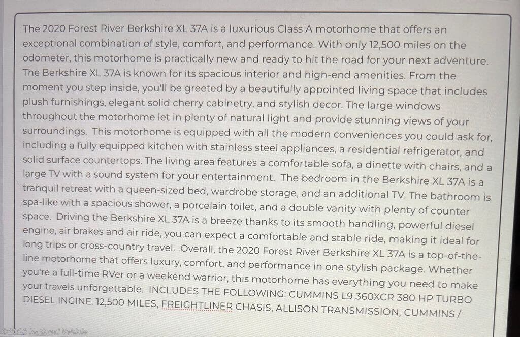 Request More Info on this 2020 Forest River Berkshire XL 37A Offered for sale by National Vehicle