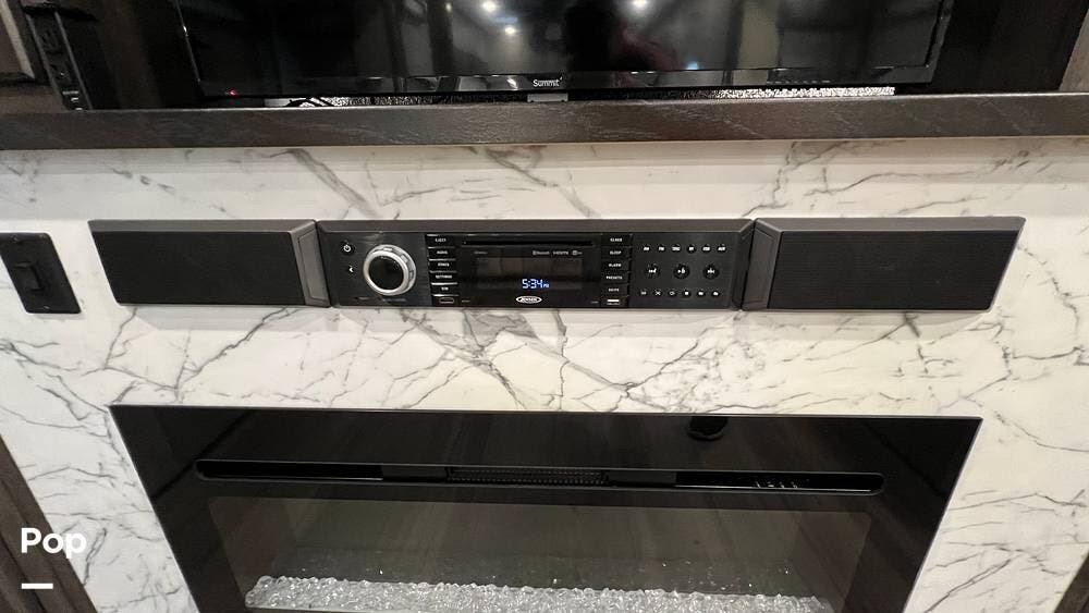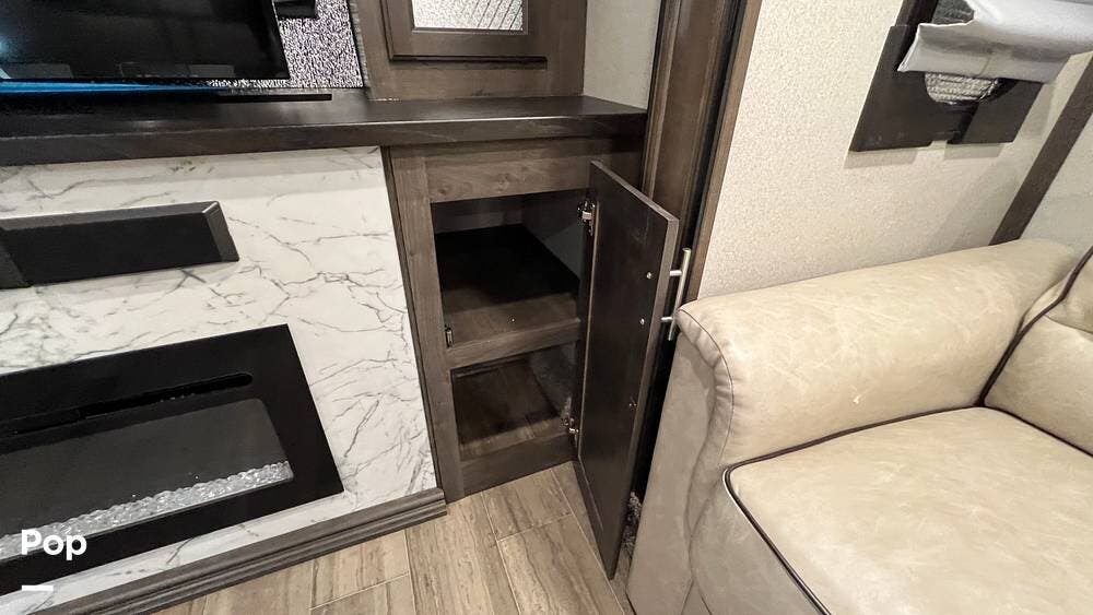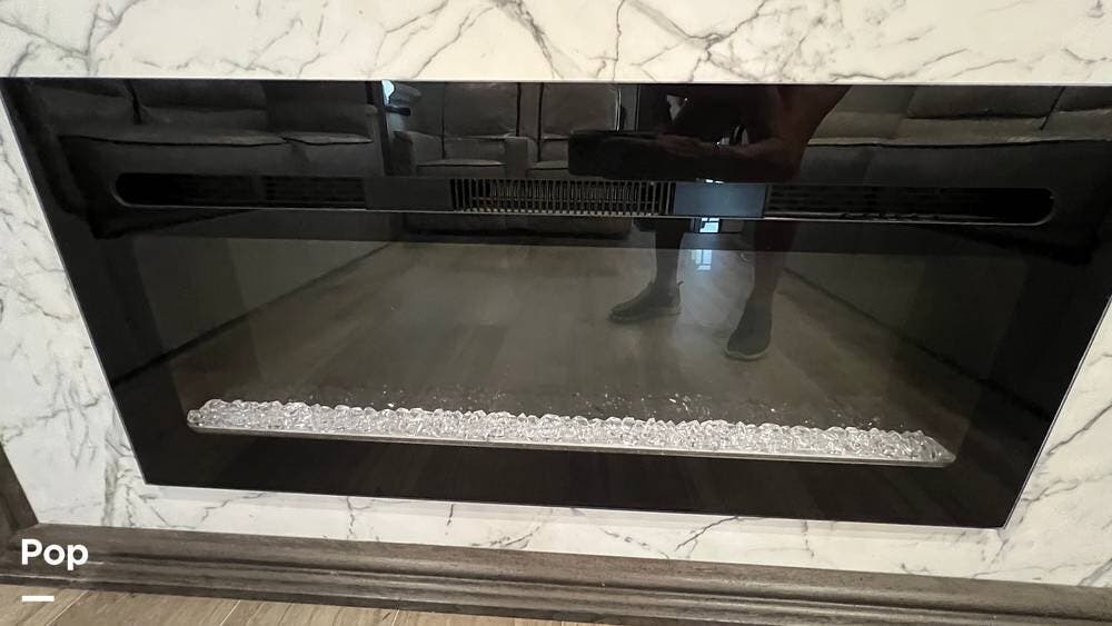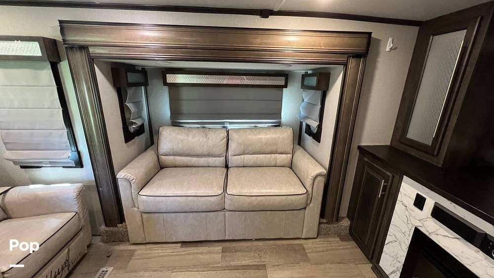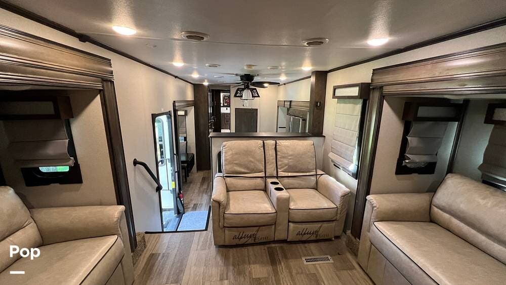 The living area has Allure Collection powered theater seating with massage, two queen-size tri-fold sofa sleepers, plenty of storage space, and an entertainment center with a 50" pop-up TV with sound bar, Jensen stereo, interior/exterior speakers, surround sound, and electric fireplace with remote.