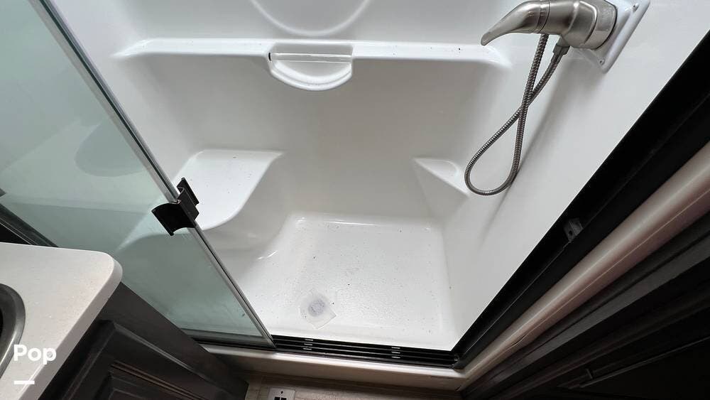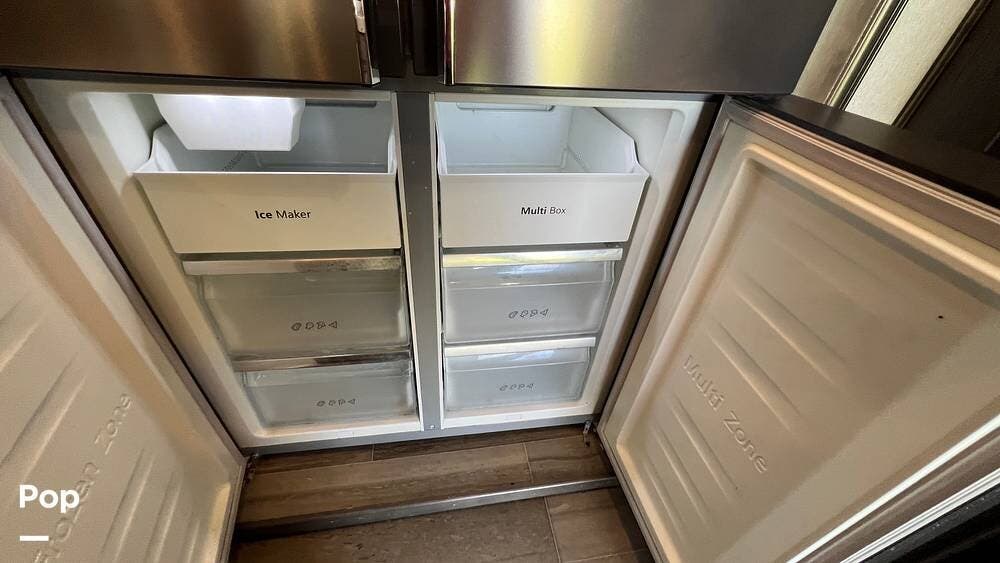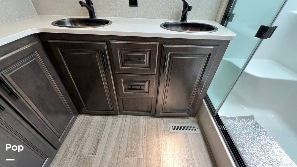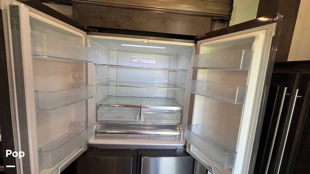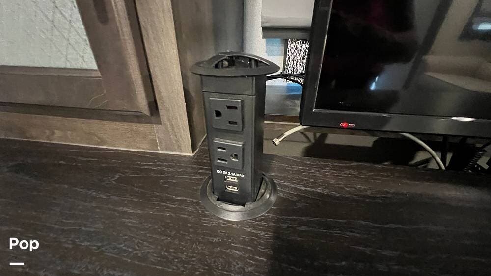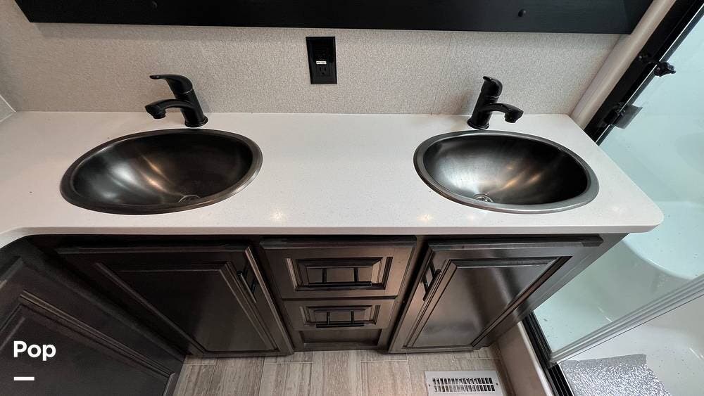 The living area has Allure Collection powered theater seating with massage, two queen-size tri-fold sofa sleepers, plenty of storage space, and an entertainment center with a 50" pop-up TV with sound bar, Jensen stereo, interior/exterior speakers, surround sound, and electric fireplace with remote.