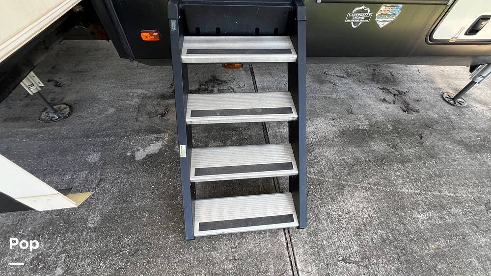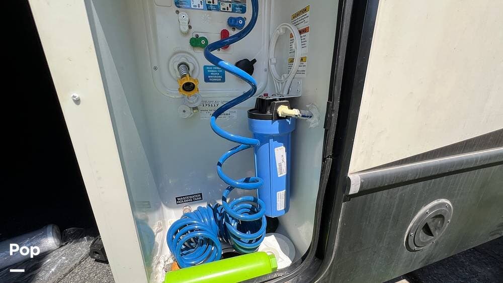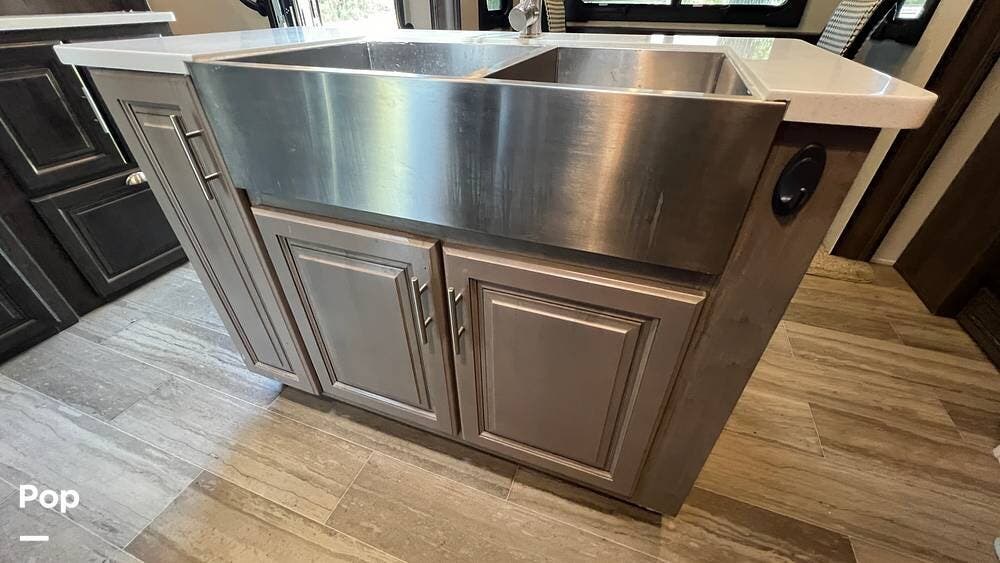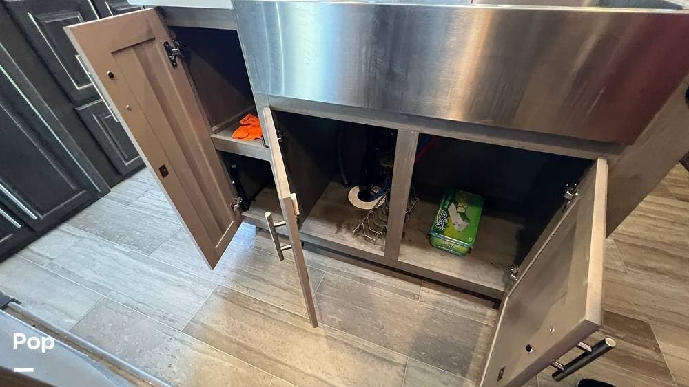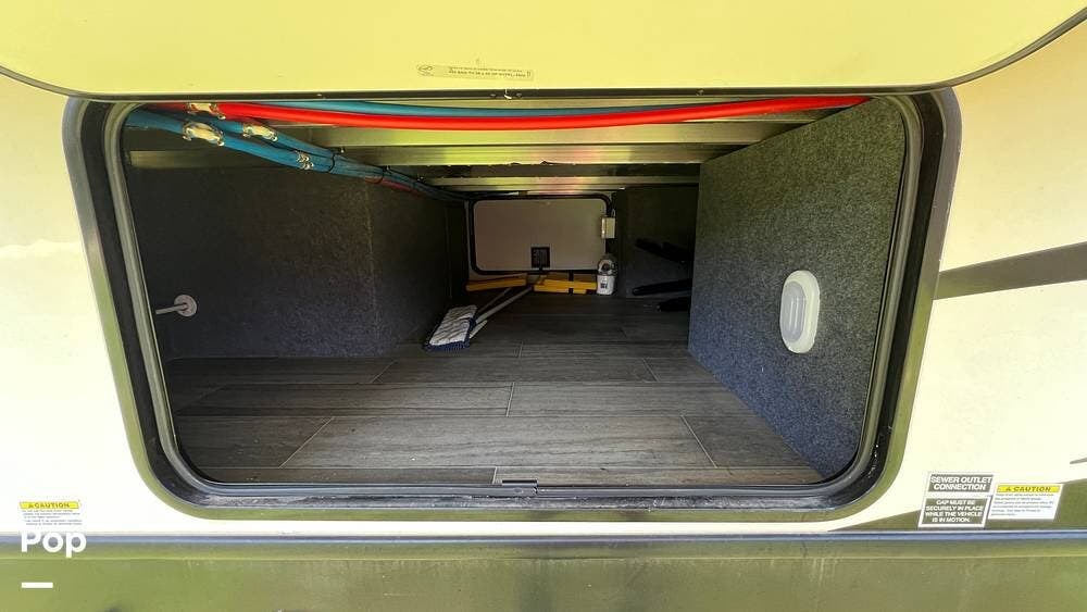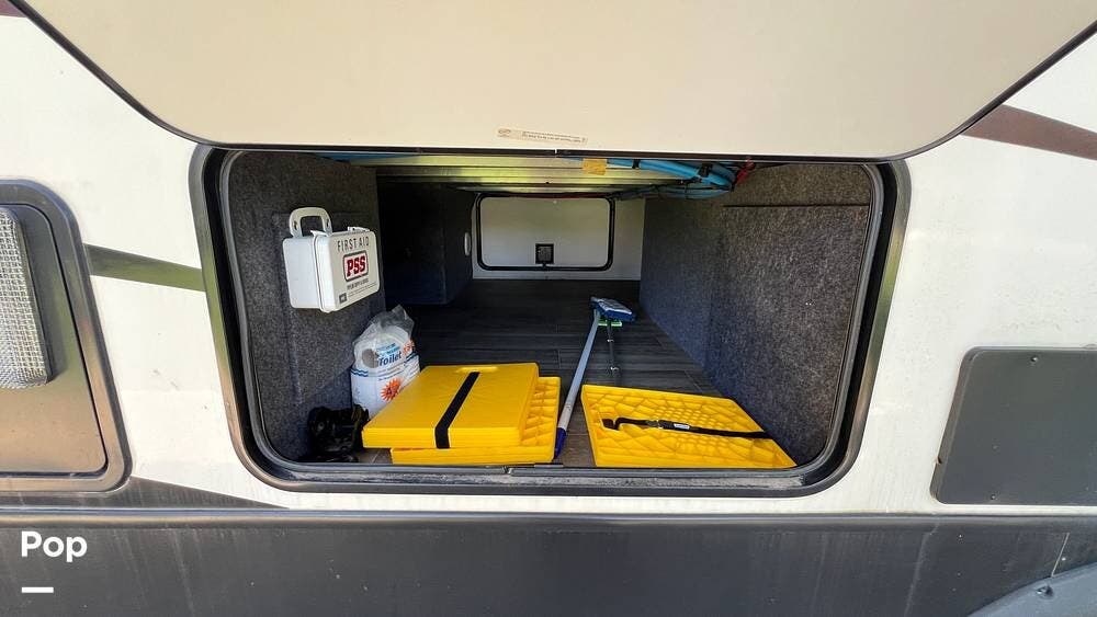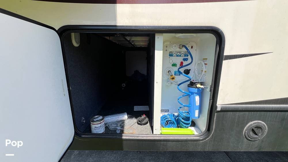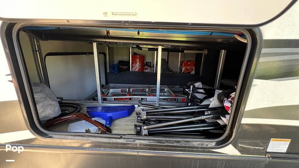 Outside is an enormous amount of pass-through and slide-out storage with lighting, two awnings, automatic leveling, a water filter, and a TV.