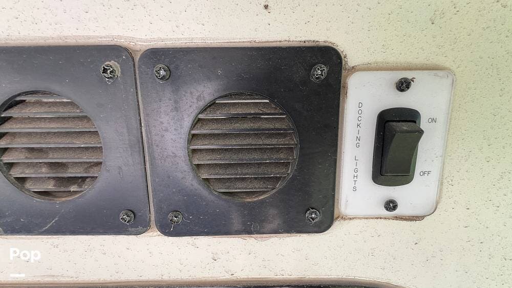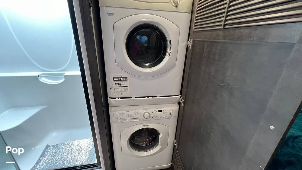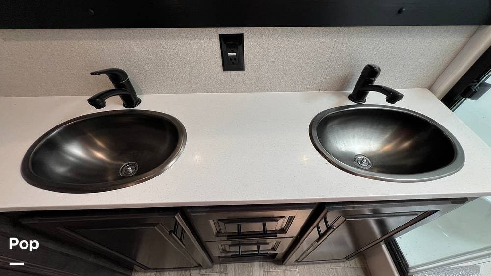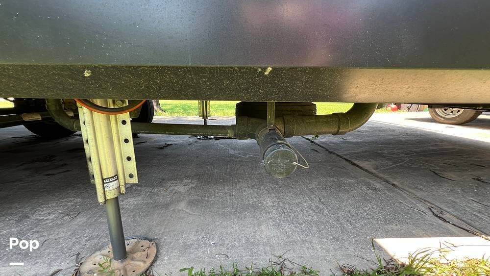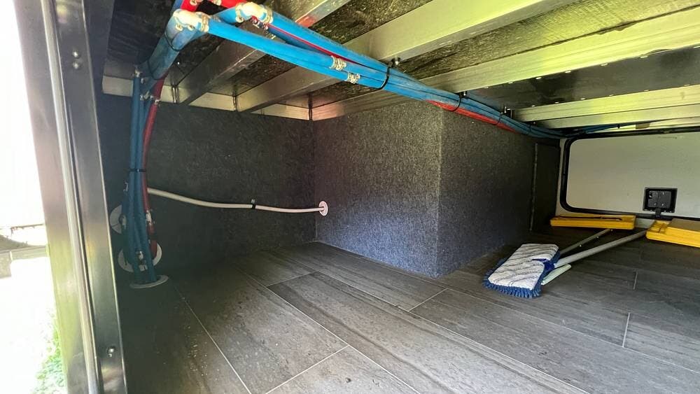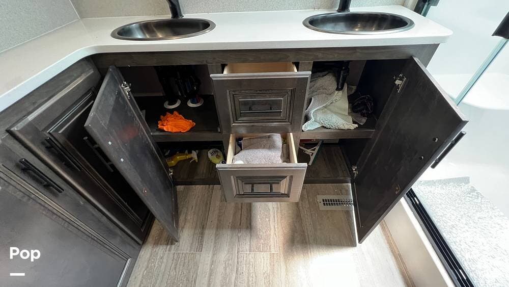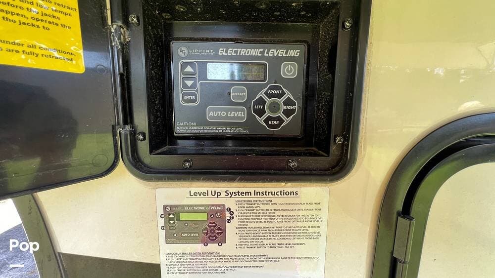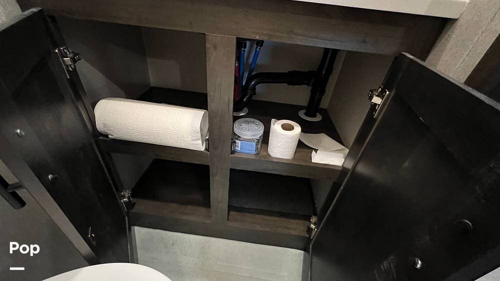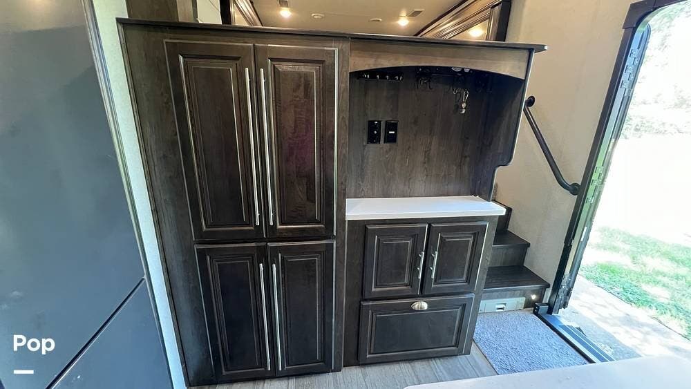 Outside is an enormous amount of pass-through and slide-out storage with lighting, two awnings, automatic leveling, a water filter, and a TV.