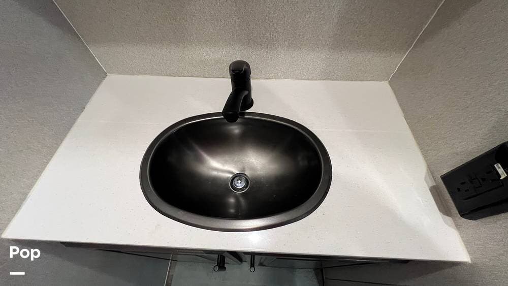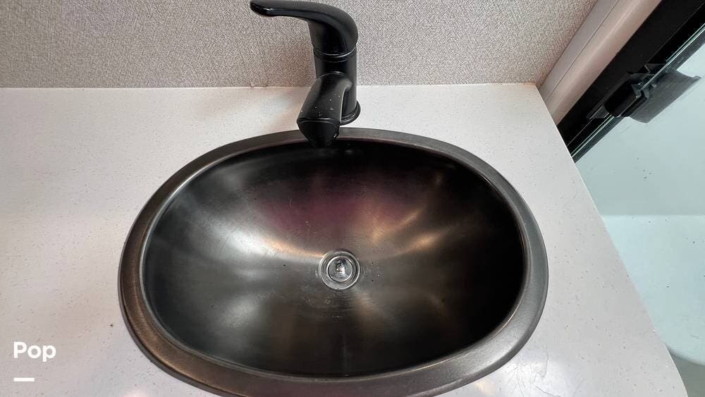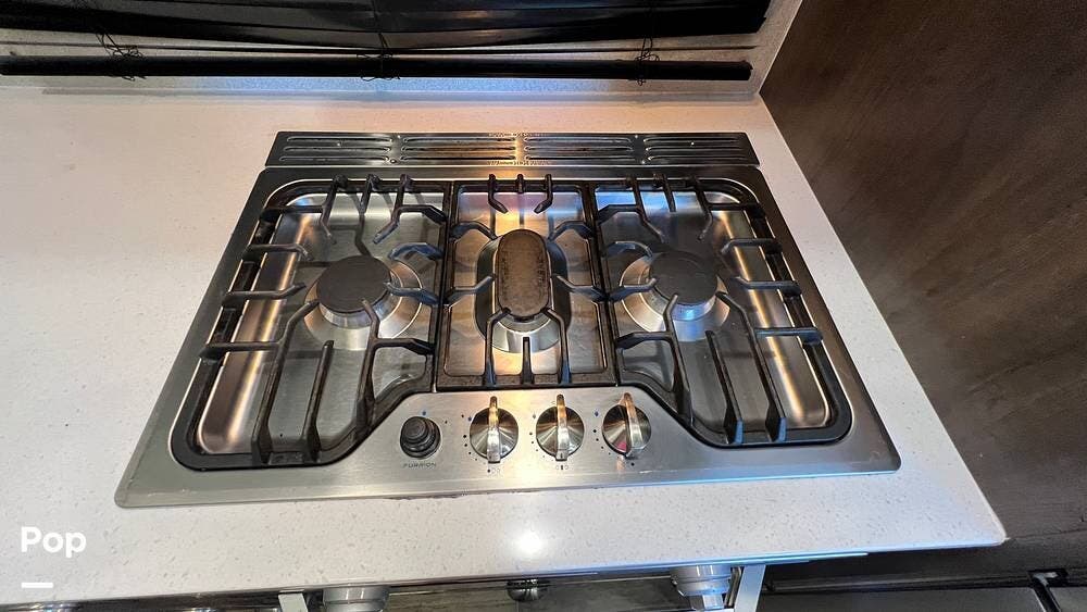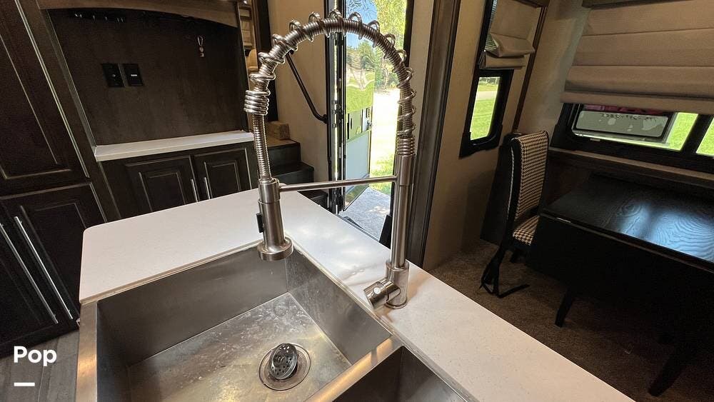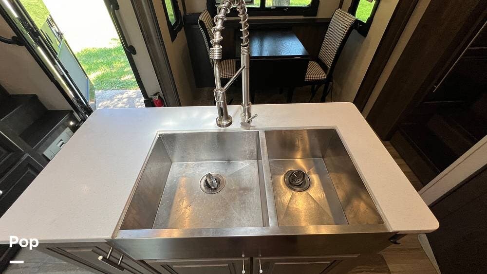 The kitchen has a full-size refrigerator/freezer with ice maker, three-burner stove, oven, microwave/convection oven, residential pantry with pull-out drawers, solid-surface countertops, large Farmhouse Stainless Steel sink with high rise, pull-out faucet, decorative glass cabinets, internal vacuum, extendable dinette with four chairs, and decorative lighting. There is a half bath right off of the kitchen area.