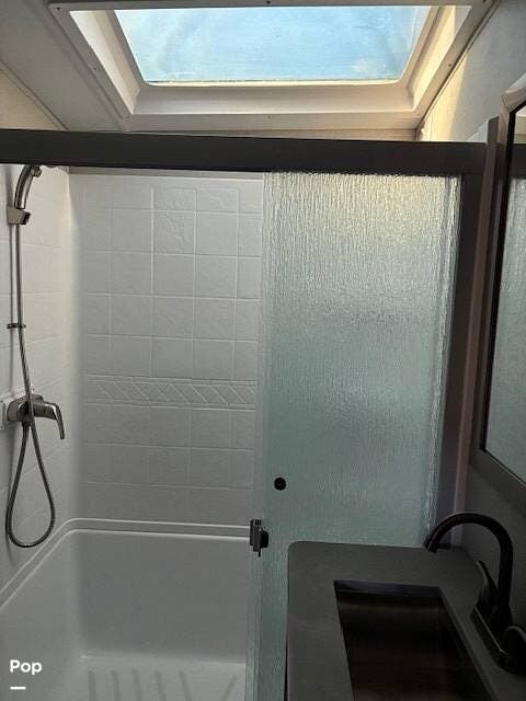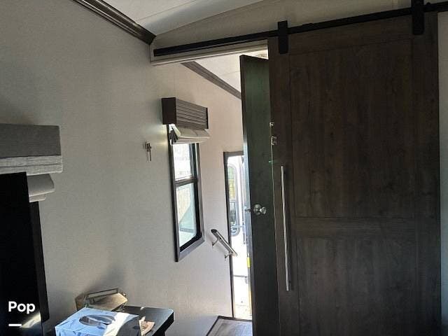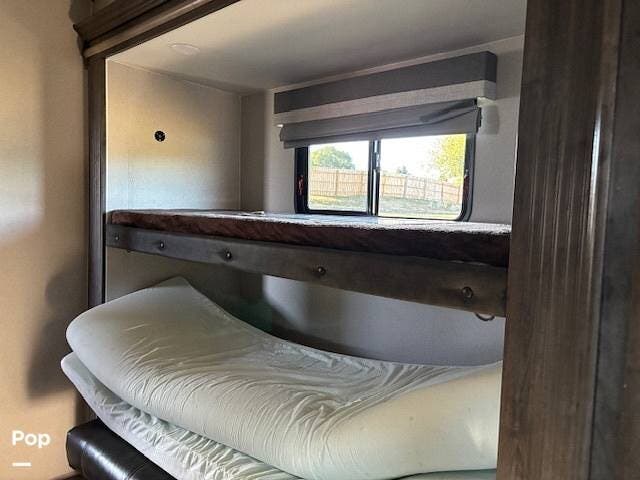 The unit sleeps six, with a large bedroom, a separate bunkhouse with two bunks, and a sleeper sofa.