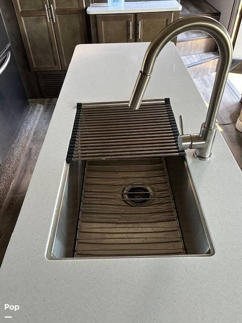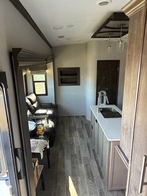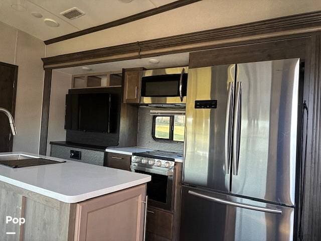 Walking into the 3830BHLE, you'll find a full galley with a kitchen island featuring a large sink, stovetop, oven, microwave, full-size refrigerator/freezer, and a table with 4 chairs.
