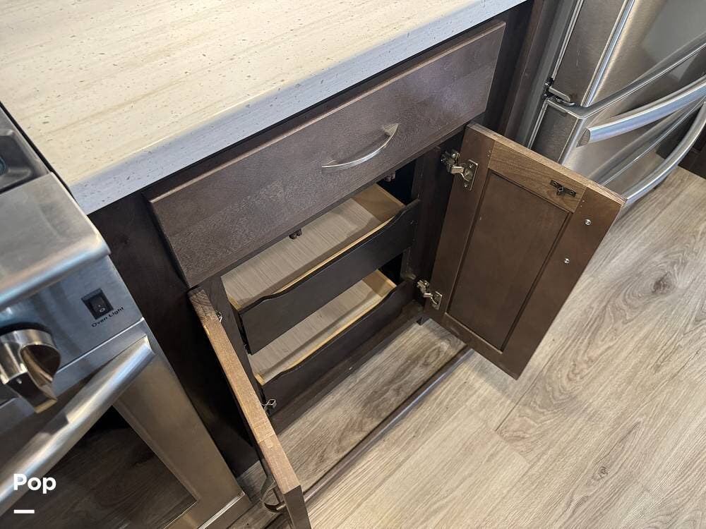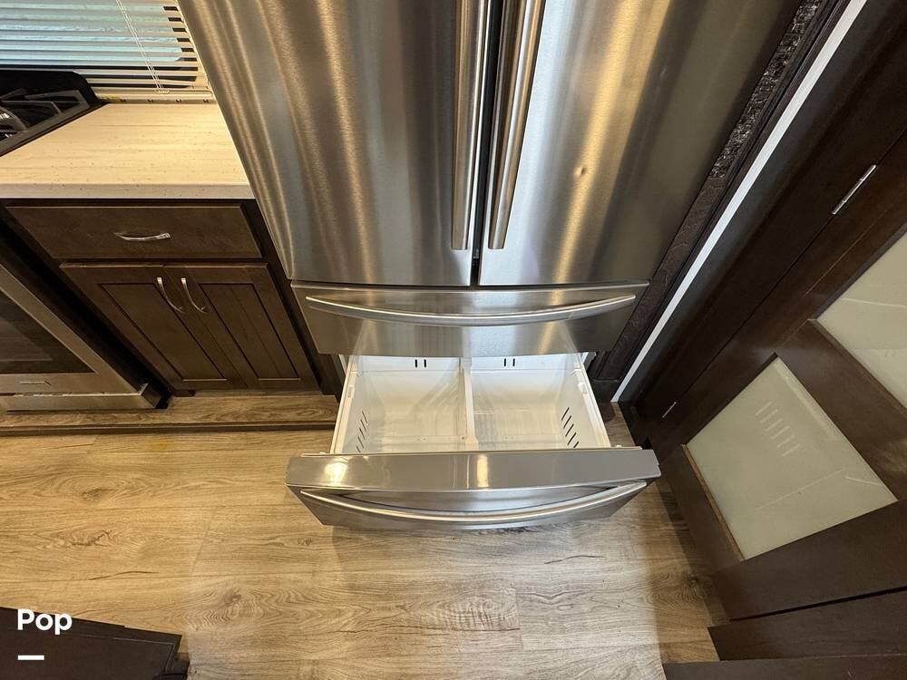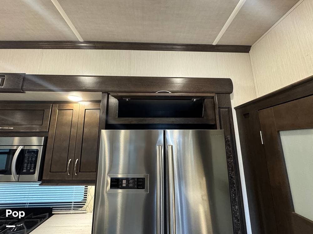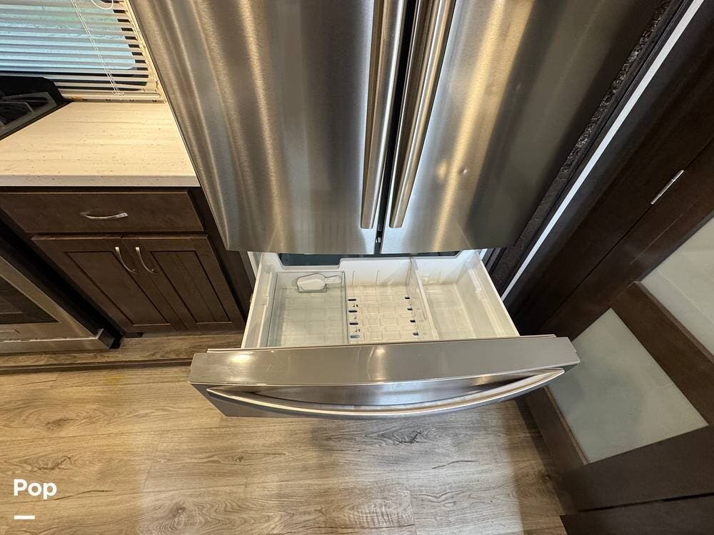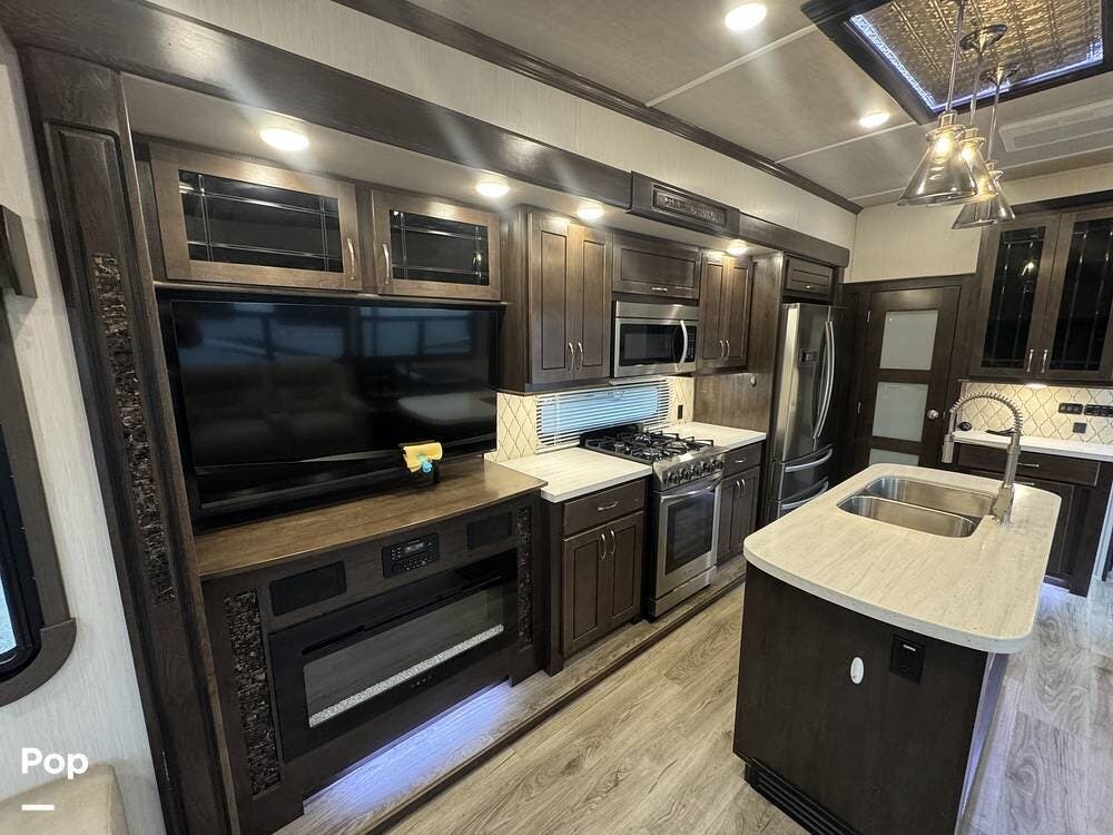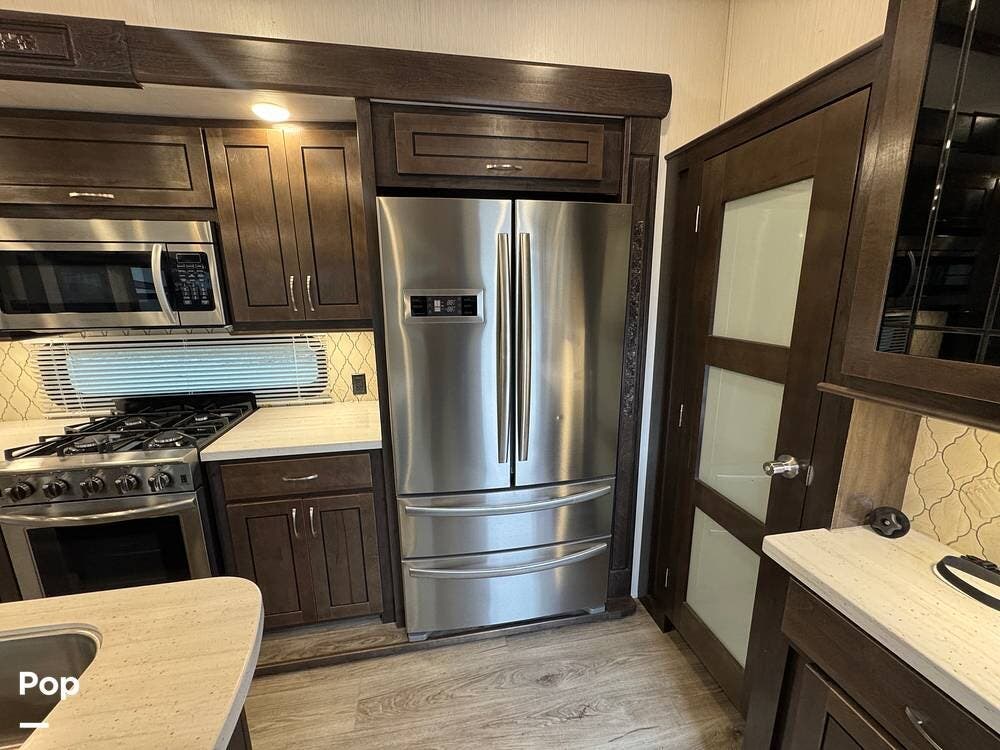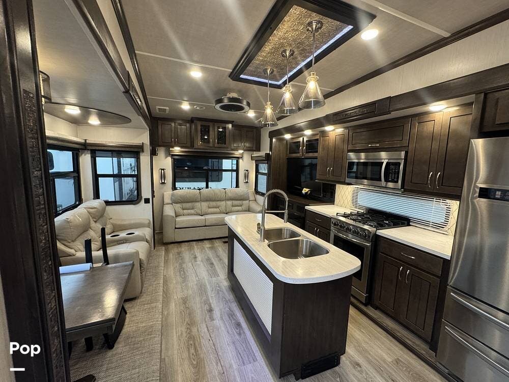 The kitchen is designed for serious cooking and extended living, featuring a large island with solid-surface countertops and an under-mounted stainless steel sink. A residential-style high-rise faucet with pull-out sprayer, full-extension self-closing drawers, and a spacious pantry provide both convenience and storage. The stainless steel residential refrigerator with icemaker and dedicated inverter allows for longer stays without compromise, while the gas range and over-the-range microwave offer the functionality expected in a high-end fifth wheel. A large kitchen window brings in additional light and enhances the open, inviting layout.