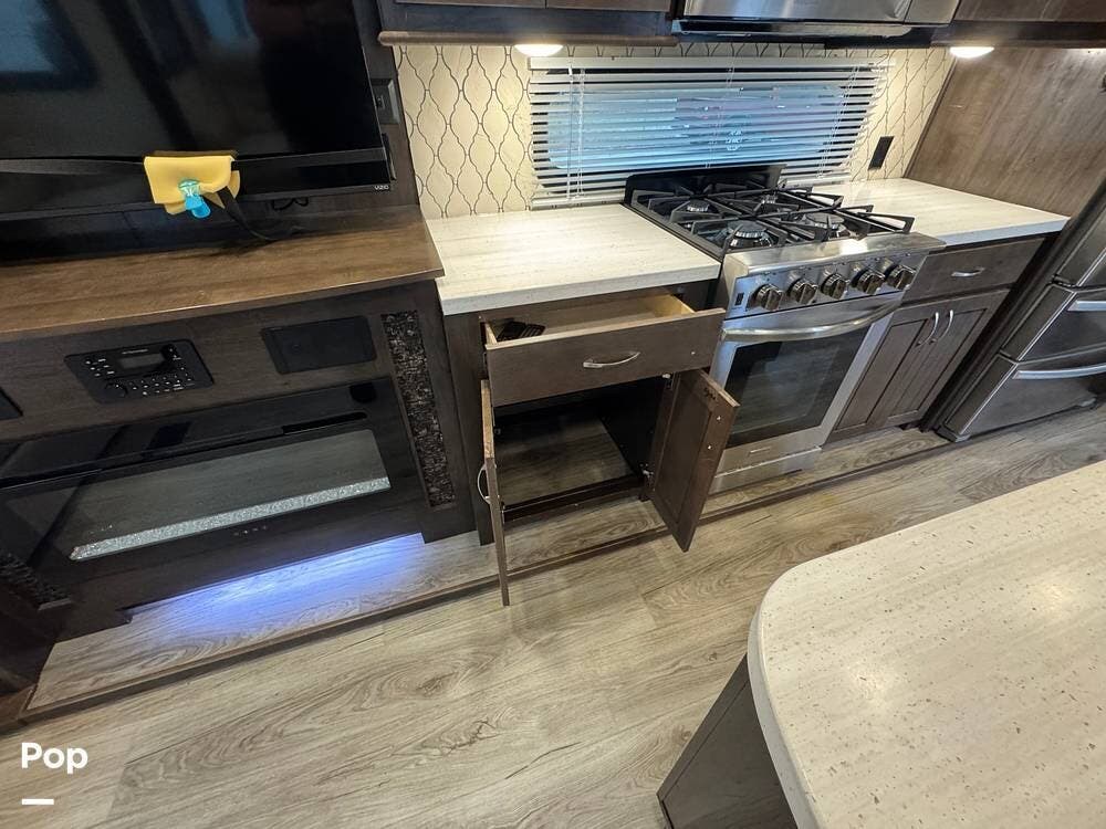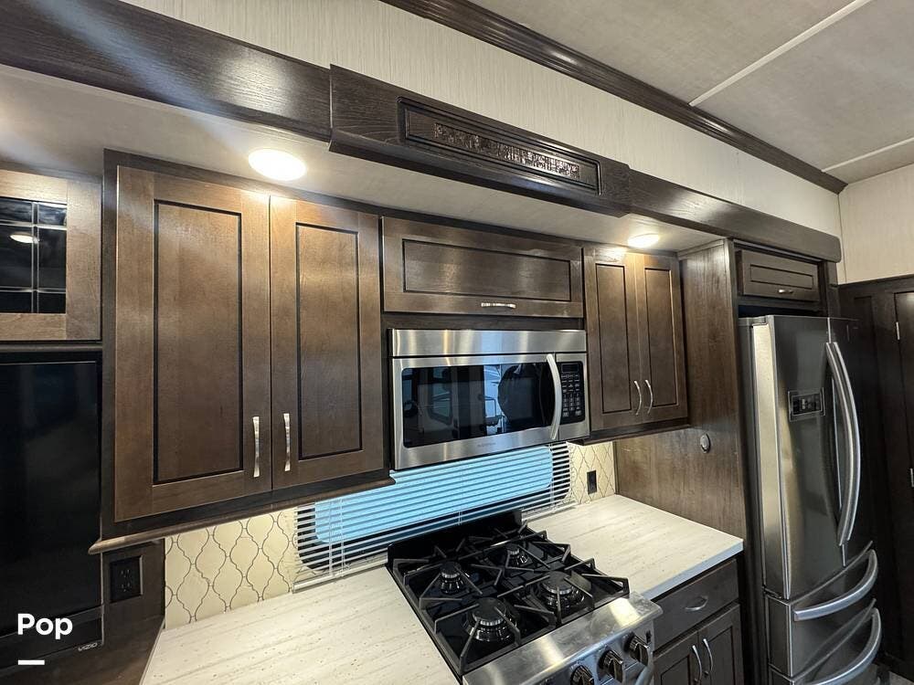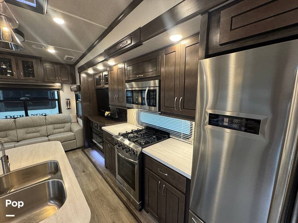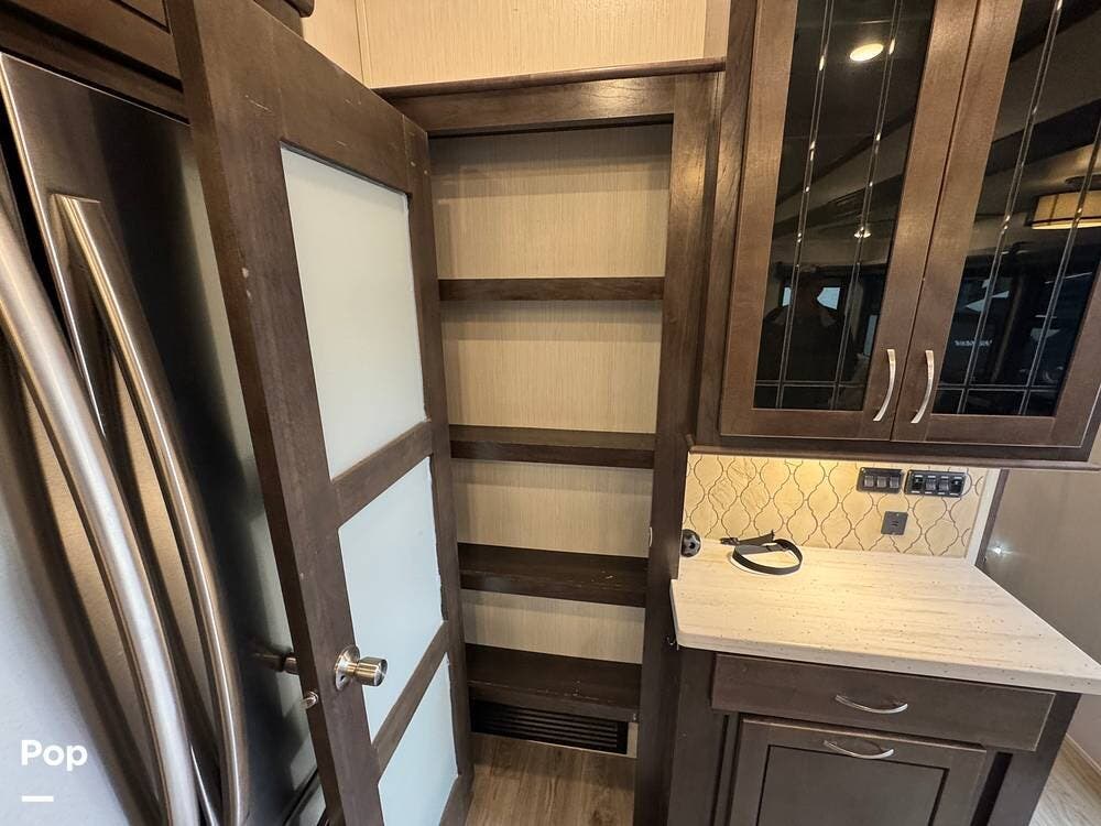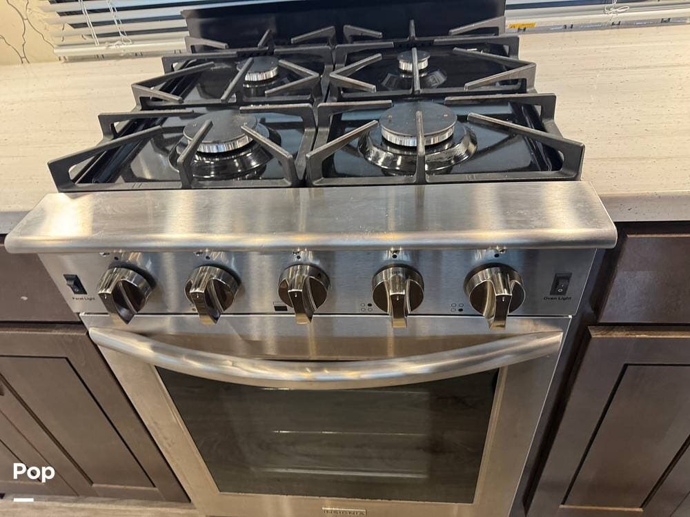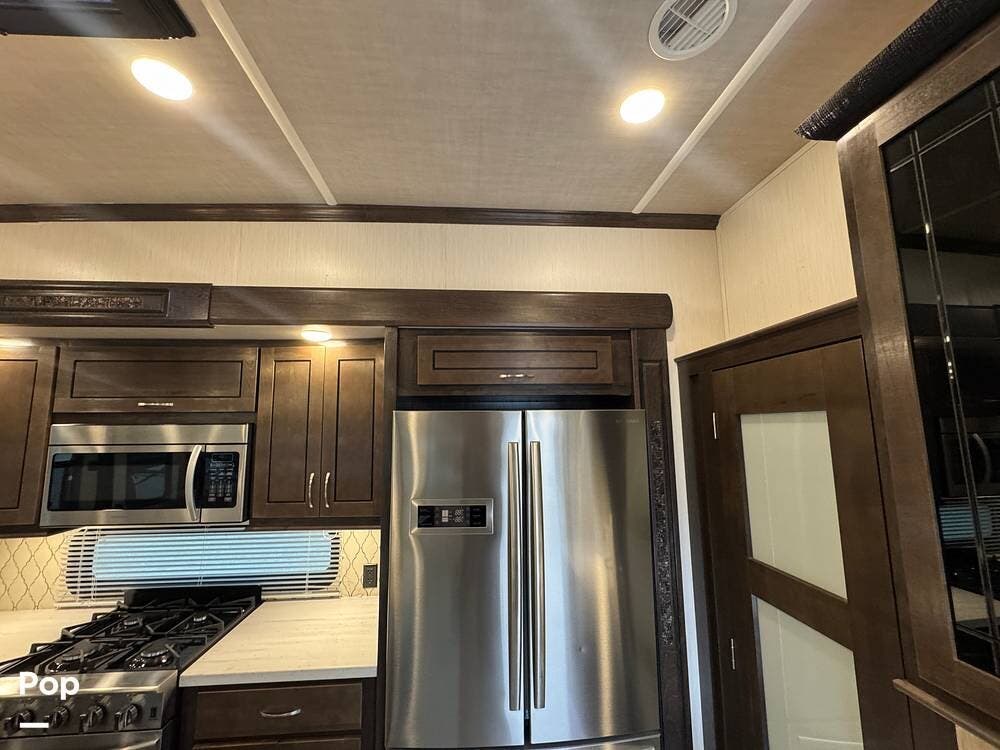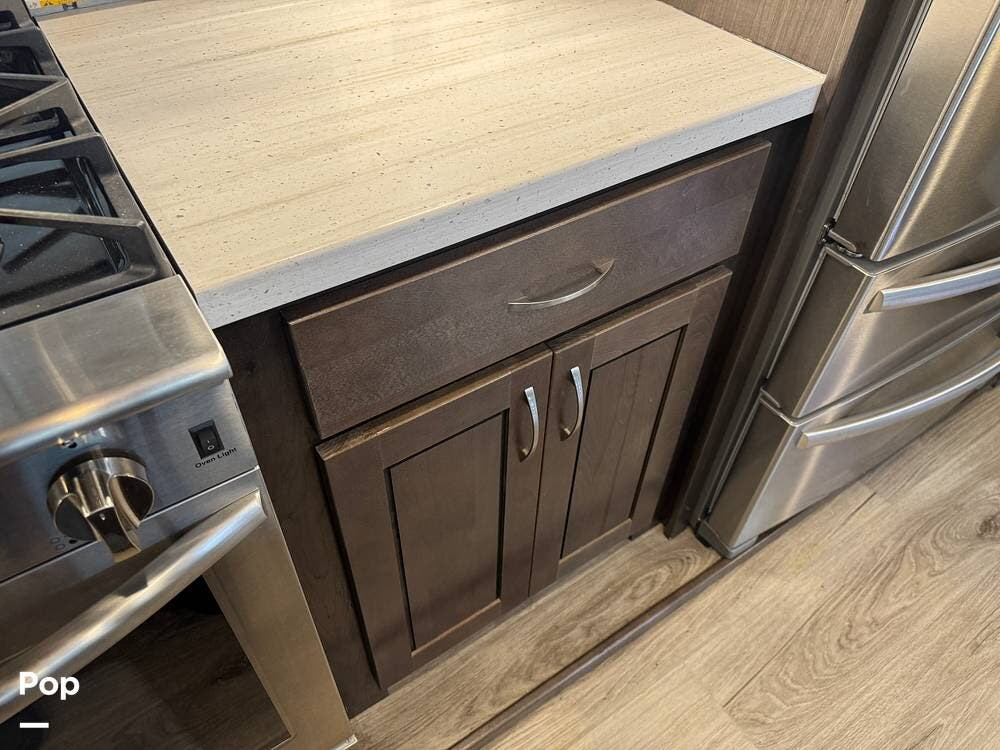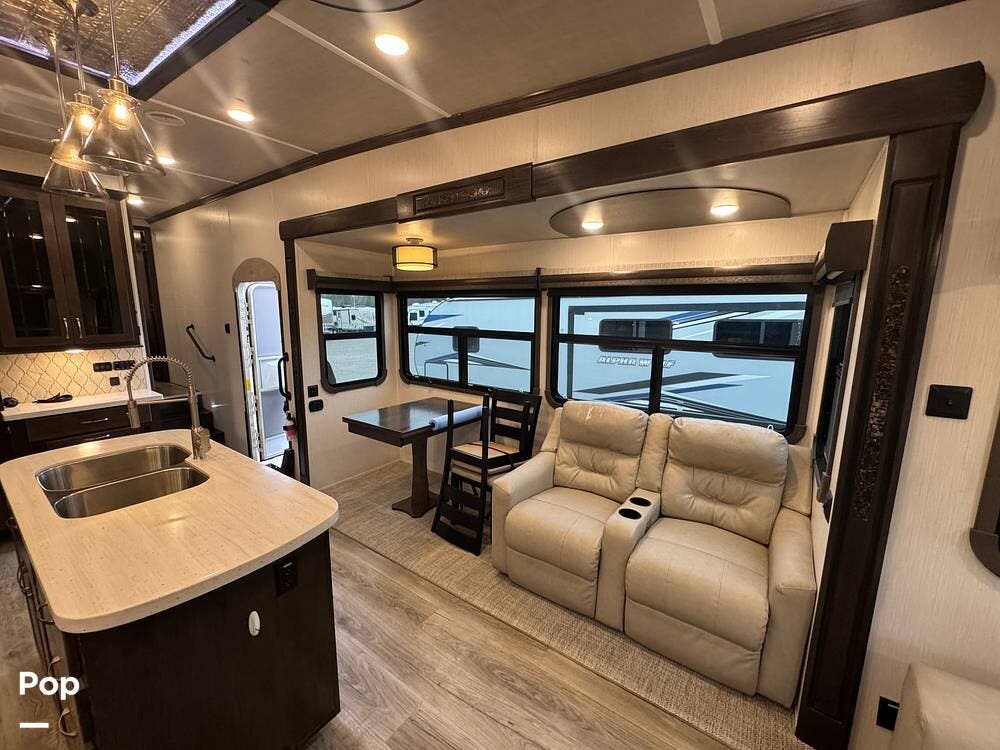 The kitchen is designed for serious cooking and extended living, featuring a large island with solid-surface countertops and an under-mounted stainless steel sink. A residential-style high-rise faucet with pull-out sprayer, full-extension self-closing drawers, and a spacious pantry provide both convenience and storage. The stainless steel residential refrigerator with icemaker and dedicated inverter allows for longer stays without compromise, while the gas range and over-the-range microwave offer the functionality expected in a high-end fifth wheel. A large kitchen window brings in additional light and enhances the open, inviting layout.