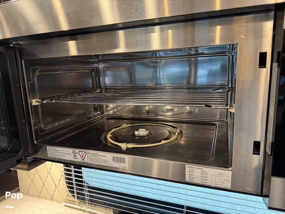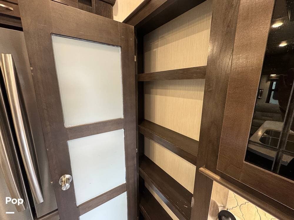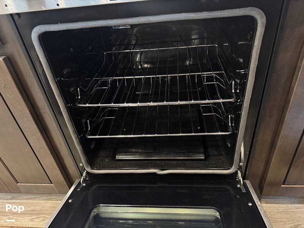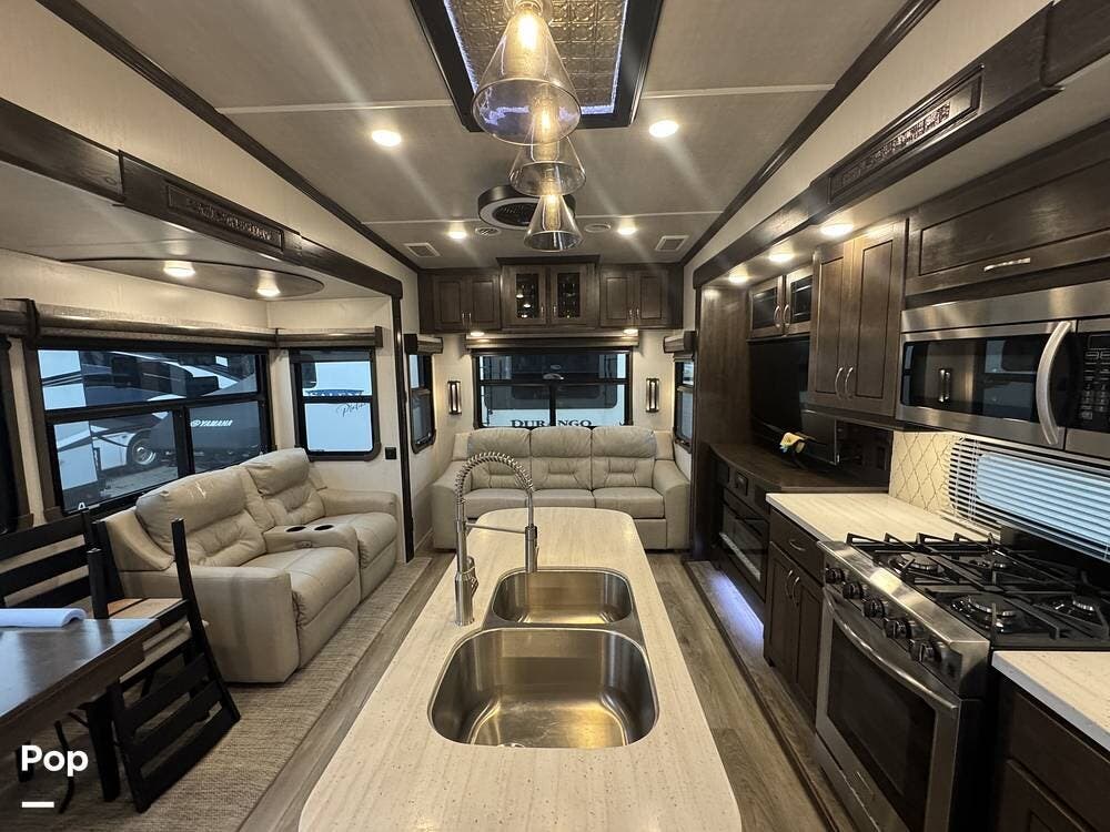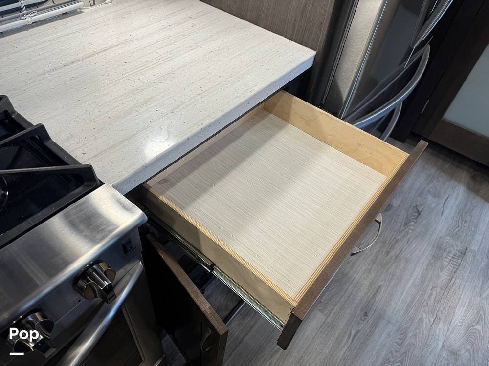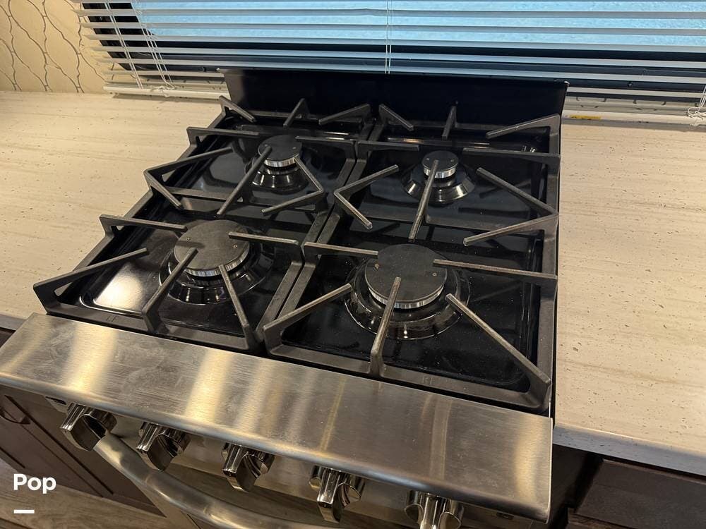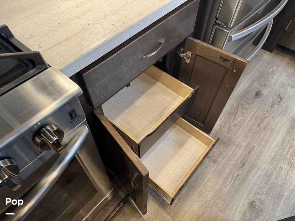 The kitchen is designed for serious cooking and extended living, featuring a large island with solid-surface countertops and an under-mounted stainless steel sink. A residential-style high-rise faucet with pull-out sprayer, full-extension self-closing drawers, and a spacious pantry provide both convenience and storage. The stainless steel residential refrigerator with icemaker and dedicated inverter allows for longer stays without compromise, while the gas range and over-the-range microwave offer the functionality expected in a high-end fifth wheel. A large kitchen window brings in additional light and enhances the open, inviting layout.