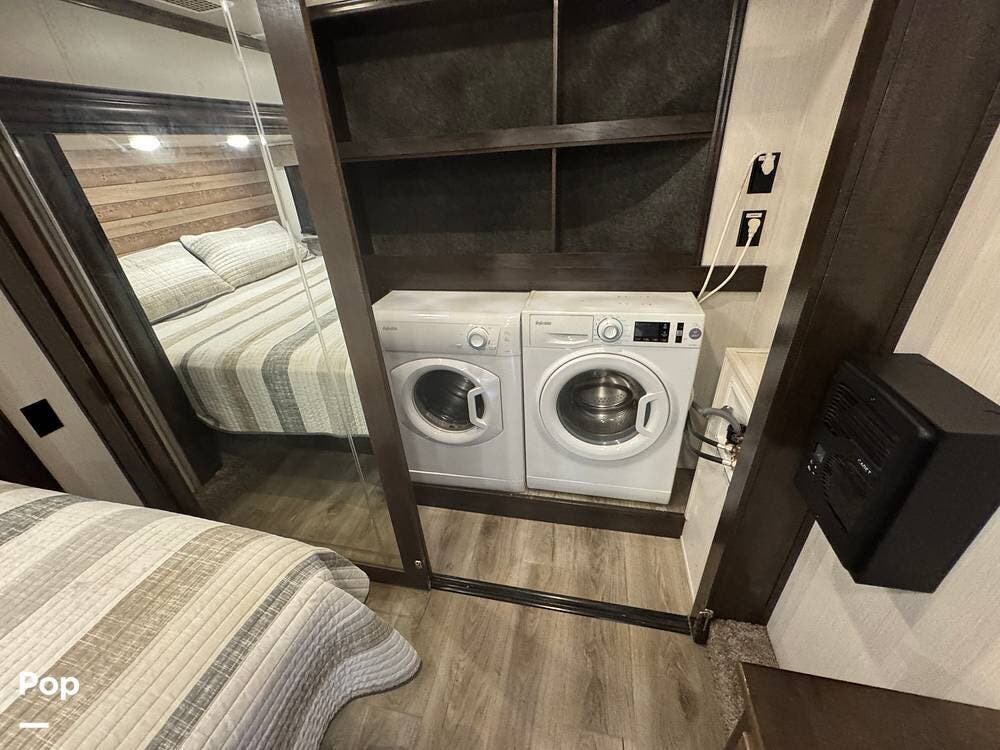 The forward bedroom offers a quiet and comfortable retreat, anchored by a king-size bed with a residential headboard and quality bedding. Blackout night shades allow for restful sleep, while USB charging ports on both sides of the bed add everyday convenience. The front wardrobe provides generous storage and has been upgraded with a washer and dryer that were added after the original sale, making this unit especially appealing for full-time living or extended stays. Additional under-bed storage further enhances the space's usability.
