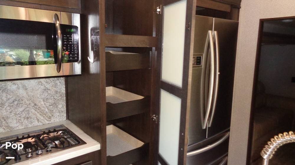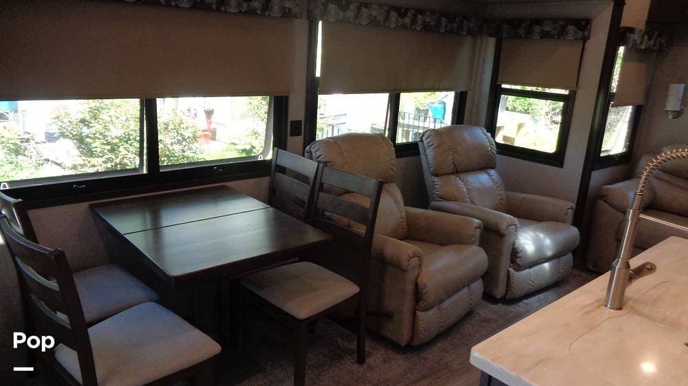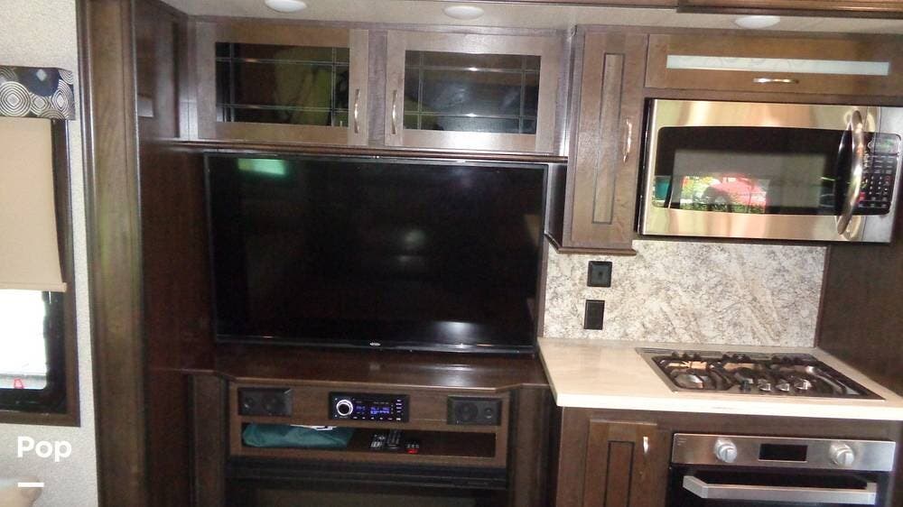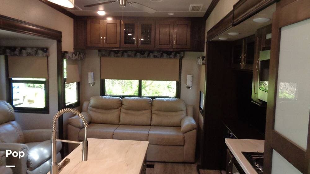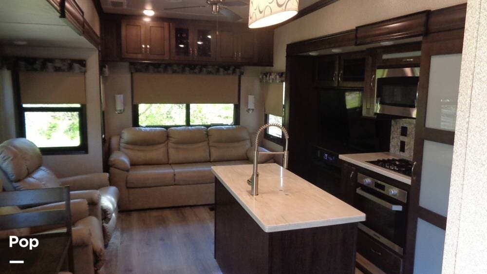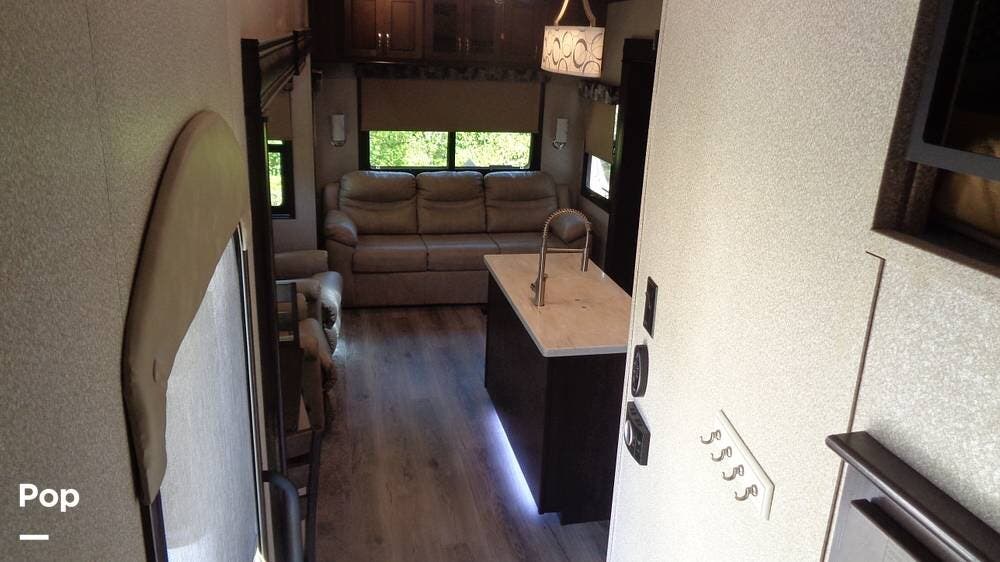This fifth wheel has a sleeping capacity for at least eight people and dual roof-mounted AC units that keep you cool on the hottest days. The unit also has an electric fireplace that can be used for heating or just ambiance. All these and more make this fifth-wheel one you want to check out!