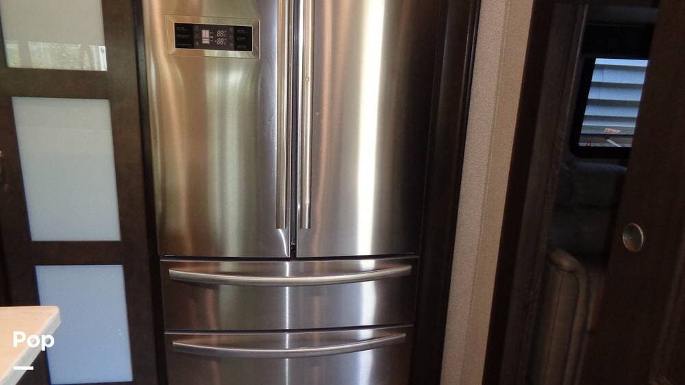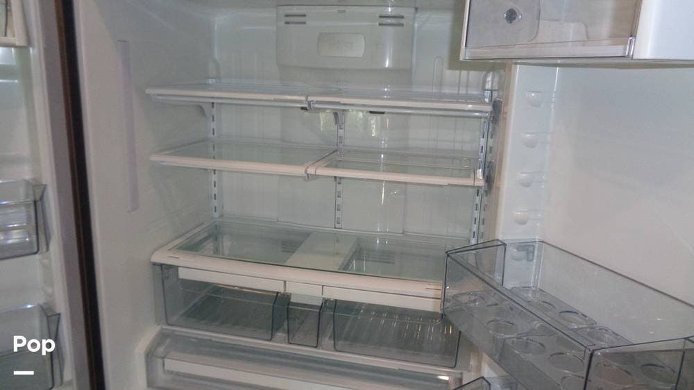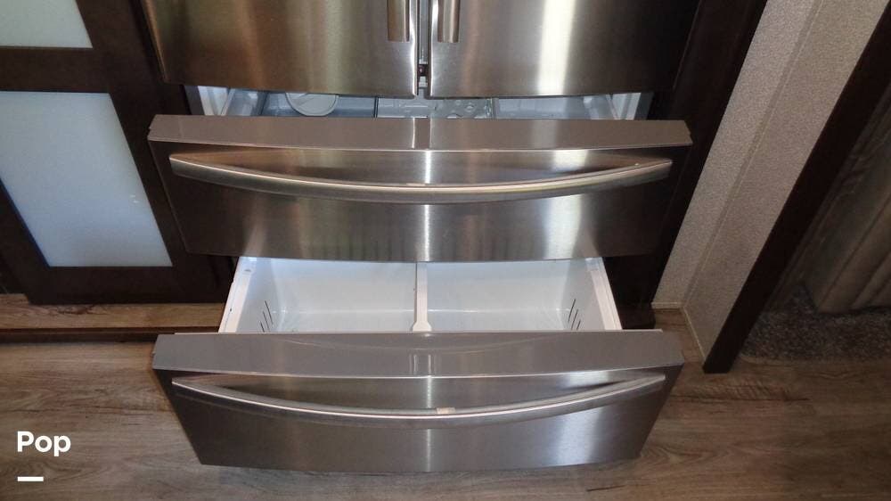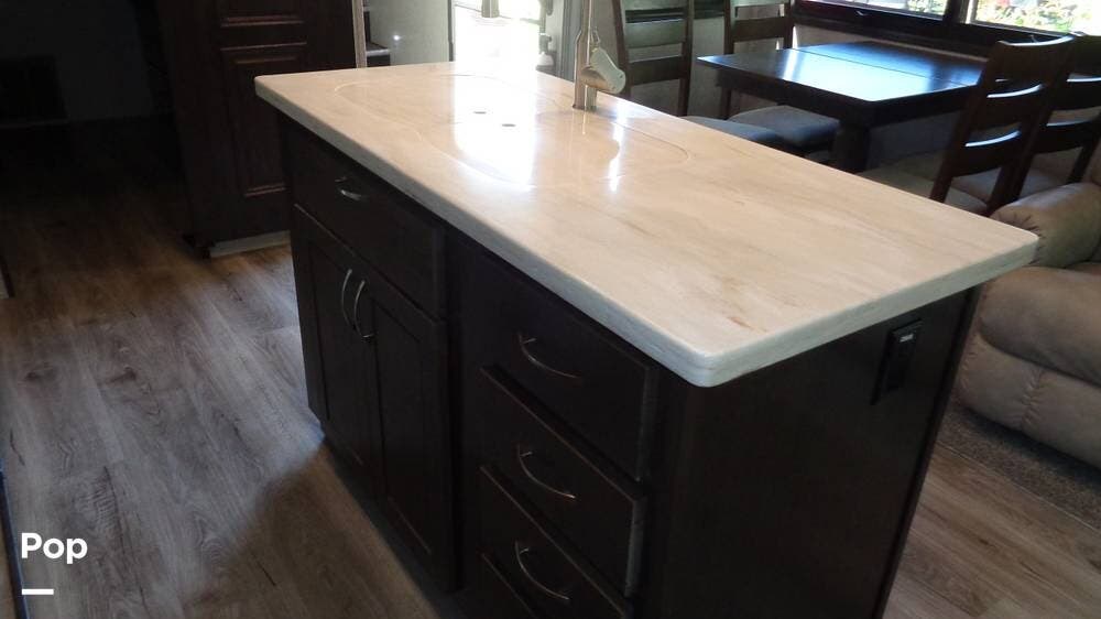 The galley has a microwave with a hood vent underneath and a 3-burner stove with a glass cover. The large double kitchen sink has a pull-out gooseneck faucet. The sink has covers that match the solid surface countertop, giving you extra space for prepping food. The kitchen island can also be extended to give you even more space in the kitchen. The large, three-door, stainless steel refrigerator is great for entertaining or just a quick drink. There are plenty of cabinets above and below the countertop for storage space. The pantry is great for storage as well. The kitchen table and chairs are an excellent space for family meals and game nights.