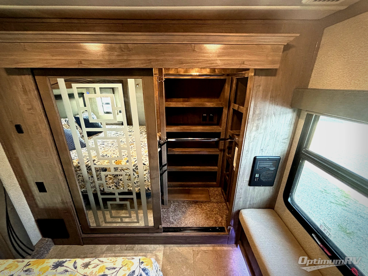 This fifth wheel is the perfect couple's coach to enjoy traveling the countryside with or setting up home base for awhile longer at your favorite location. From the three spacious slide outs for increased interior space, to the theater seats directly across from the fireplace, you will feel right at home! The kitchen island has a double sink, extra counter space, plus you can add an optional dishwasher which will speed up the clean-up process. Enjoy your meals at the free-standing dinette, and at night head up the stairs to the private front bedroom where you will find a king bed, a full-length wardrobe for your clothes, plus there is a spot that has been prepped for a washer and dryer so that you can easily keep up with the laundry while you are away from home!