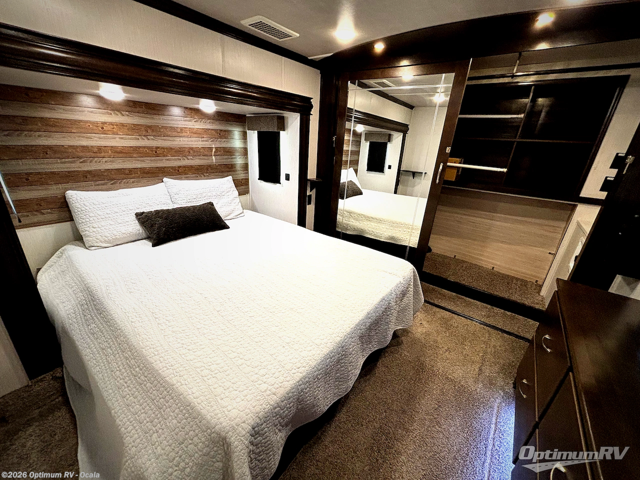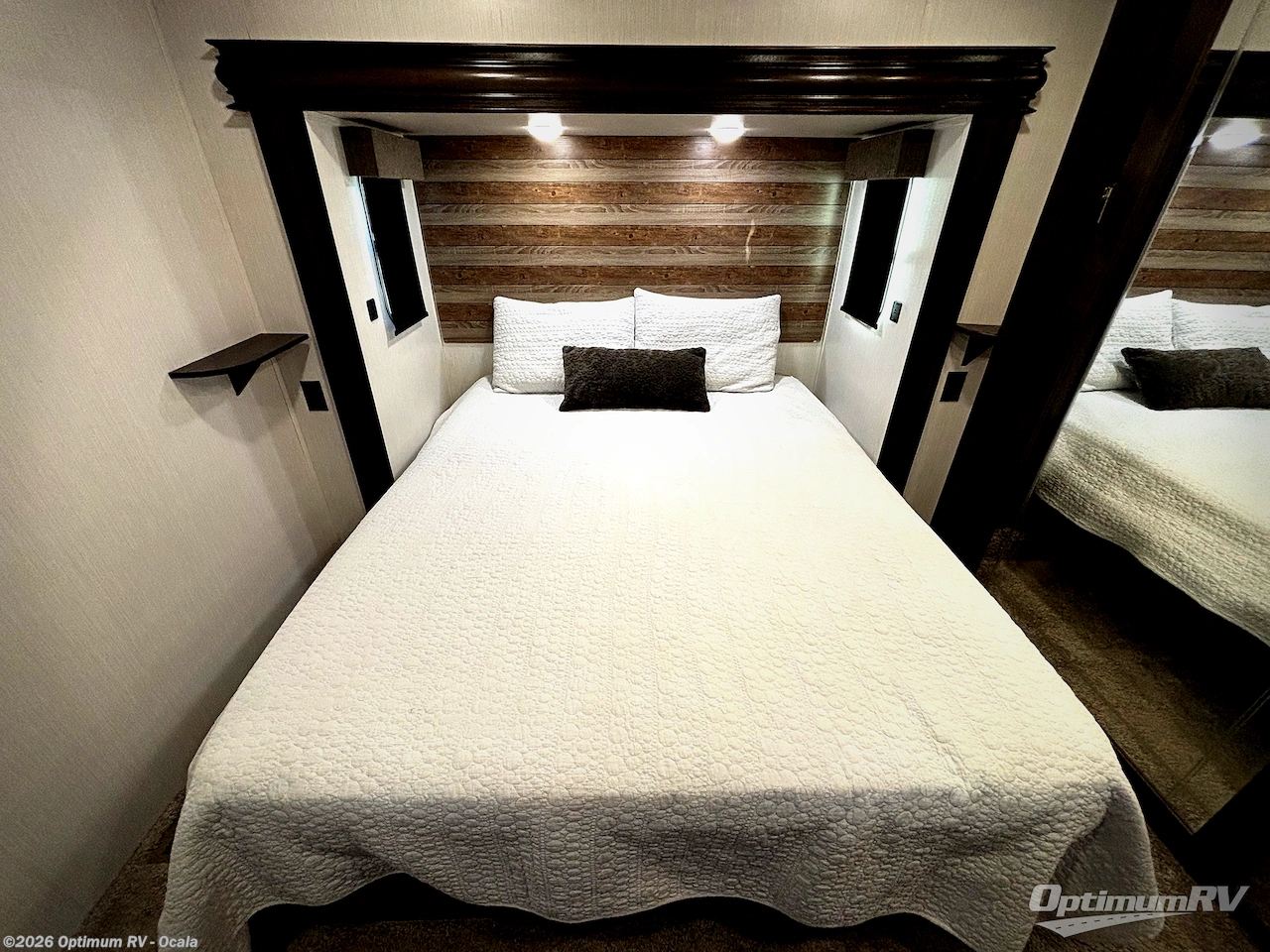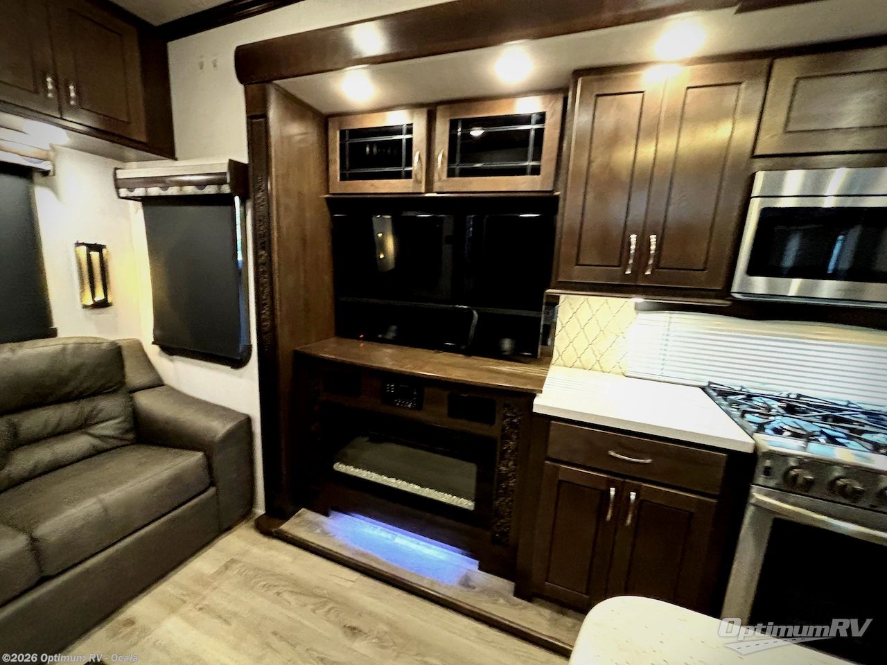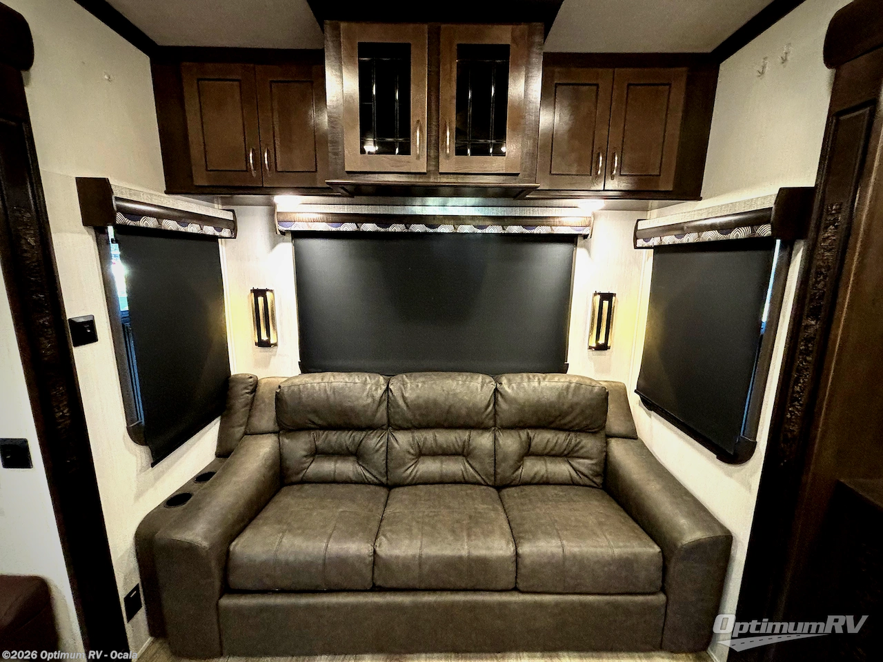 RV living can include all the "must haves" when you own this fifth wheel. Imagine relaxing in the master bedroom with a residential style headboard and luxurious bedding decor, your phones are charging in the USB plug-ins on each side of the king bed, and you are making plans for the day. Someone can be showering in the full bathroom or getting ready using the trough sink with double basin. The living area offers theater seating, a hide-a-bed sofa, and you can work or dine at the free standing table with four chairs. You will enjoy even more features such as the fireplace, the kitchen island, and the option to add an exterior pull-out kitchen with TV, and/or a washer and dryer.