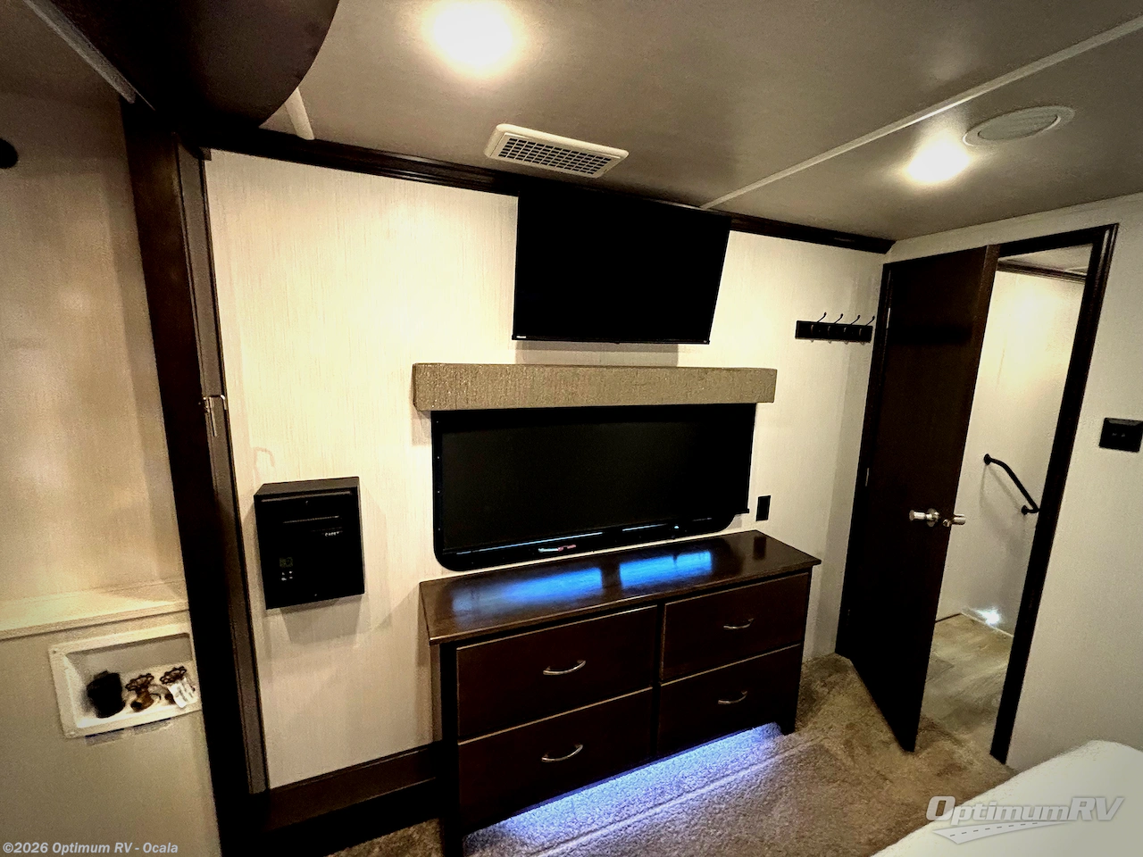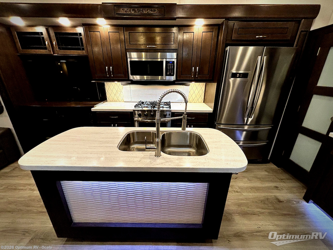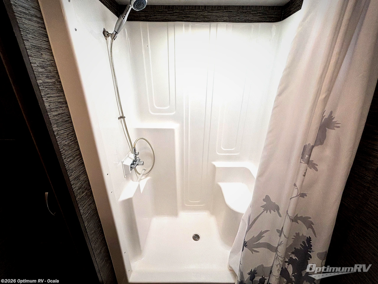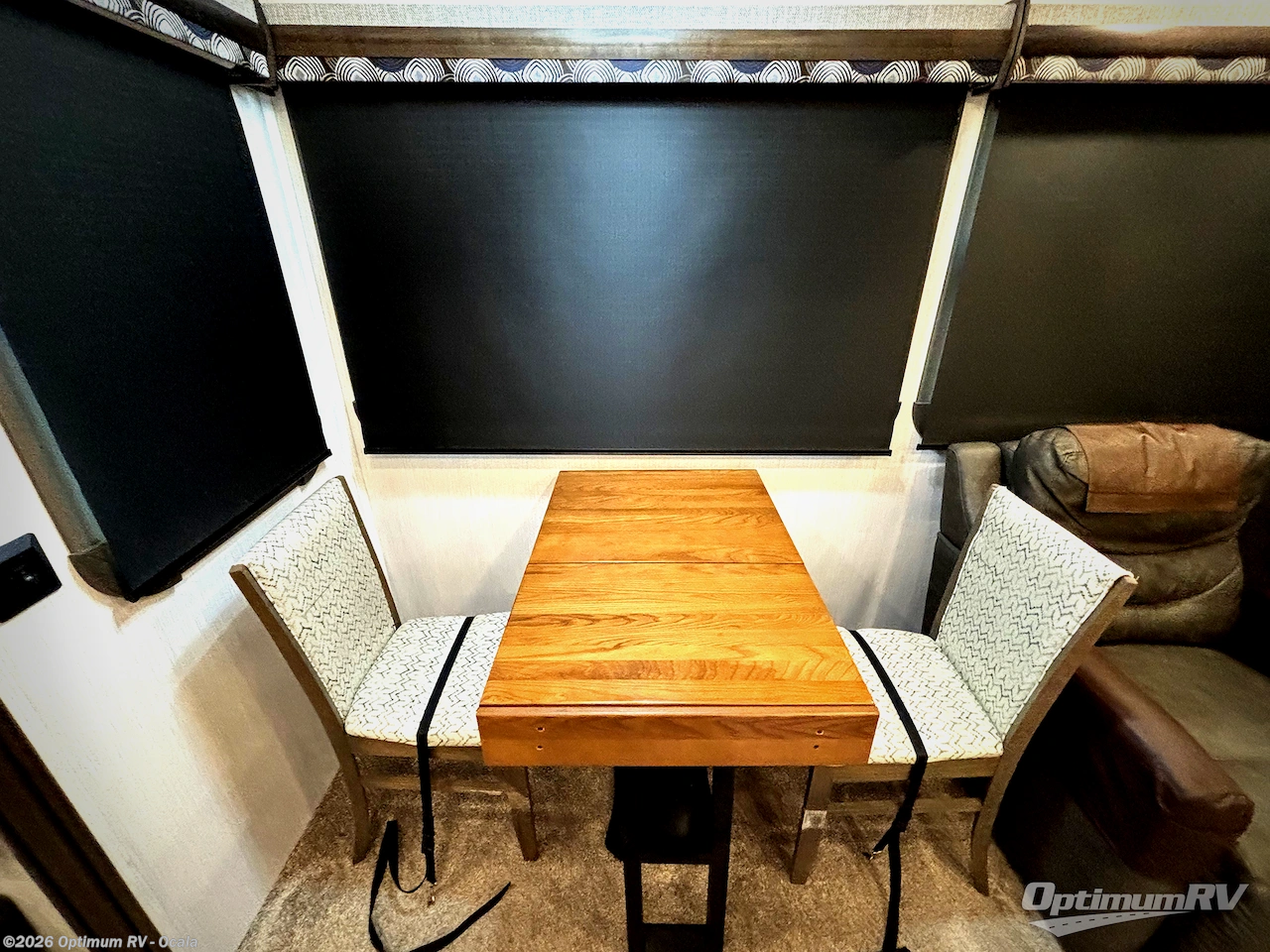 RV living can include all the "must haves" when you own this fifth wheel. Imagine relaxing in the master bedroom with a residential style headboard and luxurious bedding decor, your phones are charging in the USB plug-ins on each side of the king bed, and you are making plans for the day. Someone can be showering in the full bathroom or getting ready using the trough sink with double basin. The living area offers theater seating, a hide-a-bed sofa, and you can work or dine at the free standing table with four chairs. You will enjoy even more features such as the fireplace, the kitchen island, and the option to add an exterior pull-out kitchen with TV, and/or a washer and dryer.