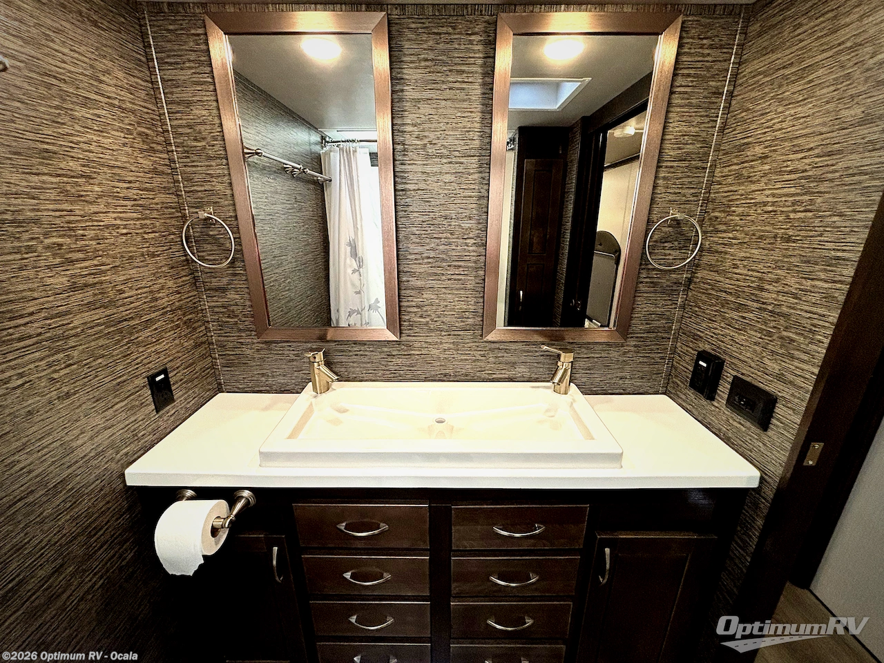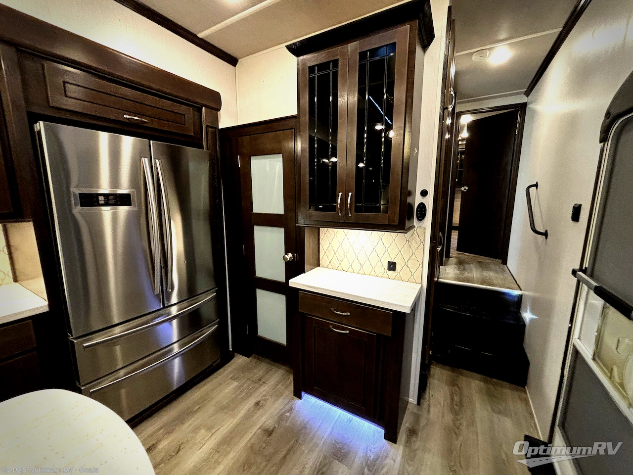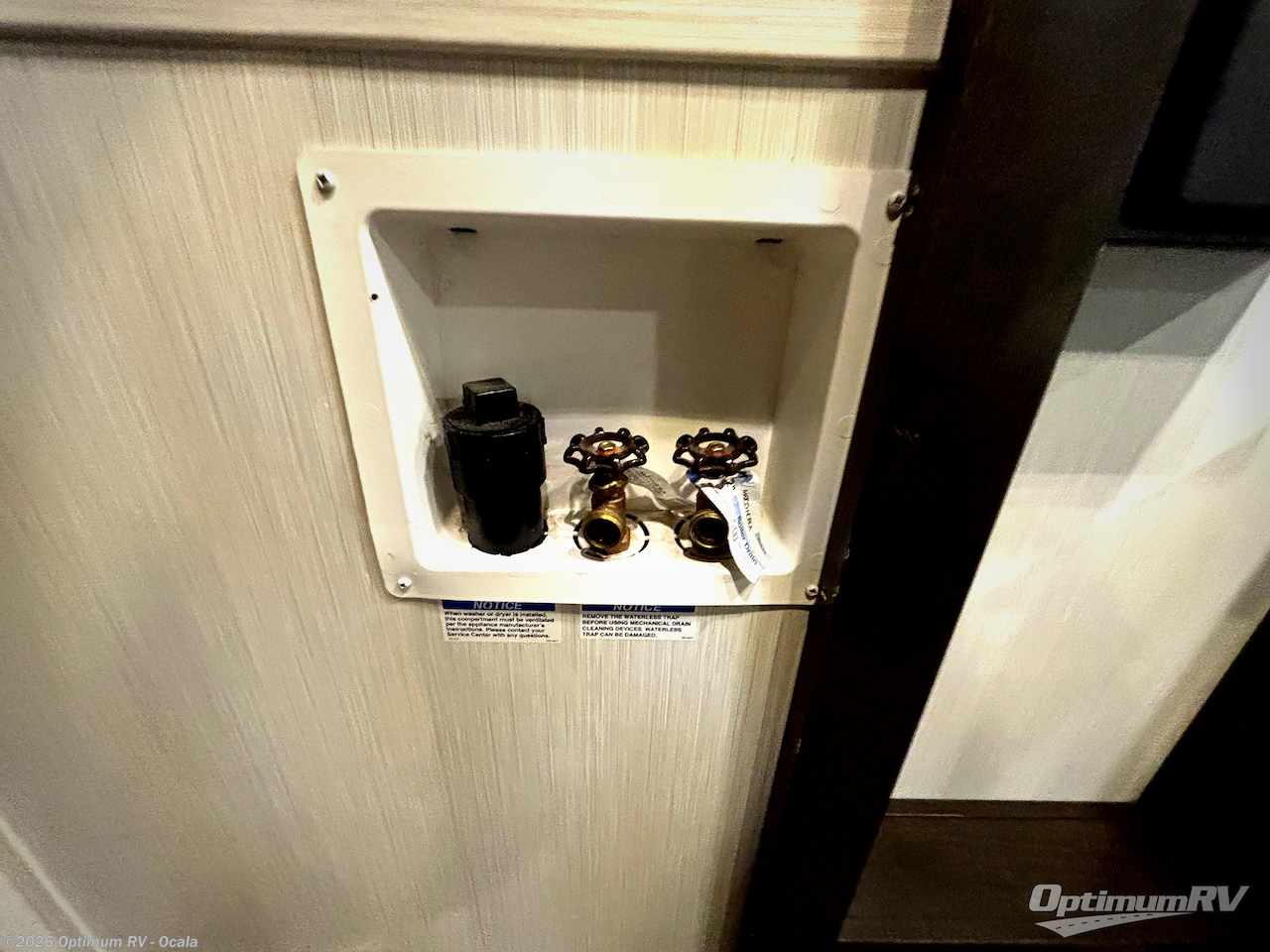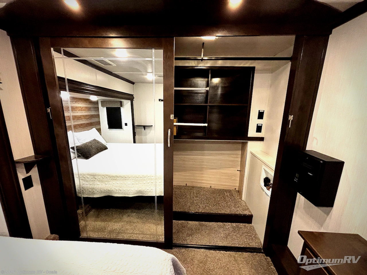 RV living can include all the "must haves" when you own this fifth wheel. Imagine relaxing in the master bedroom with a residential style headboard and luxurious bedding decor, your phones are charging in the USB plug-ins on each side of the king bed, and you are making plans for the day. Someone can be showering in the full bathroom or getting ready using the trough sink with double basin. The living area offers theater seating, a hide-a-bed sofa, and you can work or dine at the free standing table with four chairs. You will enjoy even more features such as the fireplace, the kitchen island, and the option to add an exterior pull-out kitchen with TV, and/or a washer and dryer.
