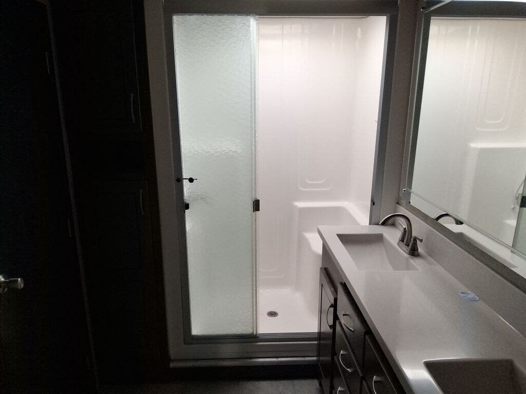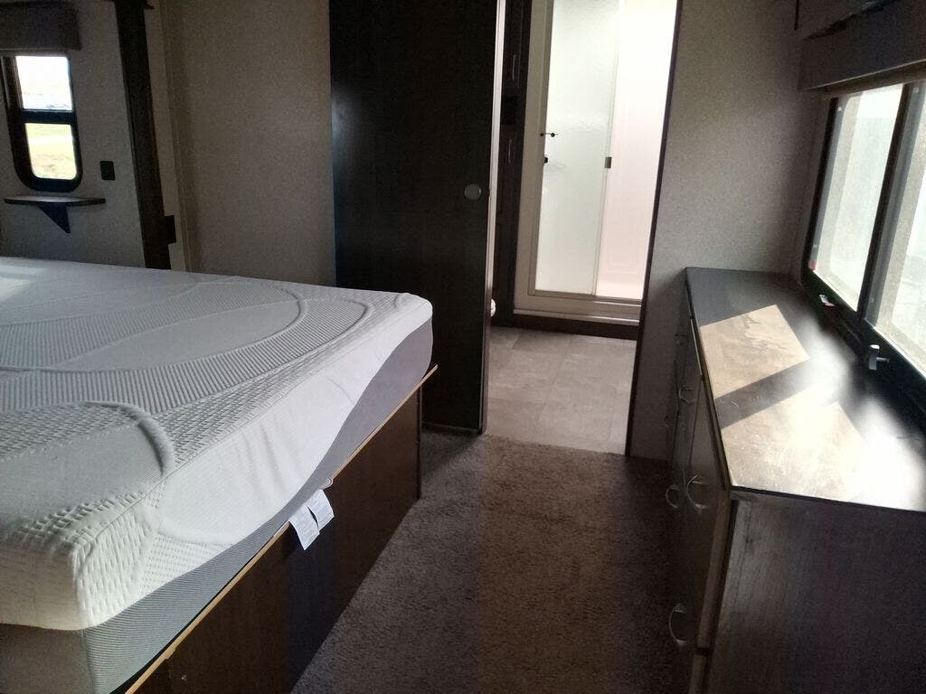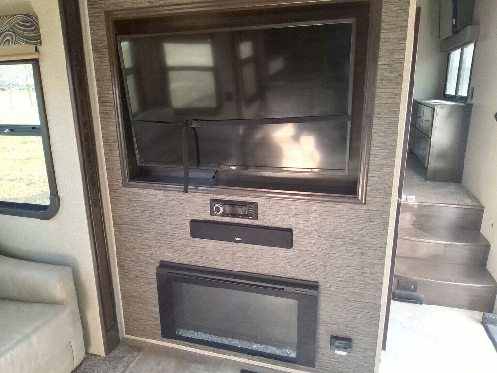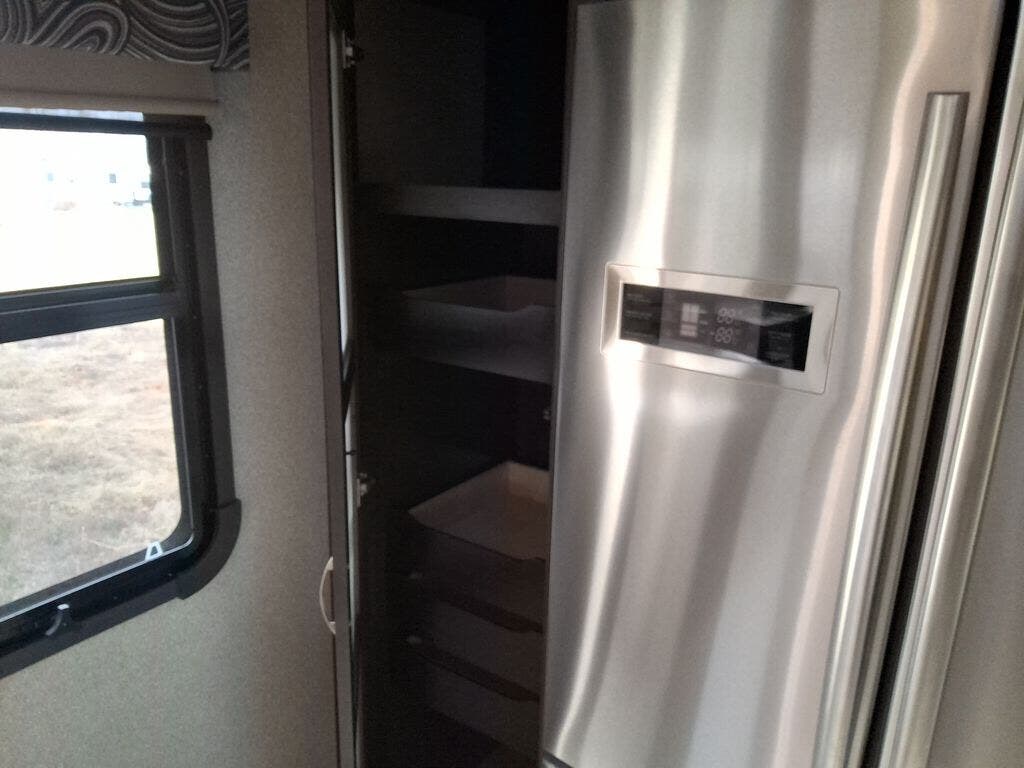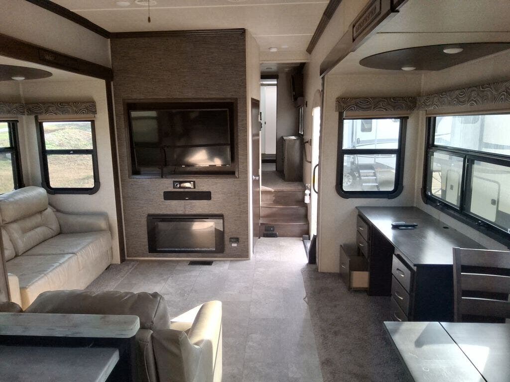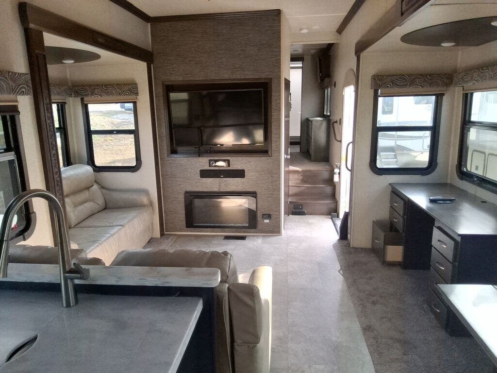 The chef in the family will love the rear kitchen offering lots of counter space and everything needed to stay fed for days thanks to the 20 cu. ft. refrigerator with icemaker, and the pantry. And there is an optional exterior pull-out kitchen with TV option if you would like to add that feature for future use. You can dine at the free standing dinette with four chairs, and complete some work at the desk with great views of your campsite out of the windows. The living area offers a hide-a-bed sofa and power theater seats, plus a fireplace. There is a half bath with a prepped space for a washer and dryer if you add those appliances. You can walk-through the master bedroom to find a residential style headboard and luxurious bedding decor, USB plug-ins on each side of the king bed, a dresser and a sliding bathroom door. The front full bathroom offers a large wardrobe with shelves, a double basin, trough sink, and a seated shower, you may never want to leave.