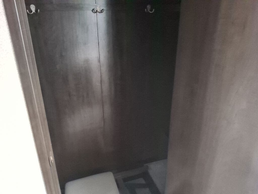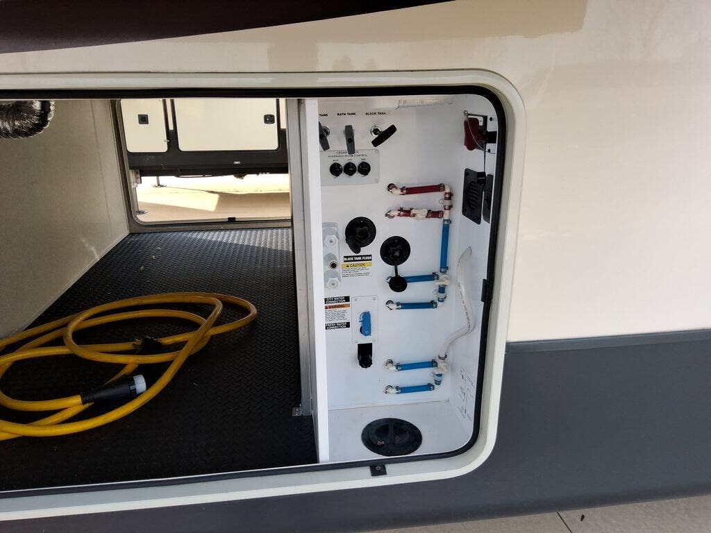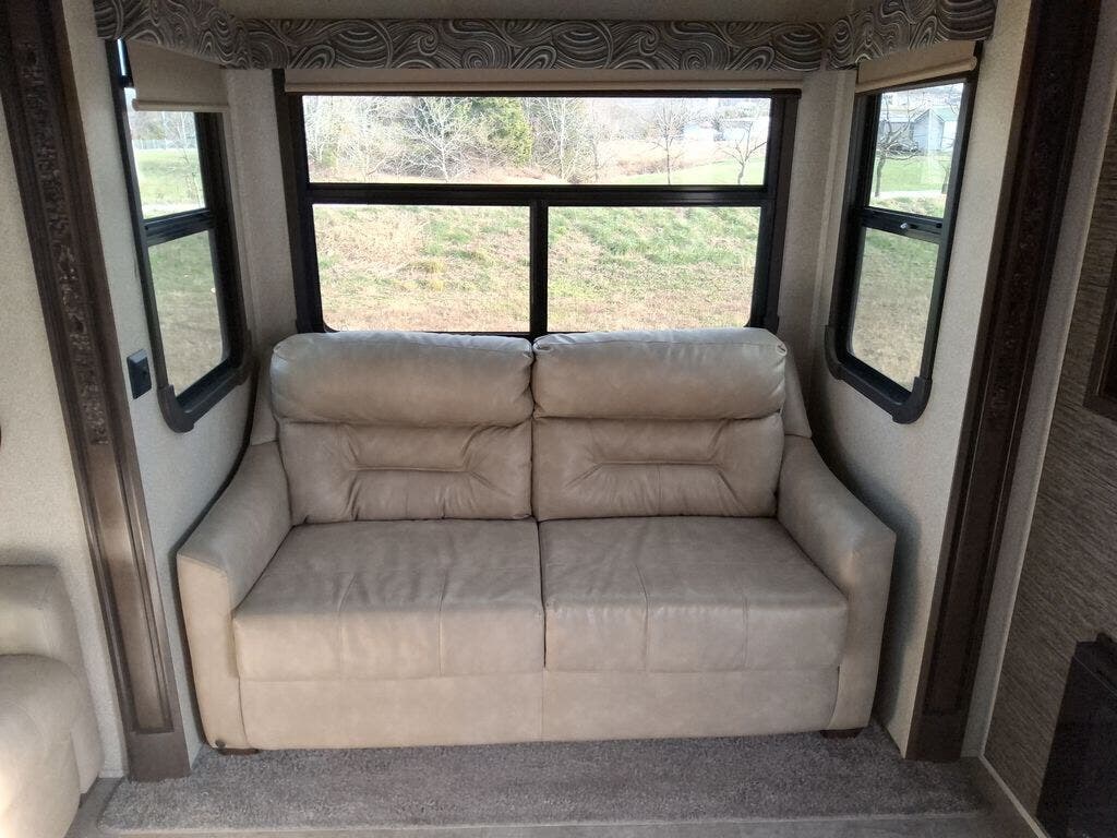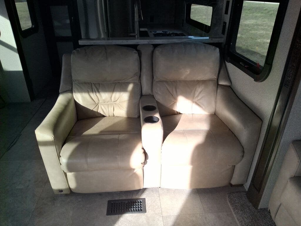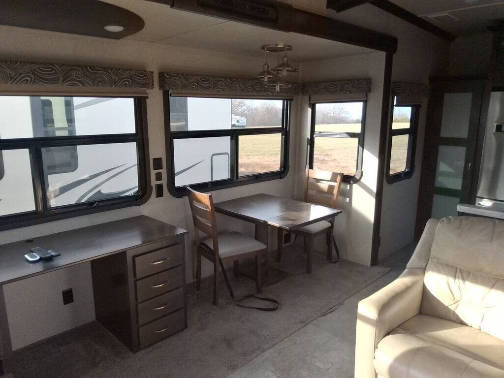 The chef in the family will love the rear kitchen offering lots of counter space and everything needed to stay fed for days thanks to the 20 cu. ft. refrigerator with icemaker, and the pantry. And there is an optional exterior pull-out kitchen with TV option if you would like to add that feature for future use. You can dine at the free standing dinette with four chairs, and complete some work at the desk with great views of your campsite out of the windows. The living area offers a hide-a-bed sofa and power theater seats, plus a fireplace. There is a half bath with a prepped space for a washer and dryer if you add those appliances. You can walk-through the master bedroom to find a residential style headboard and luxurious bedding decor, USB plug-ins on each side of the king bed, a dresser and a sliding bathroom door. The front full bathroom offers a large wardrobe with shelves, a double basin, trough sink, and a seated shower, you may never want to leave.