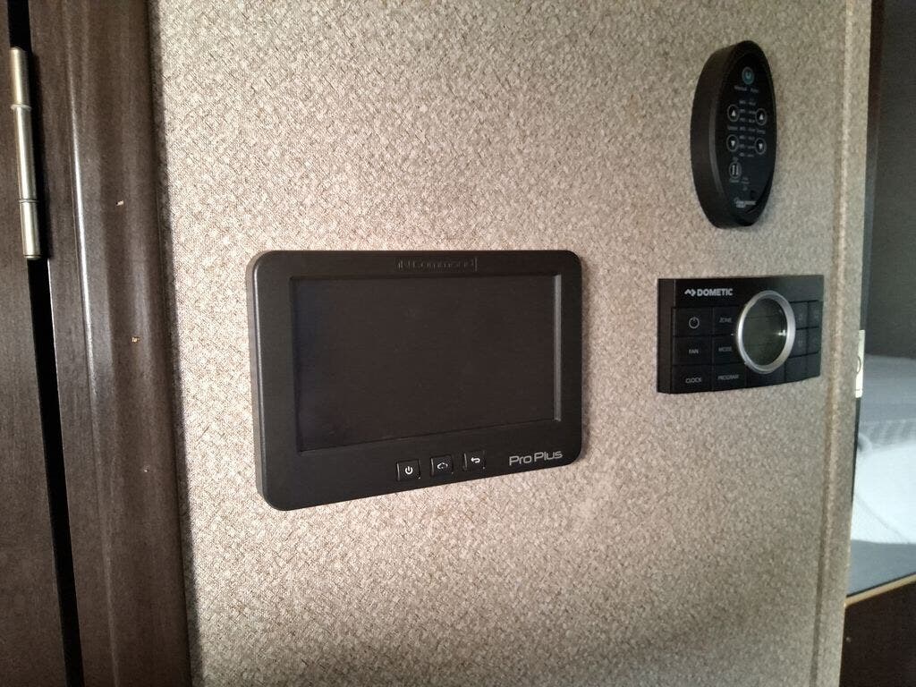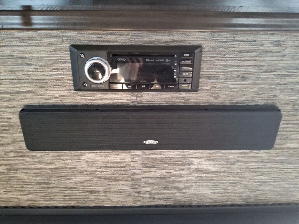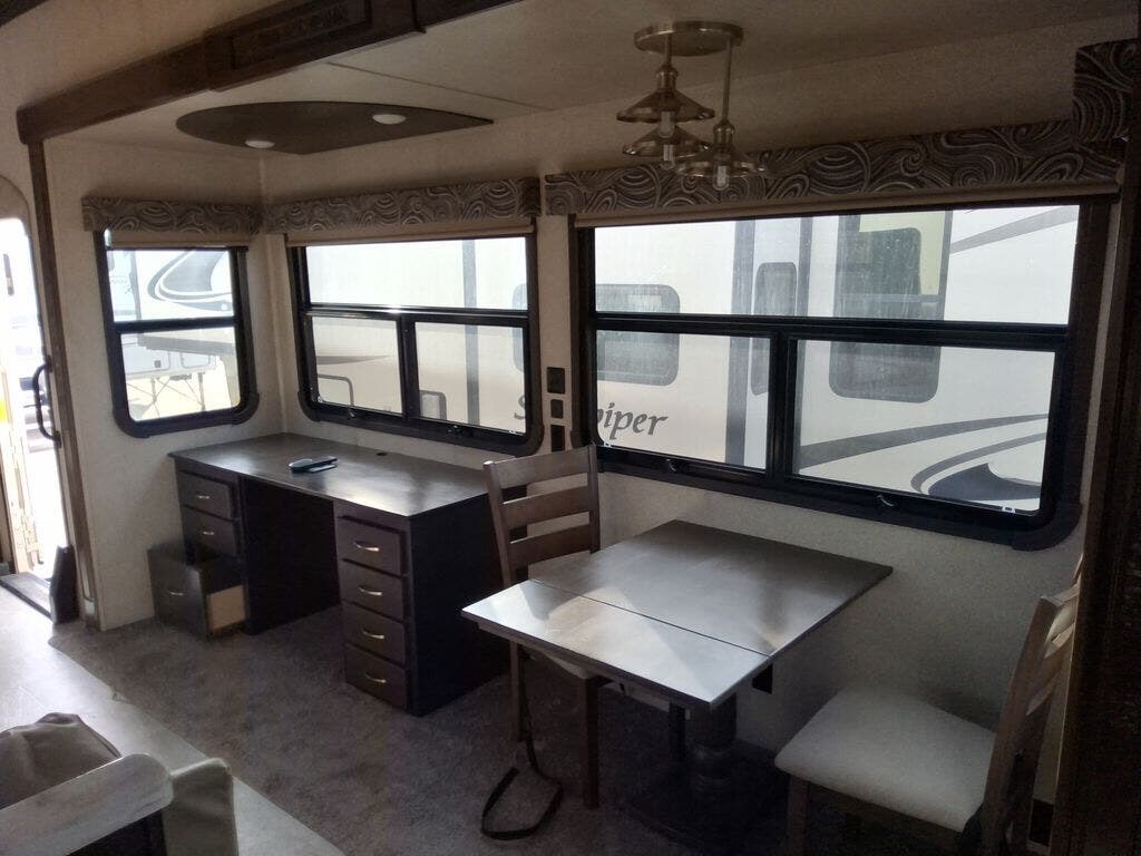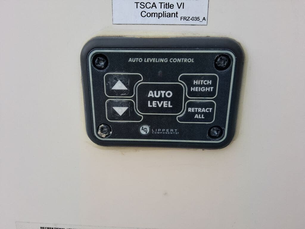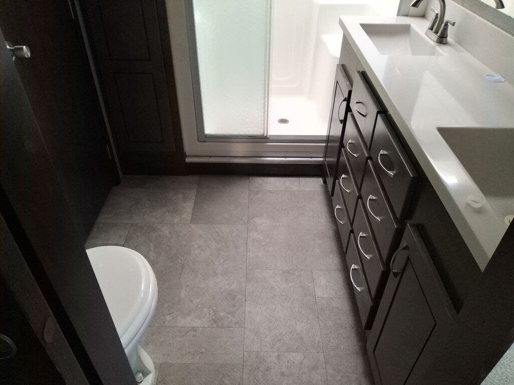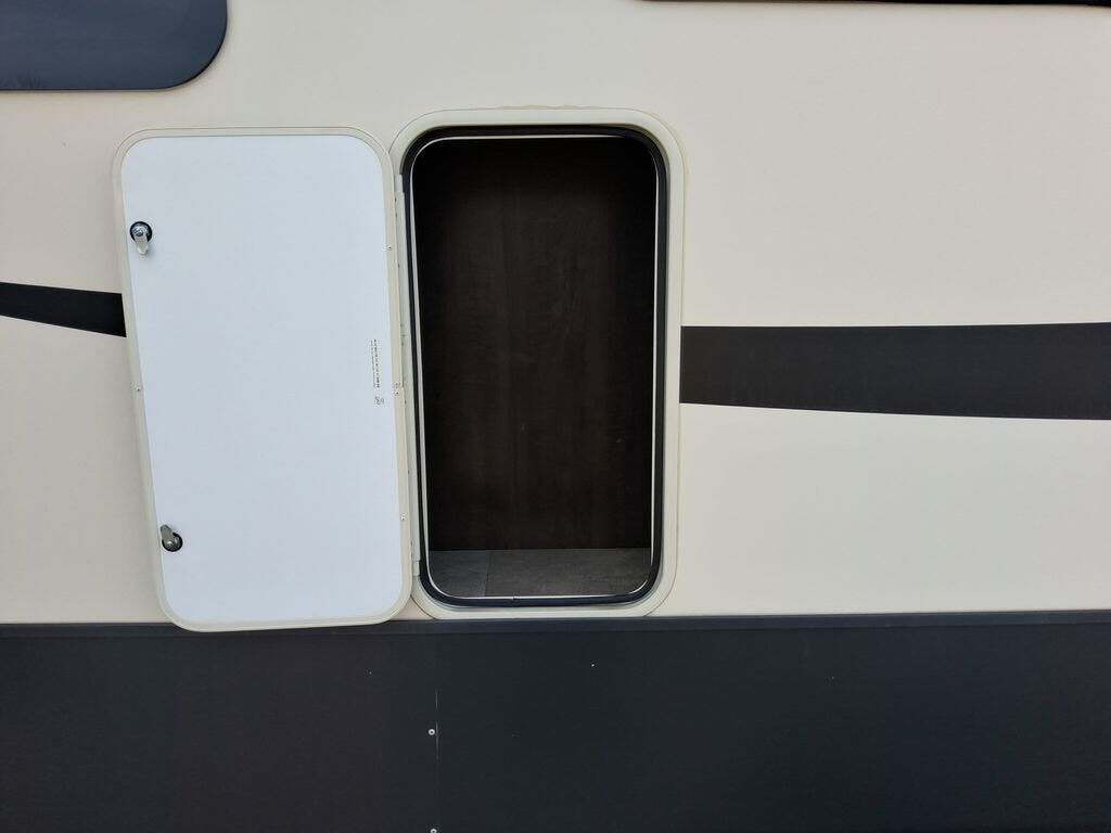 The chef in the family will love the rear kitchen offering lots of counter space and everything needed to stay fed for days thanks to the 20 cu. ft. refrigerator with icemaker, and the pantry. And there is an optional exterior pull-out kitchen with TV option if you would like to add that feature for future use. You can dine at the free standing dinette with four chairs, and complete some work at the desk with great views of your campsite out of the windows. The living area offers a hide-a-bed sofa and power theater seats, plus a fireplace. There is a half bath with a prepped space for a washer and dryer if you add those appliances. You can walk-through the master bedroom to find a residential style headboard and luxurious bedding decor, USB plug-ins on each side of the king bed, a dresser and a sliding bathroom door. The front full bathroom offers a large wardrobe with shelves, a double basin, trough sink, and a seated shower, you may never want to leave.