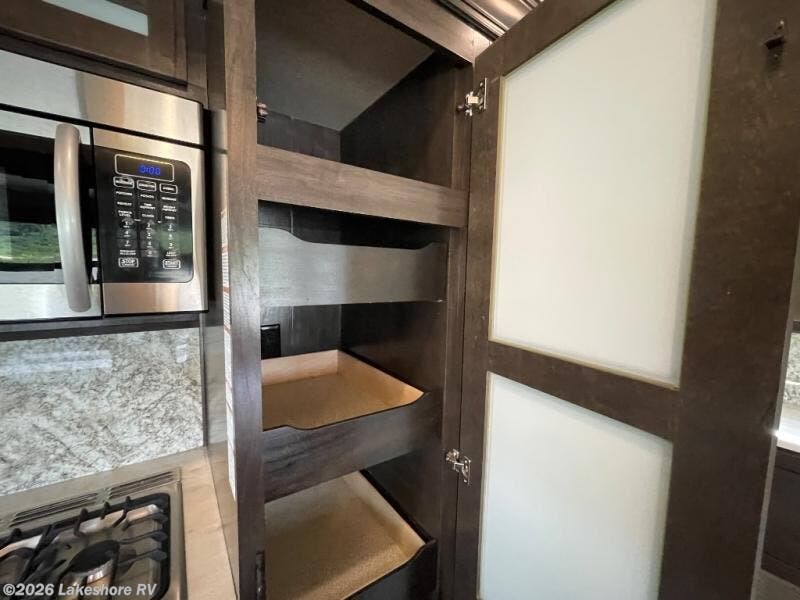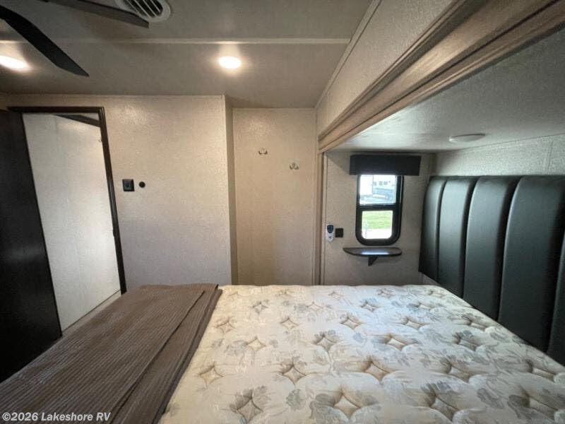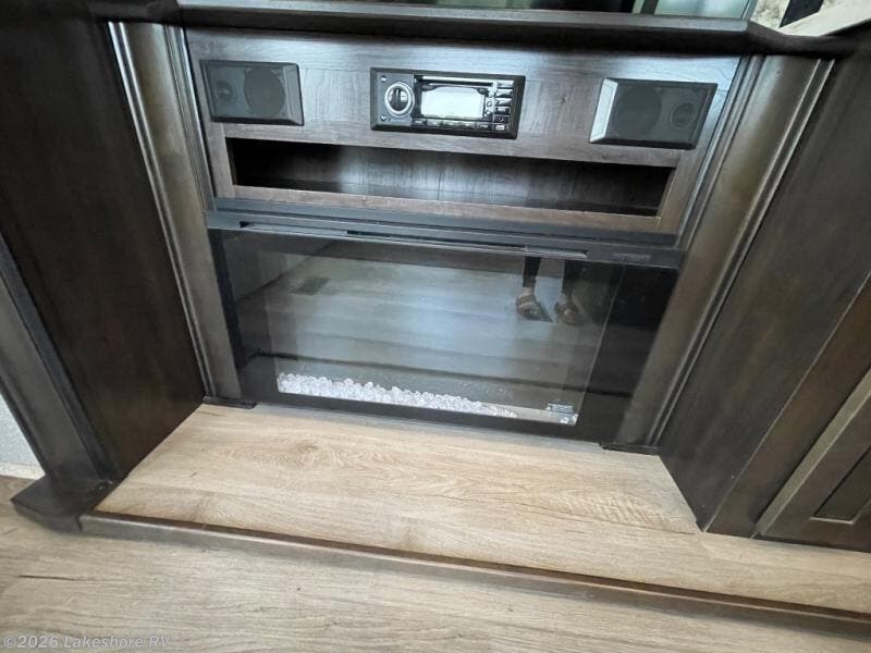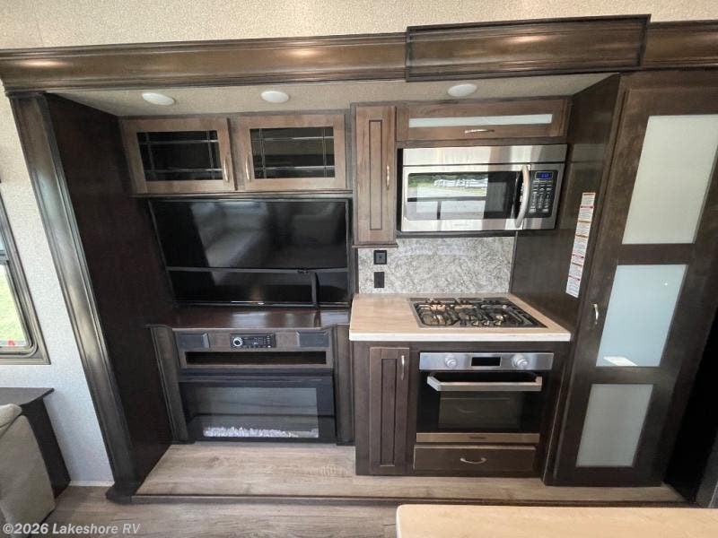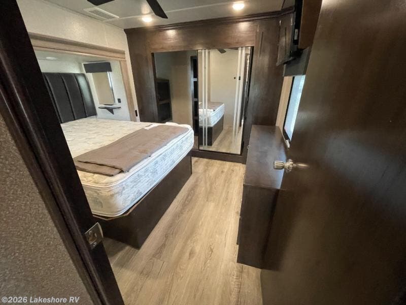 Step inside to a bright, inviting living area with theater seating, a tri-fold sofa, LED TV, and fireplace. The fully equipped kitchen boasts a center island, solid surface countertops, full-size appliances, pantry, and plenty of storage—perfect for preparing meals on the road. The master bedroom offers a king bed, wardrobe, and dresser, while the bathroom features a residential-style walk-in shower and ample linen storage.