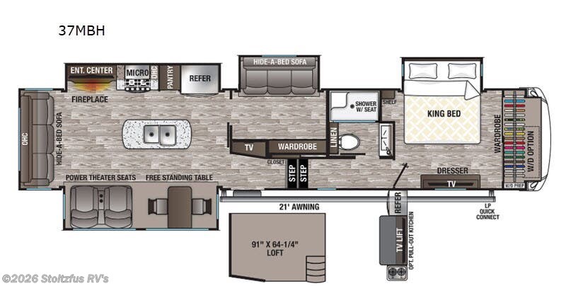 With two private bedrooms plus a loft your whole family will enjoy their next camping trip in style and comfort with this four slide out Cedar Creek Silverback fifth wheel 37MBH by Forest River. Come kick back and relax in the rear living area. You can easily watch TV on the 50” TV, plus below there is an electric fireplace. Fixing meals for your family is a breeze in this kitchen. You will find an island with a double sink and plenty of amenities such as a 20 cu. ft. stainless steel electric refrigerator, a spacious pantry, a 24" gas range, and a 30” over-the-range microwave. Just off of the kitchen is the second bedroom where you can easily sleep two people. In the hallway at the top of the stairs there is another set of steps which leads to the loft which will be a fun hang out spot for your kids. When mom and dad are ready to turn in for the night come do so on the king bed slide out in the front private bedroom. There is also plenty of storage space with a dresser and a large front wardrobe, plus so much more!